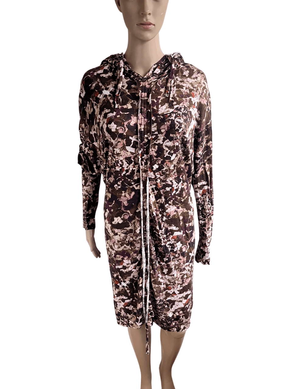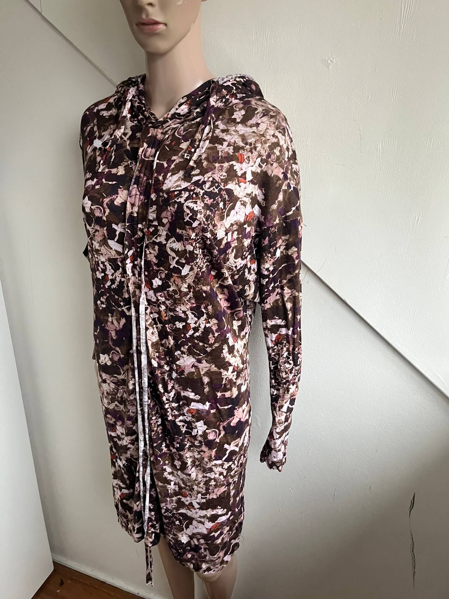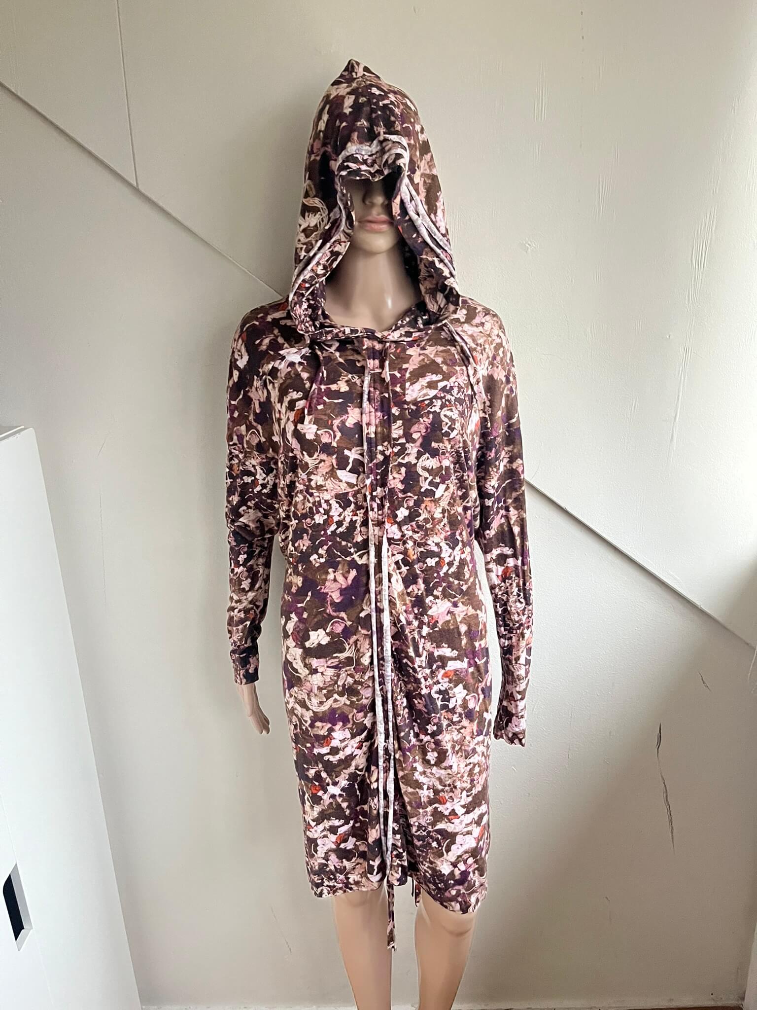 Middellange jurk met capuchon / hoodie in de maat 38, de jurk heeft een drukke bruine witte en paarse print. Oksellengte 50 cm en lengte 86 cm.