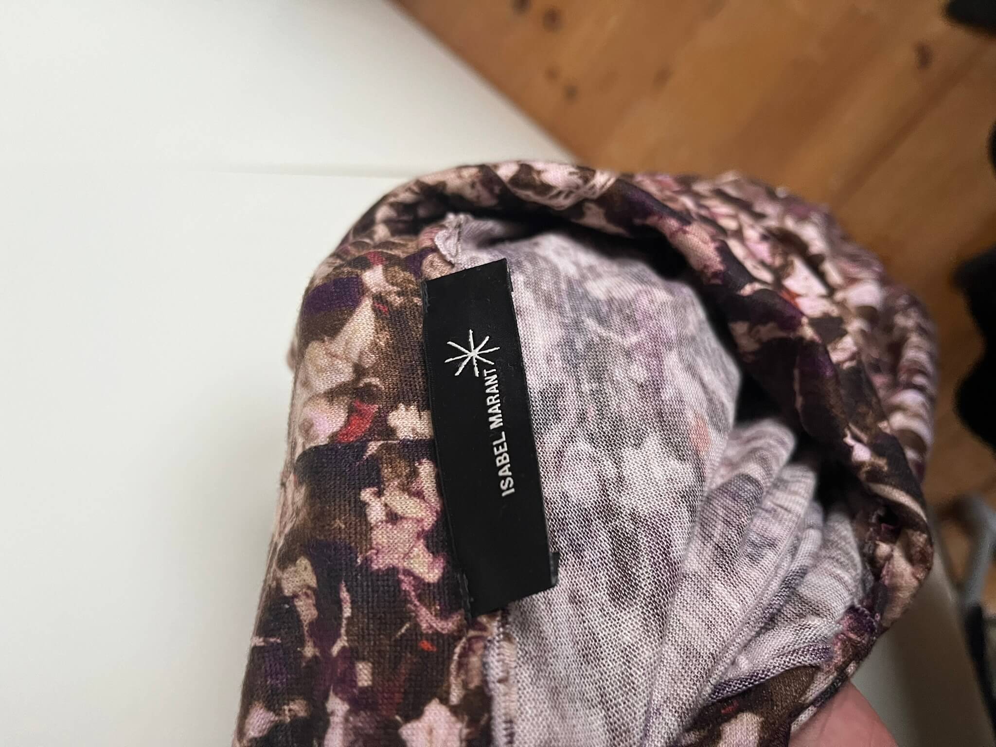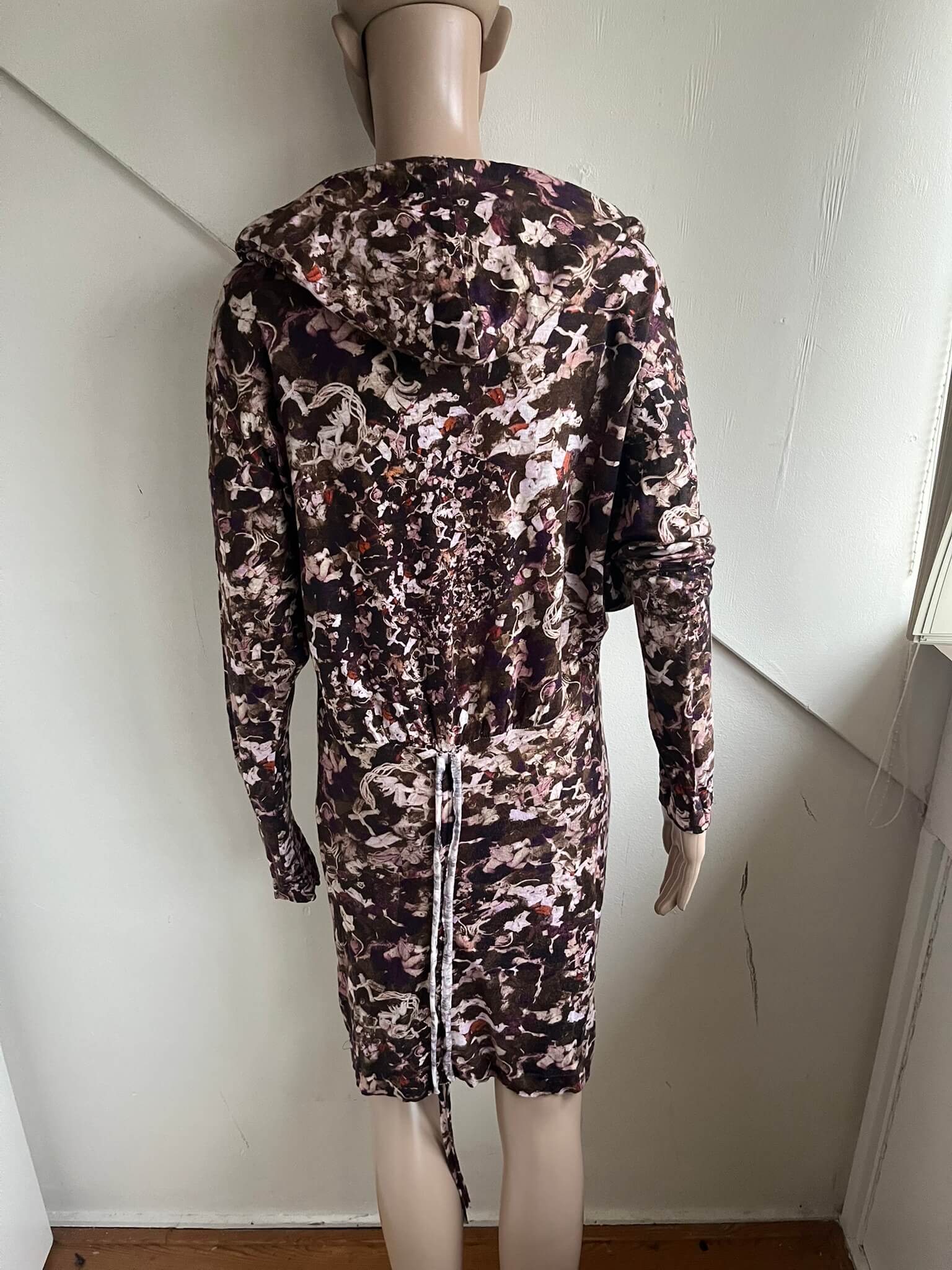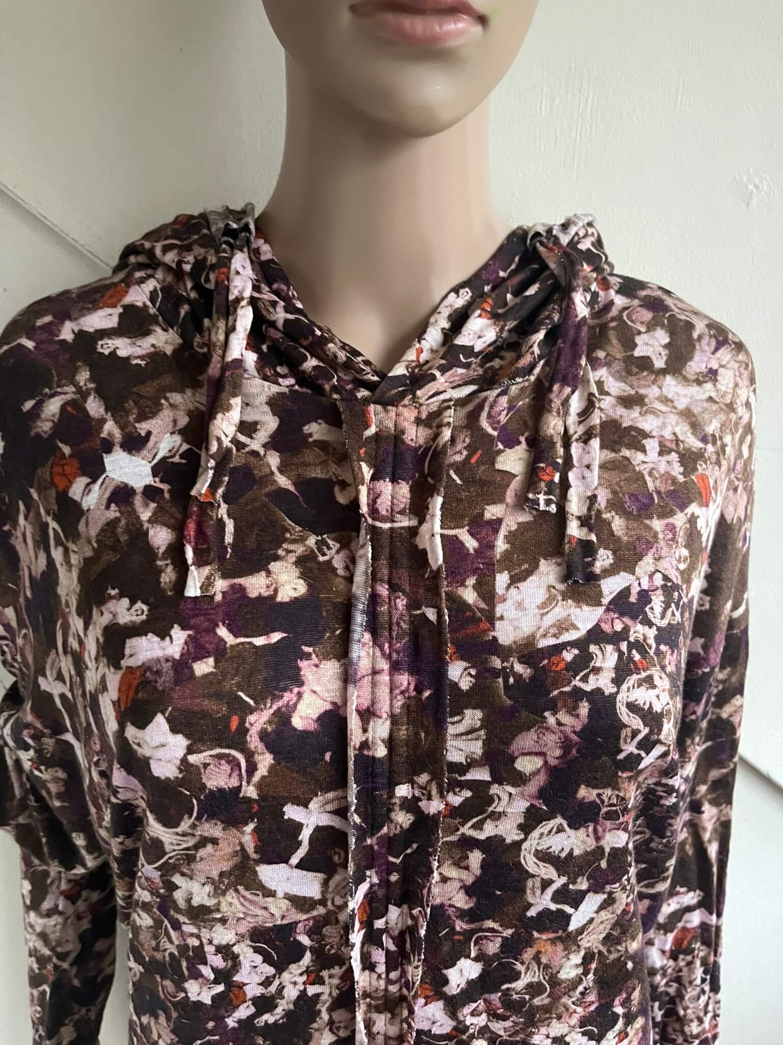 Middellange jurk met capuchon / hoodie in de maat 38, de jurk heeft een drukke bruine witte en paarse print. Oksellengte 50 cm en lengte 86 cm.