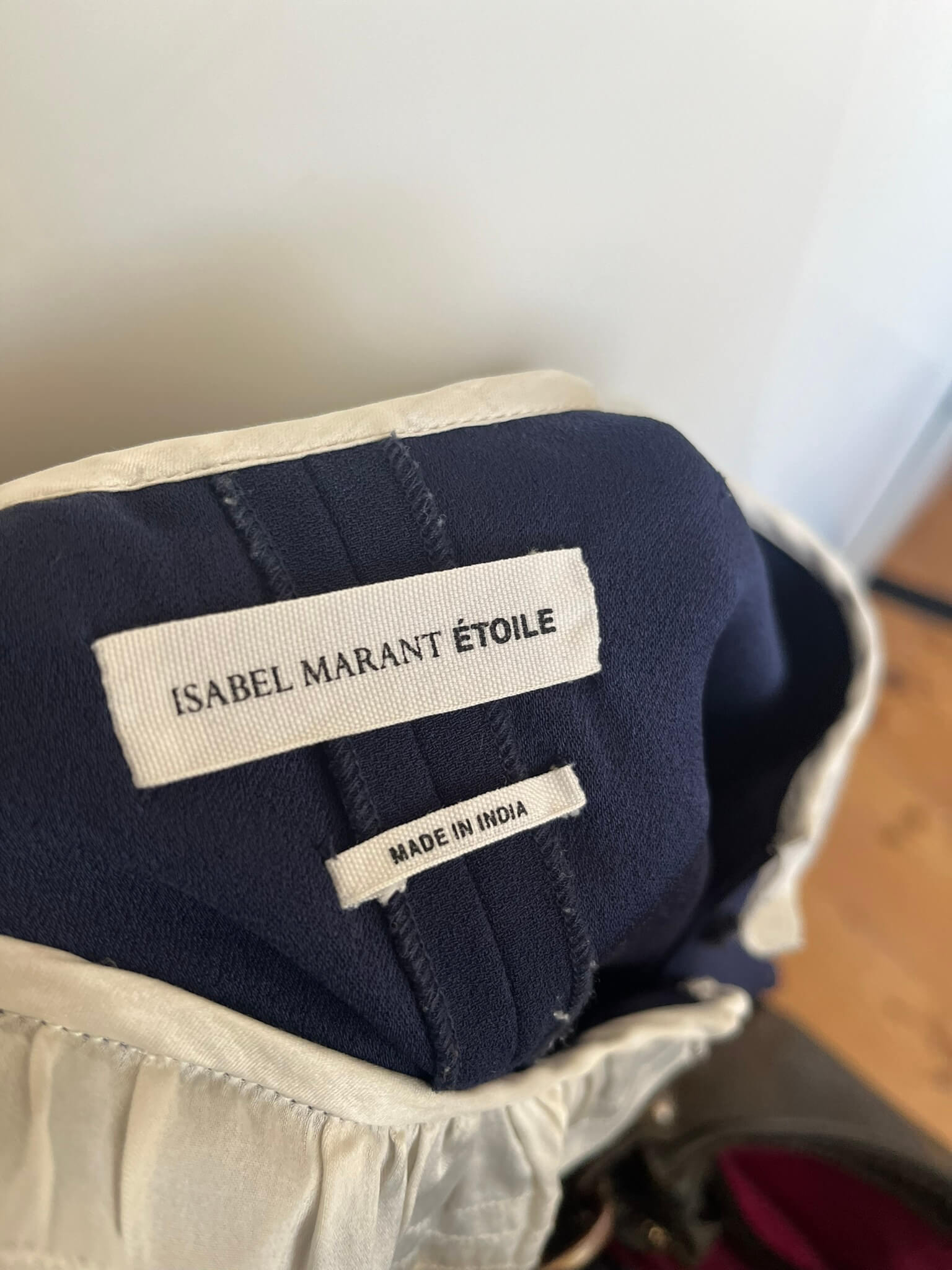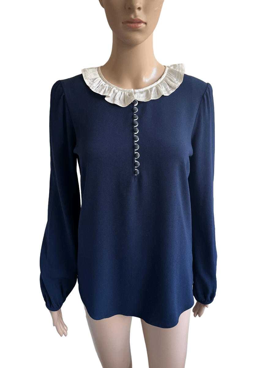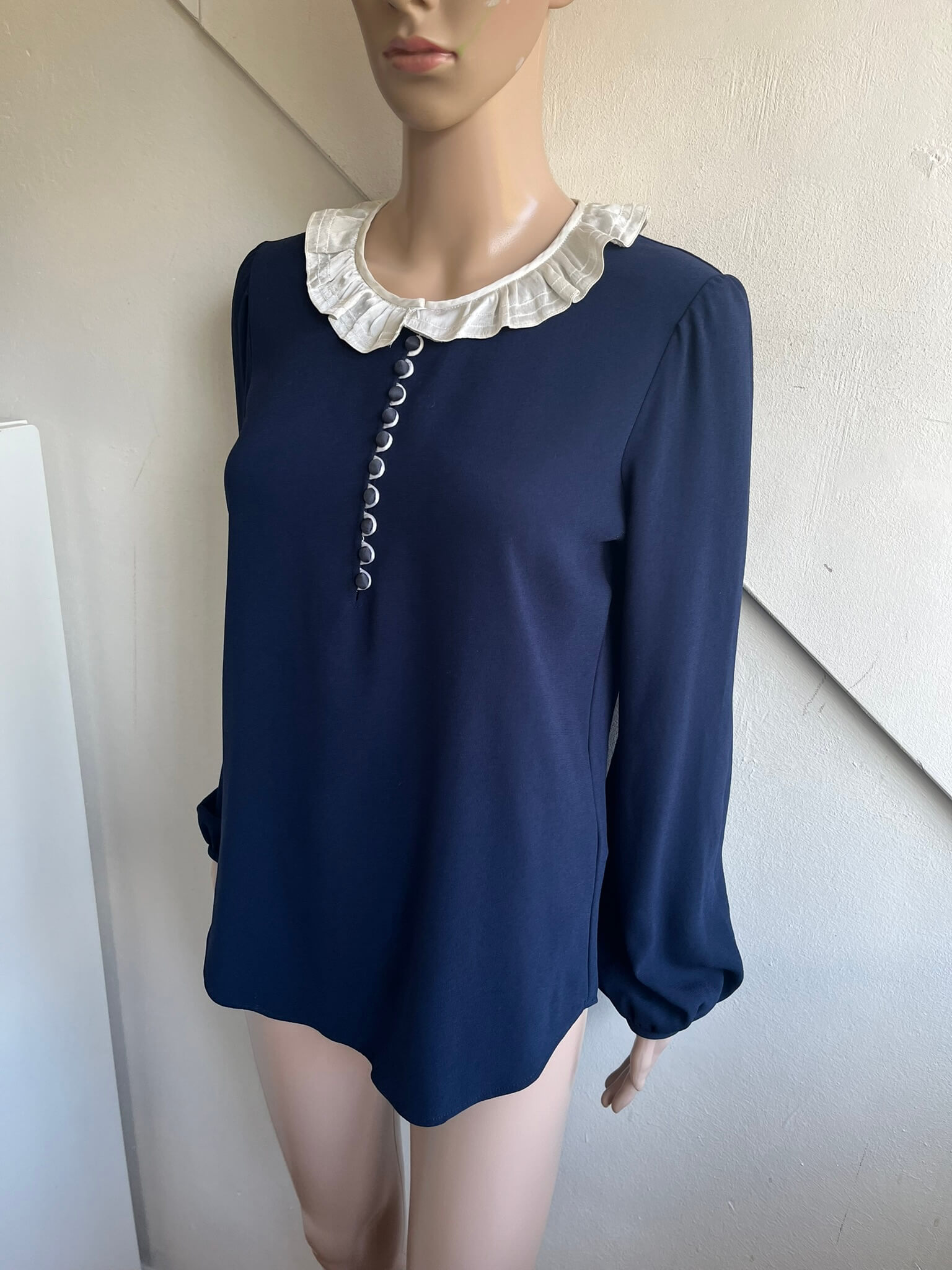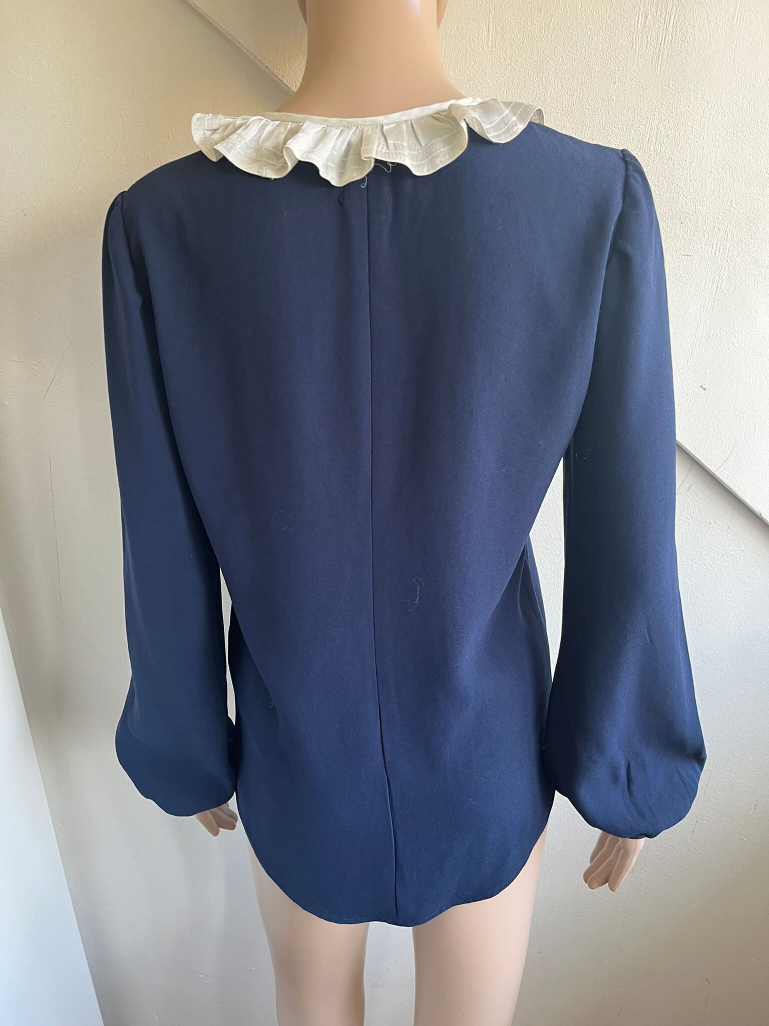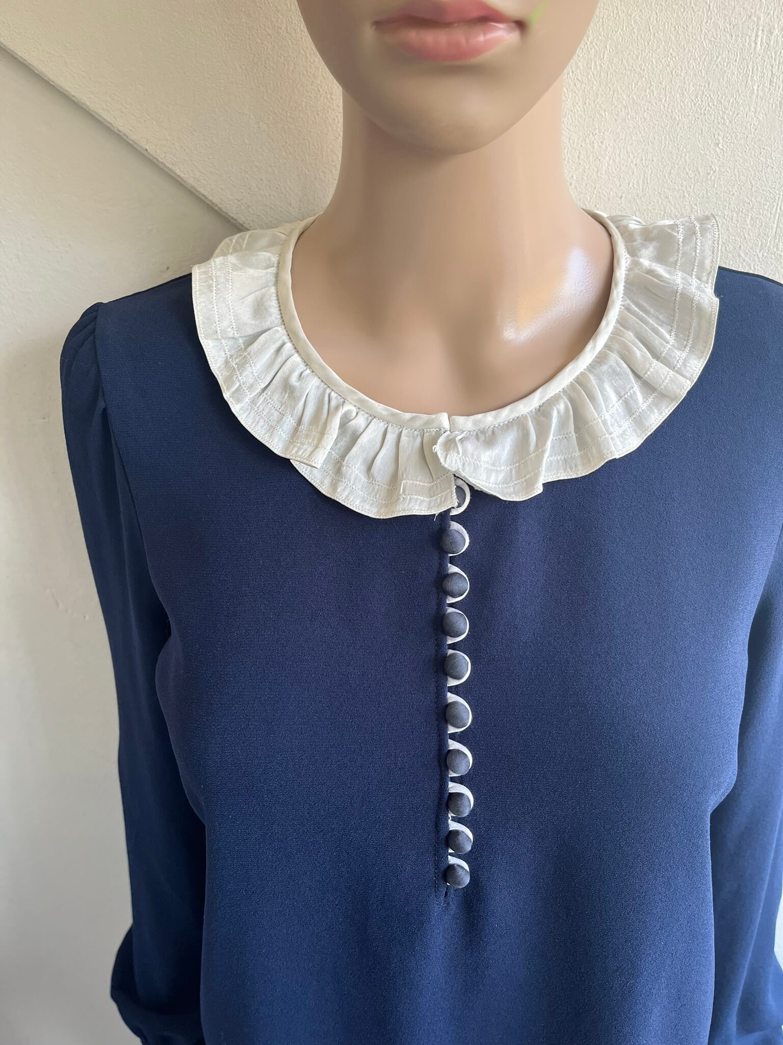 Donkerblauwe top met lange mouwen en knoopjes en een zijden witte kraag in de Franse maat 40= maat 38. Gemaakt van acetate en polyester en de kraag van zijde. Oksellengte 49 cm en lengte 69 cm.