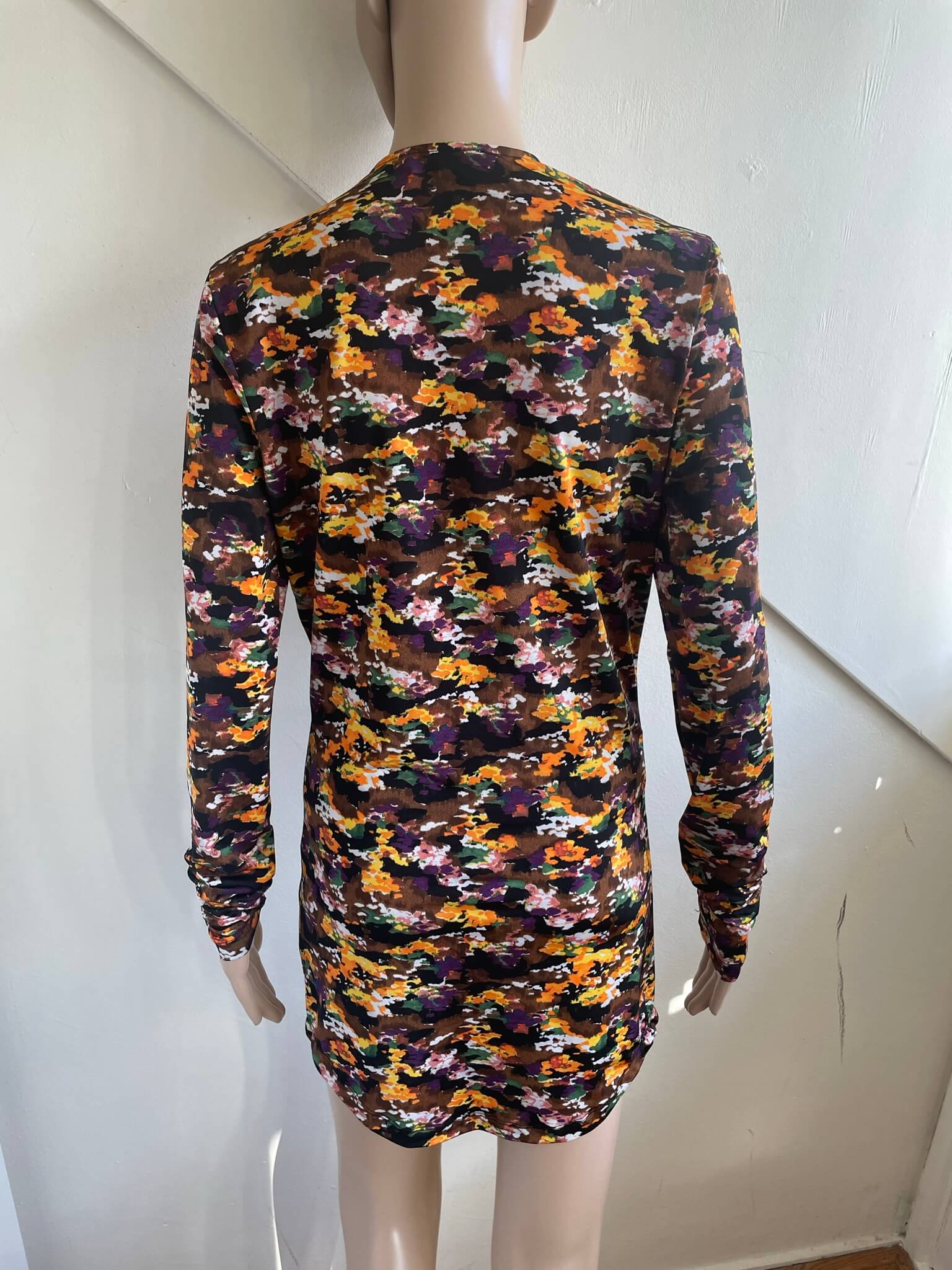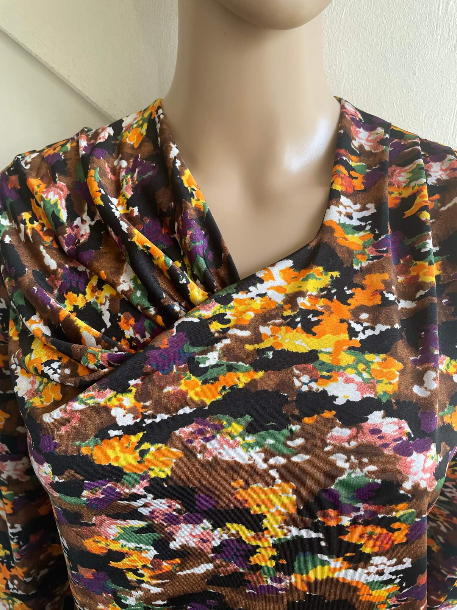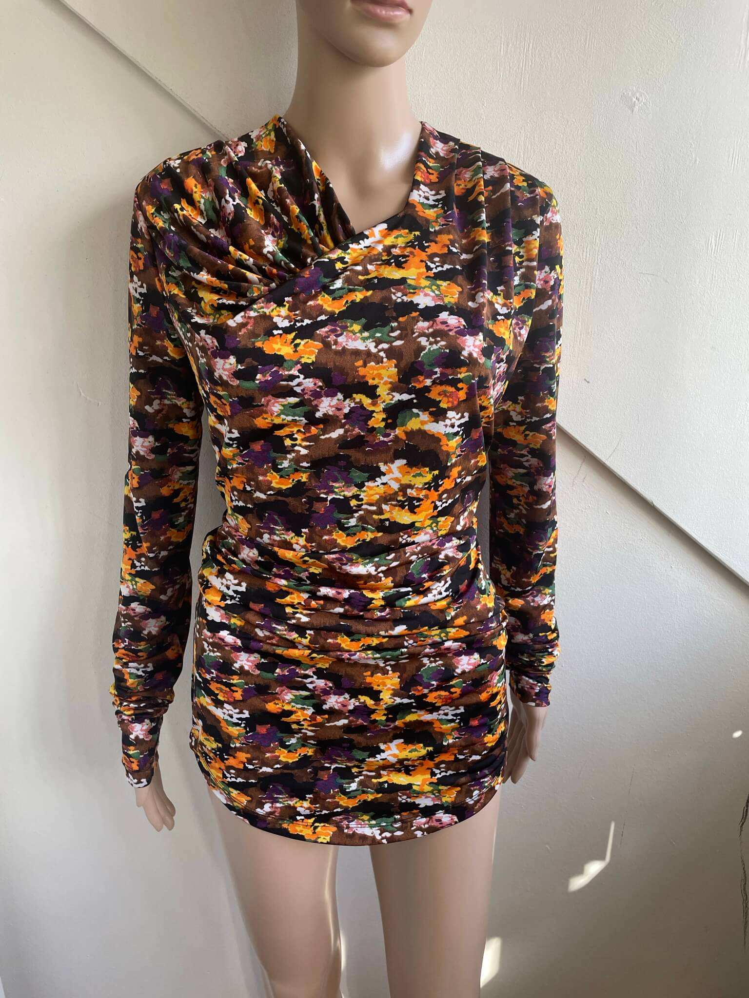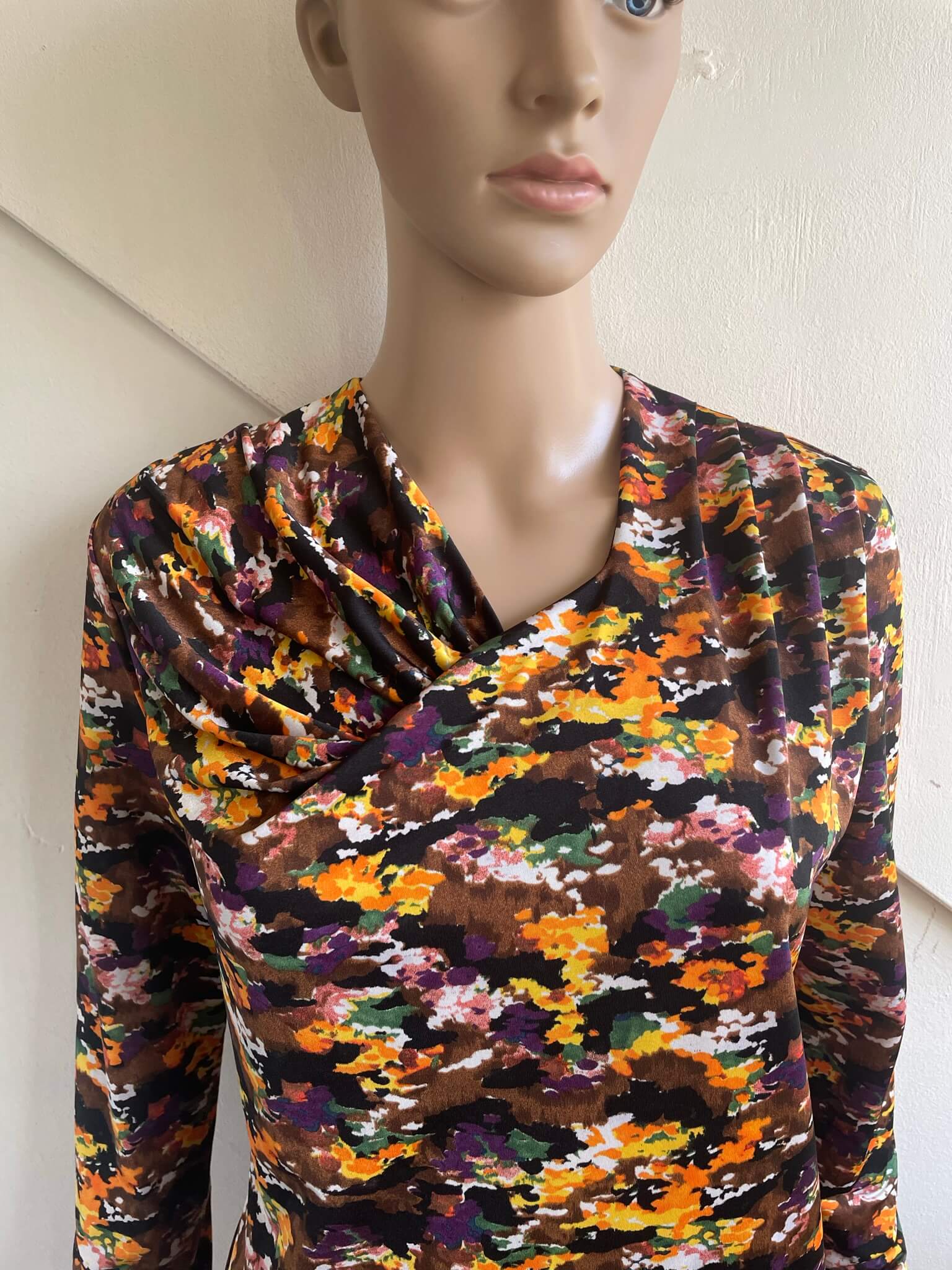 Mooie lange top met lange mouwen of tuniek in de maat S. De top heeft een mooie asymmetrische halslijn en een print in oranje bruin paars zwart / herfstkleuren . Gemaakt van een gladde niet kreukende stof. (Polyester en elastane ) . De top is in nieuwstaat .