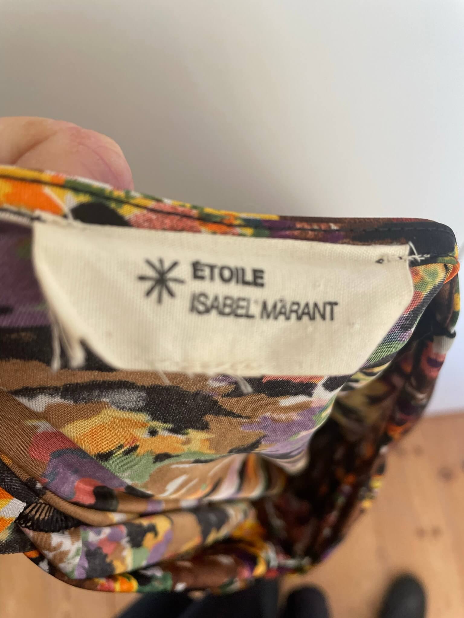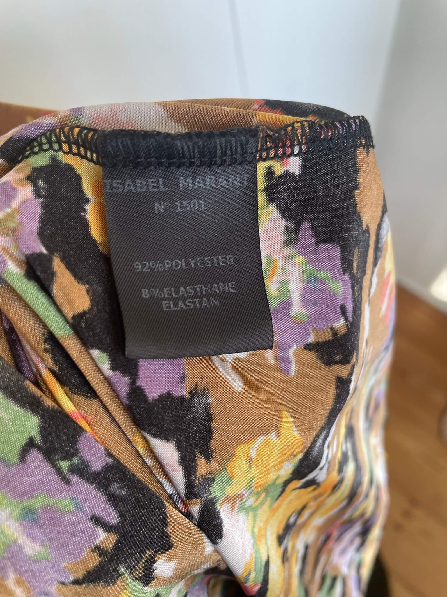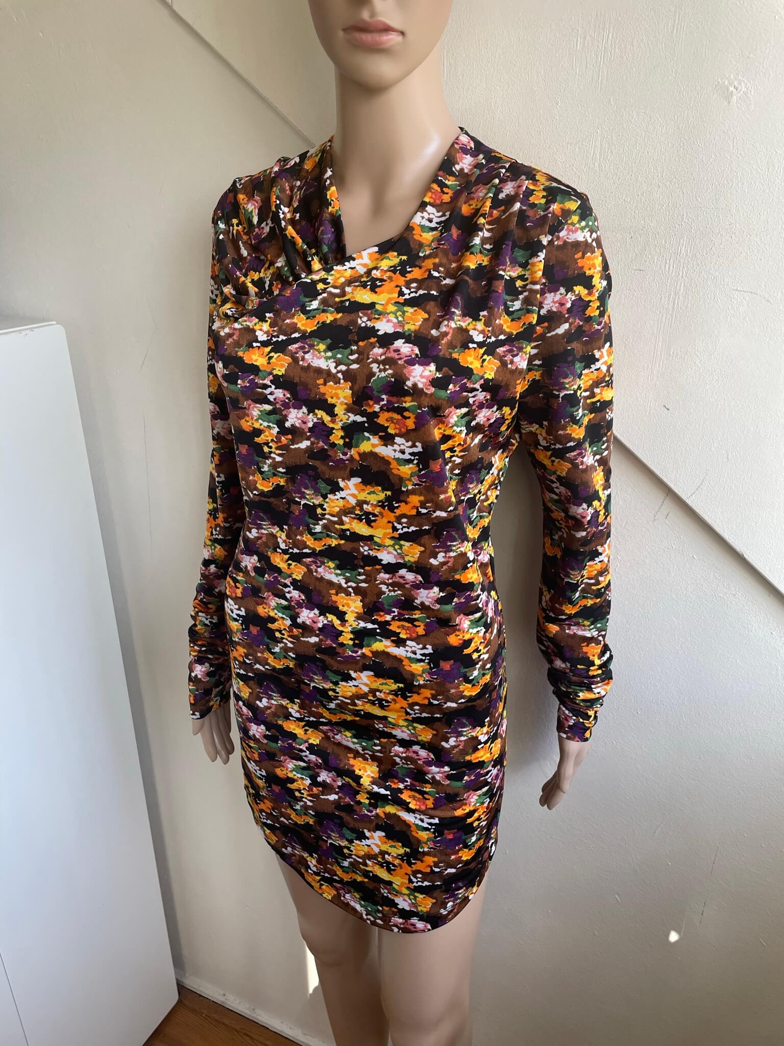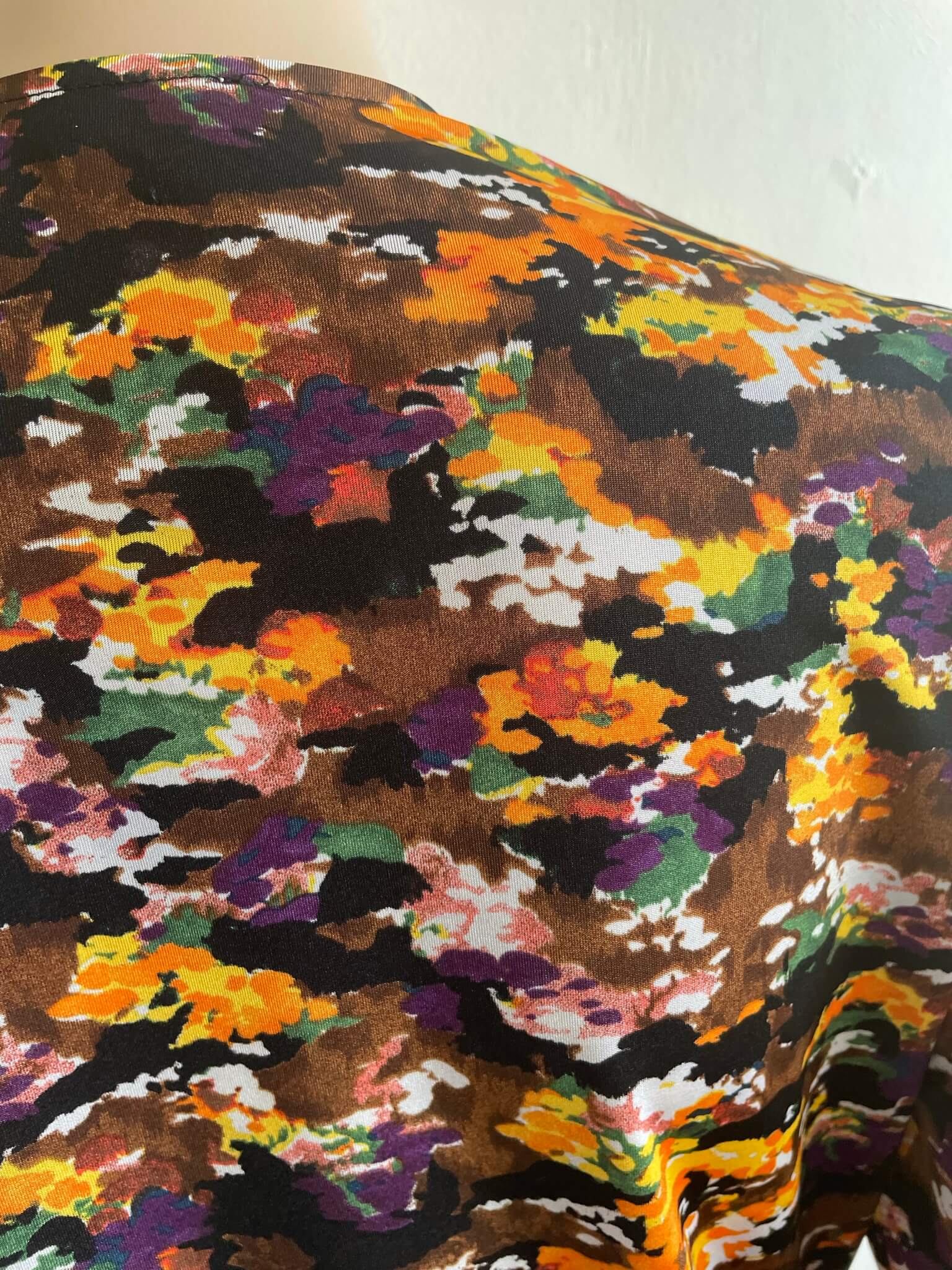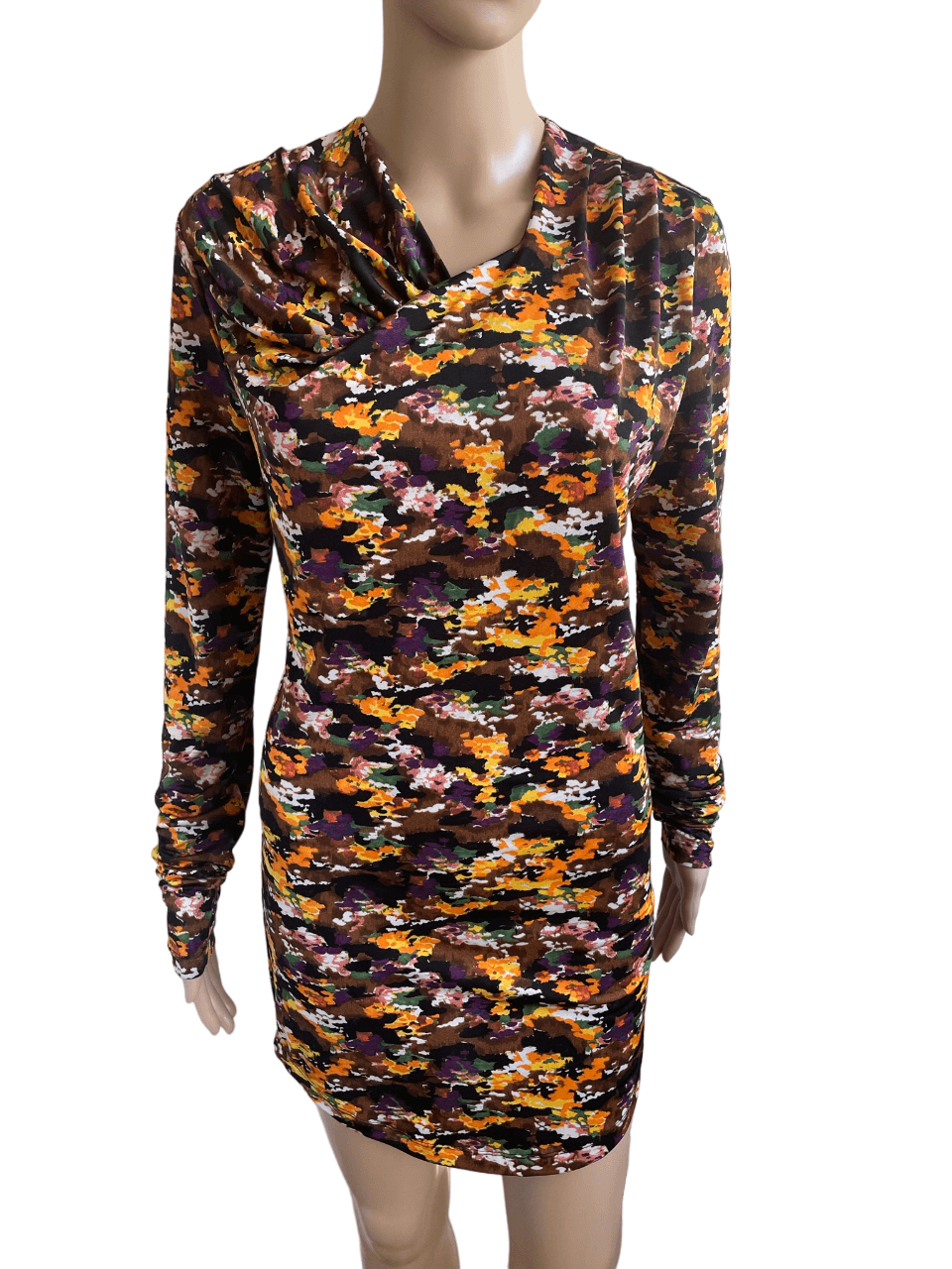 Mooie lange top met lange mouwen of tuniek in de maat S. De top heeft een mooie asymmetrische halslijn en een print in oranje bruin paars zwart / herfstkleuren . Gemaakt van een gladde niet kreukende stof. (Polyester en elastane ) . De top is in nieuwstaat .