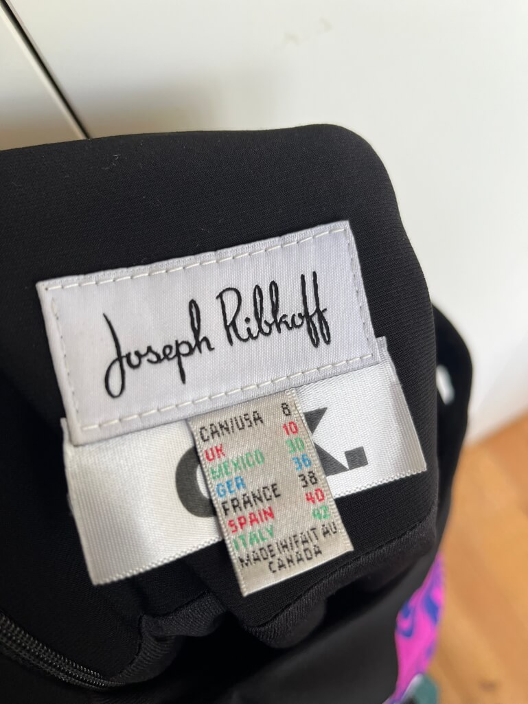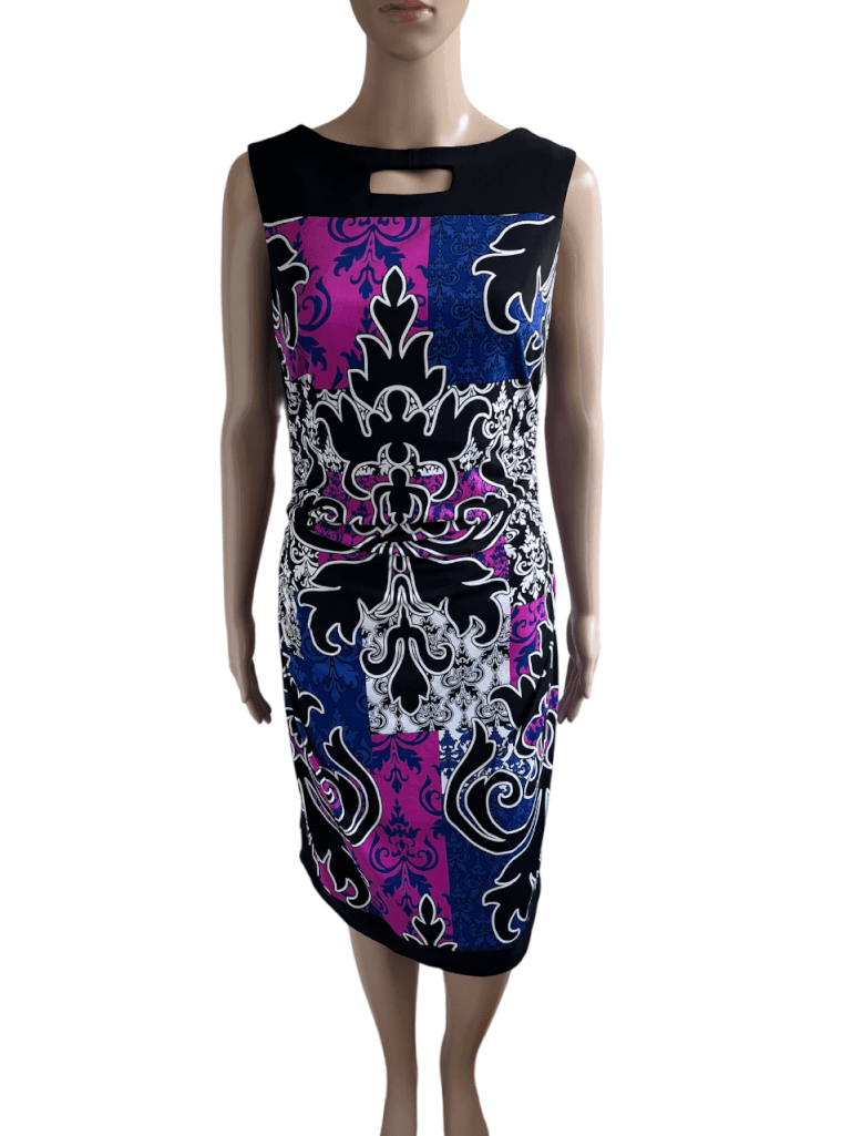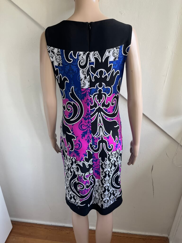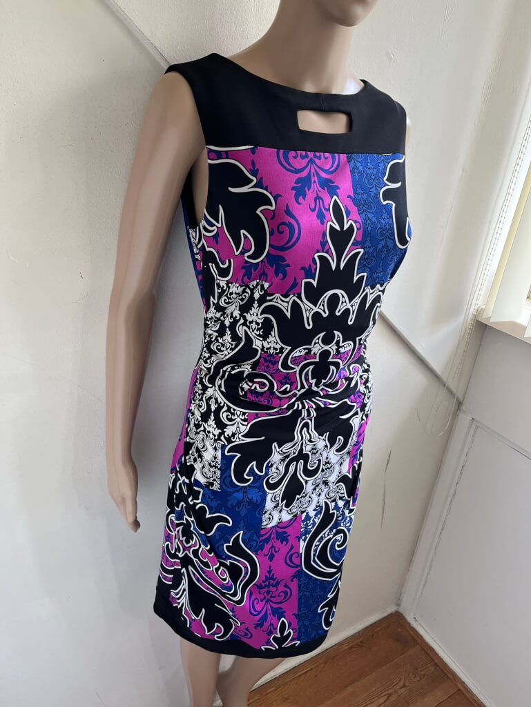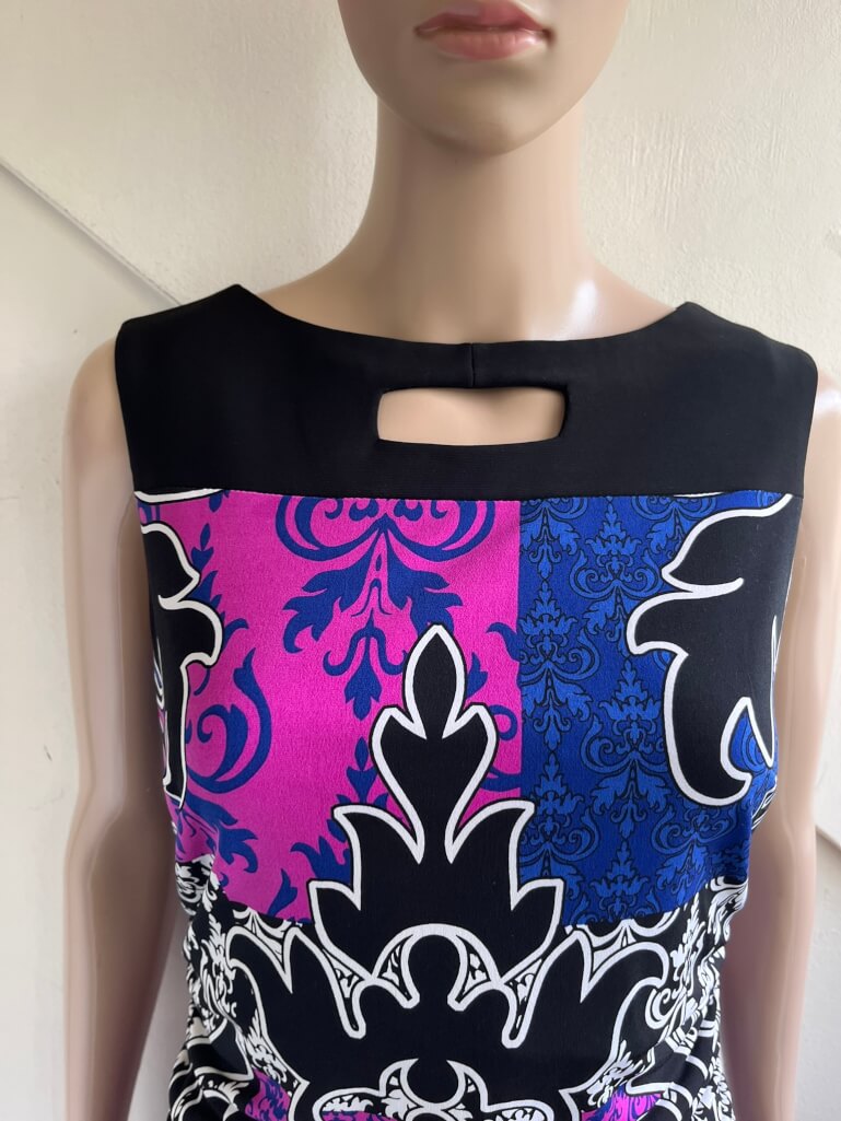 Mooie zwarte jurk met een print in prachtige kleuren, roze blauw, in de maat 36. Oksellengte 43 cm en lengte 95 cm.