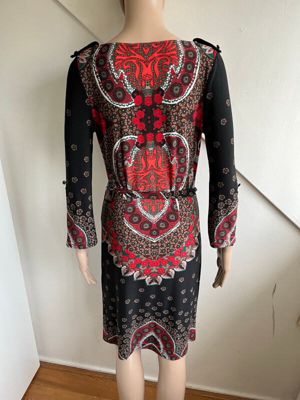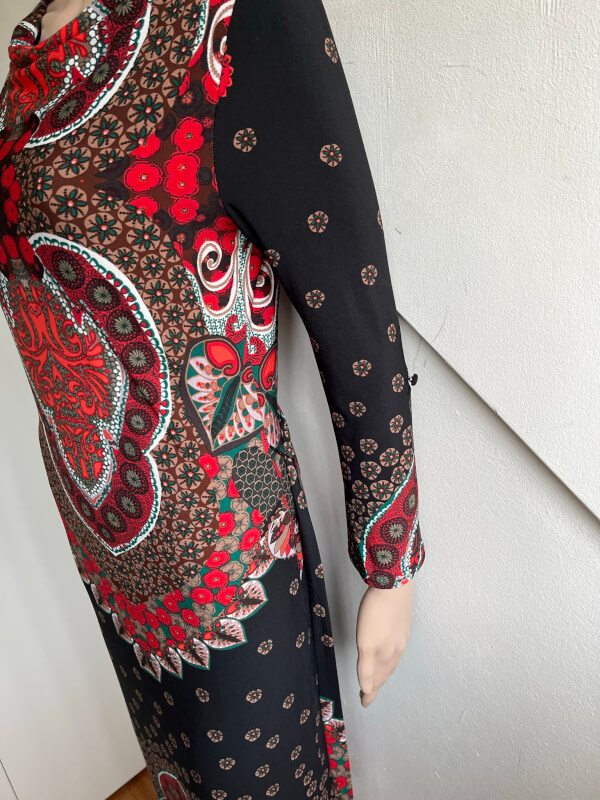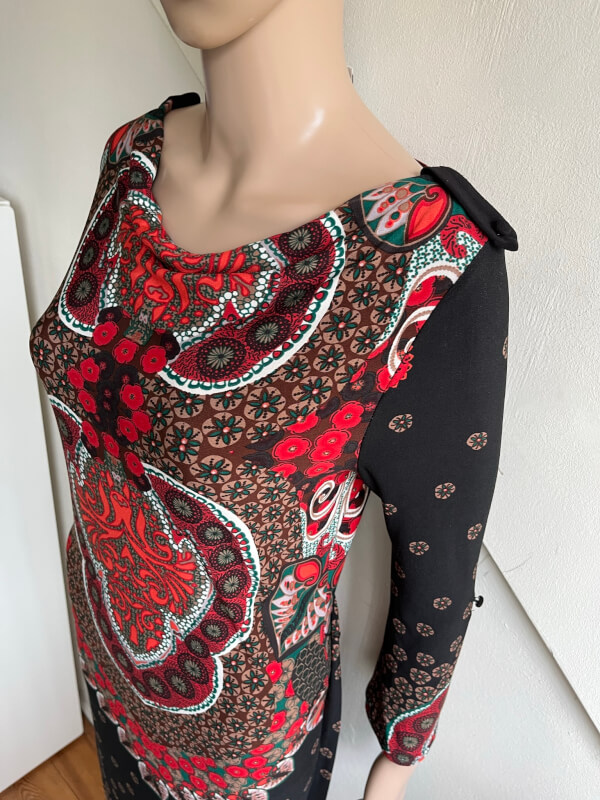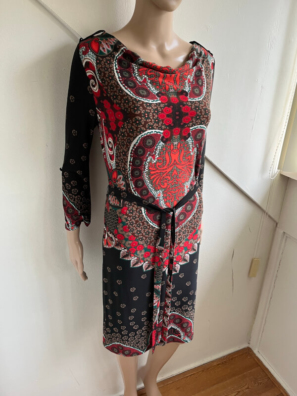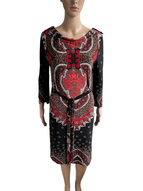 Jurk met rood zwart wit bruine print en een losse riem in hetzelfde materiaal en zelfde print. De maat is xs maar valt wel iets ruimer want oksellengte is 47 cm en lengte 92 cm. De jurk heeft een lichte watervalkraag. De jurk is gemaakt van soepel niet kreukend materiaal . Helaas ontbreekt het waslabel.
