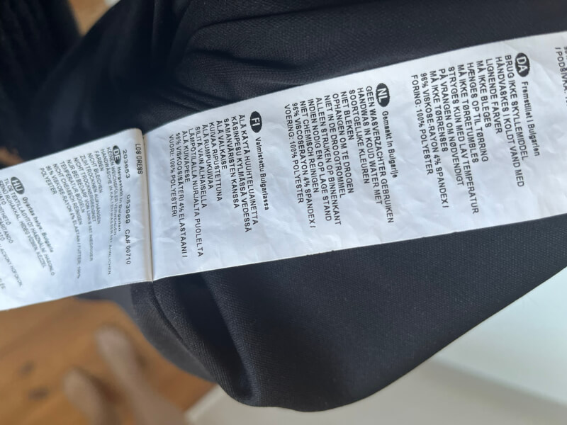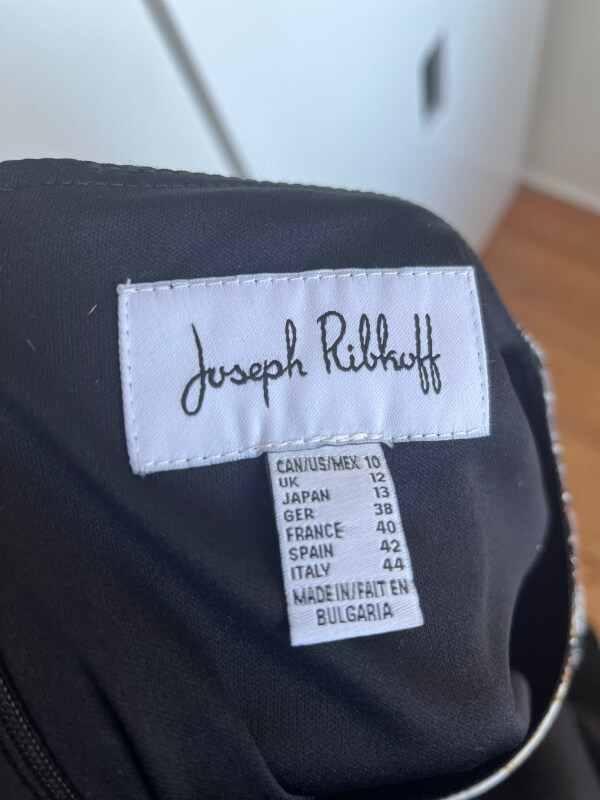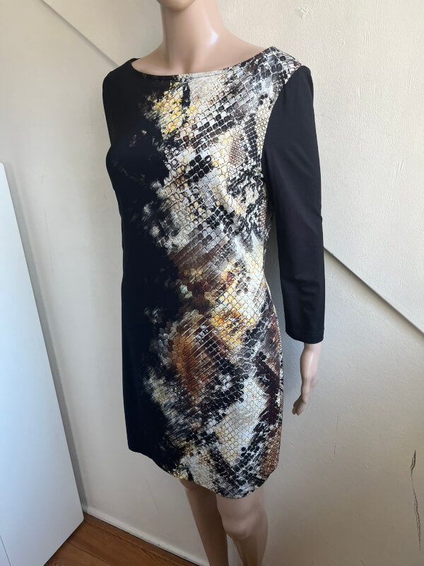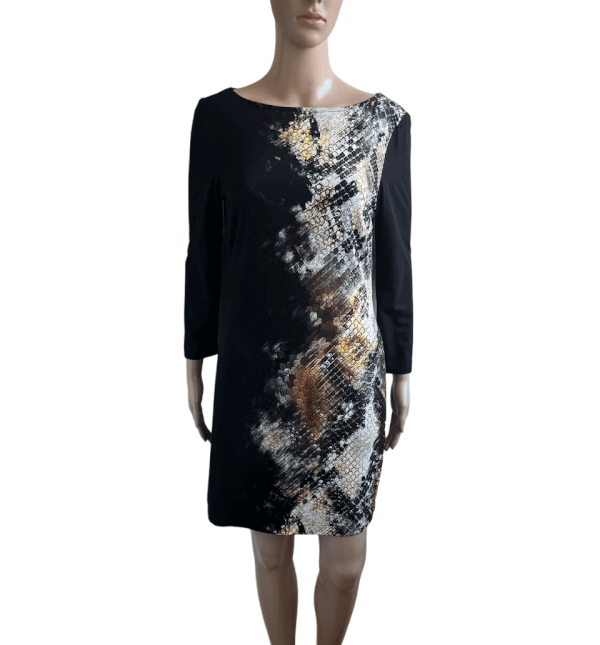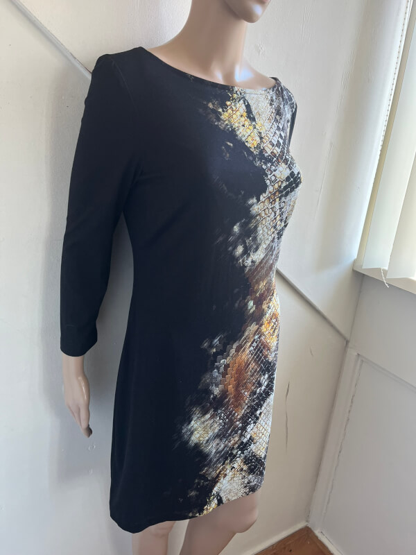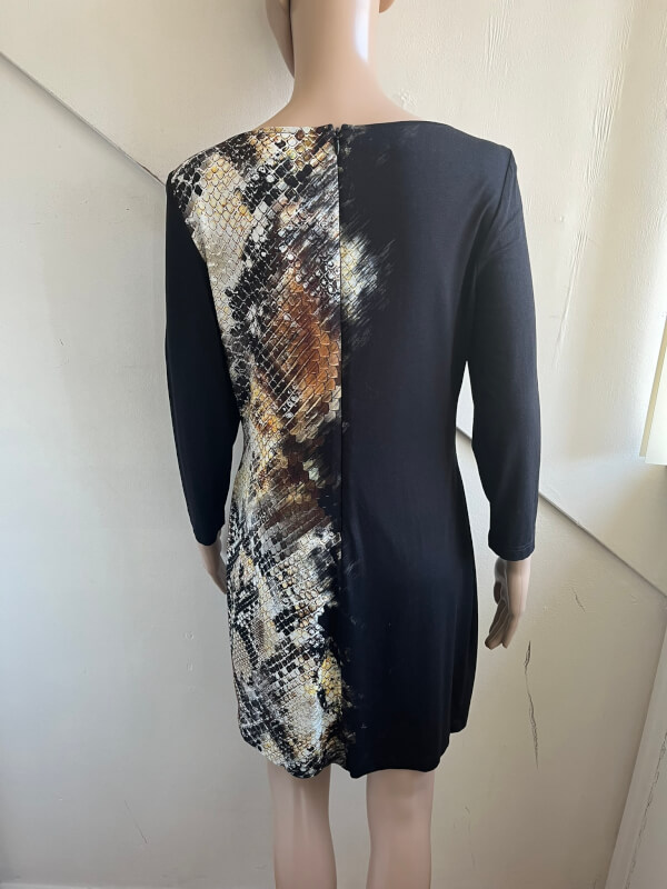 Middellange zwarte jurk met bruin wit zwarte print in de maat 38. De jurk heeft een rits aan de achterzijde . Gemaakt van viscose spandex en polyester. Oksellengte 47 cm en lengte 86 cm. Het valt dus smal.
