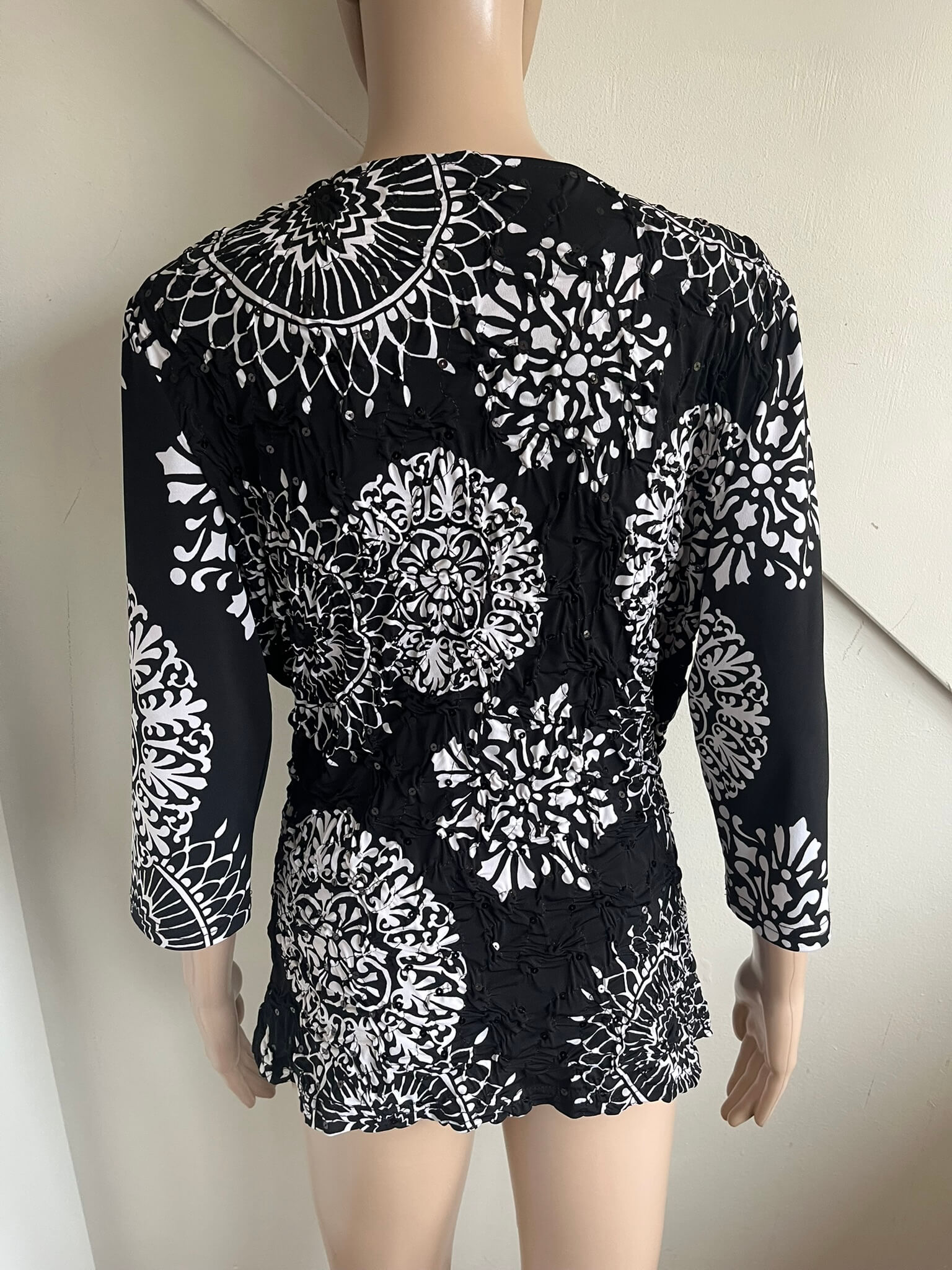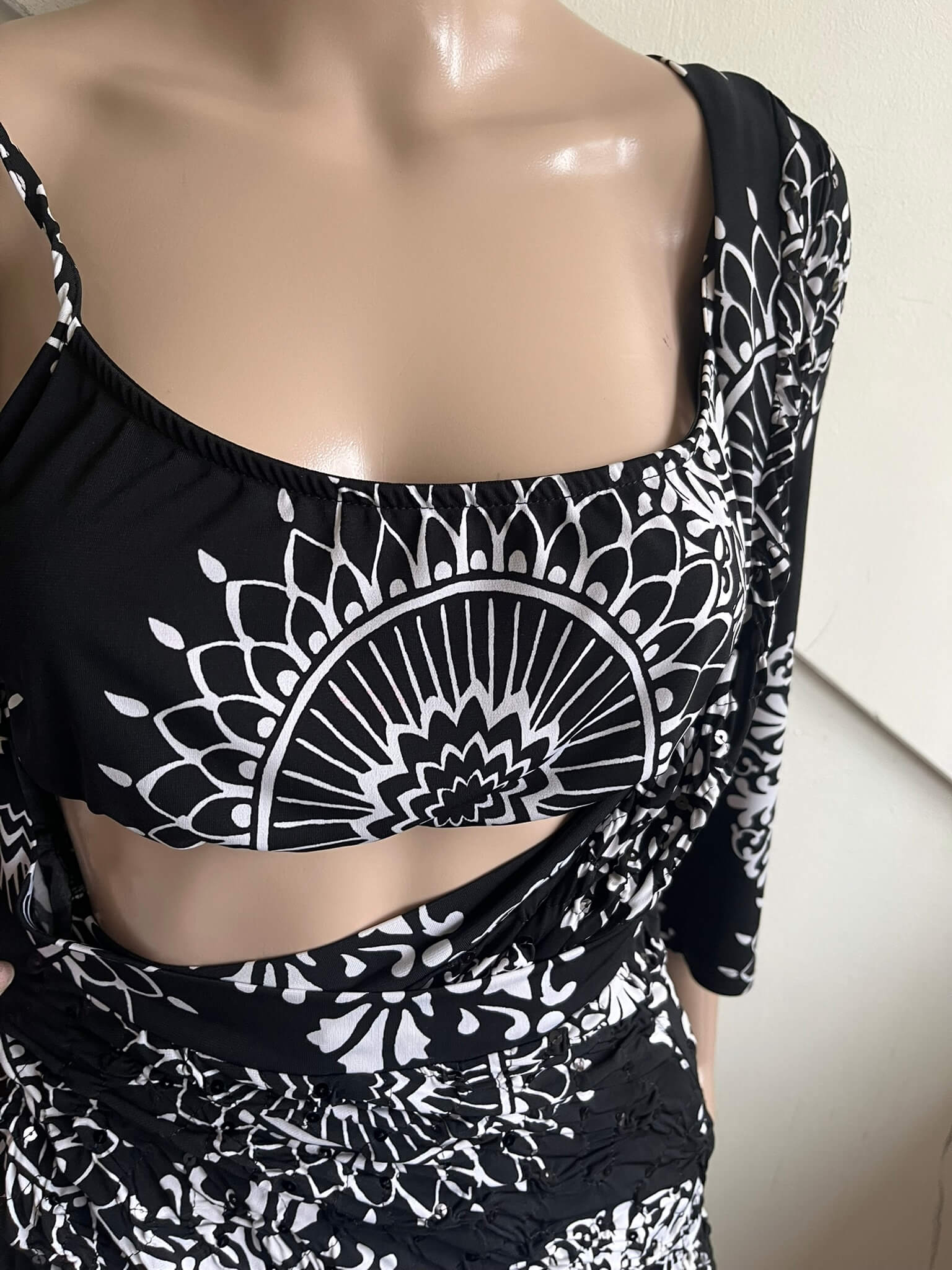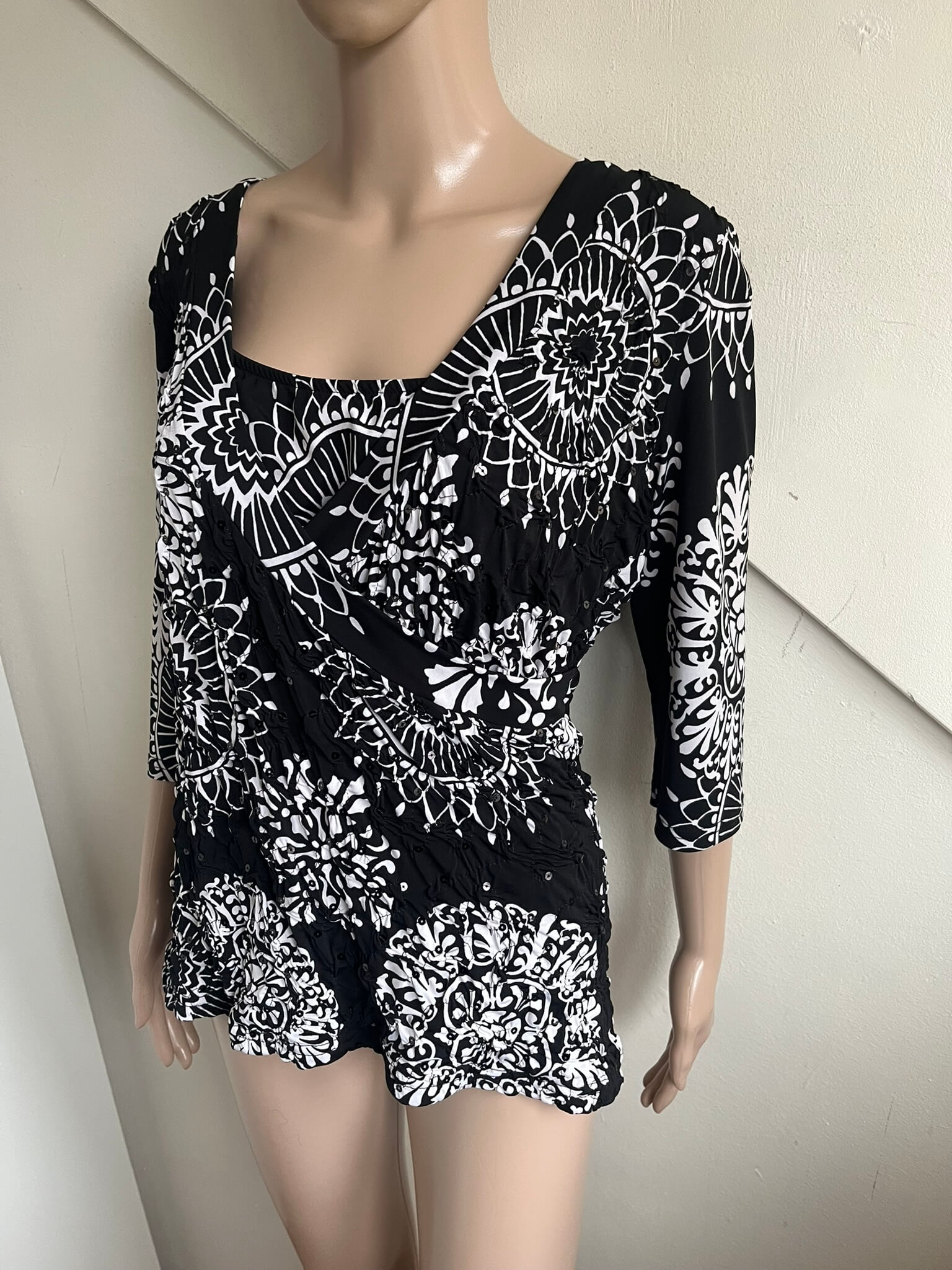 Zwarte overslag top met witte print en bewerkt met subtiele pailletten in de maat 40. Er zit een topje in bij de buste (zie één na laatste foto). Gemaakt van polyester en elastaan. Oksellengte 50 cm en lengte 60 cm.