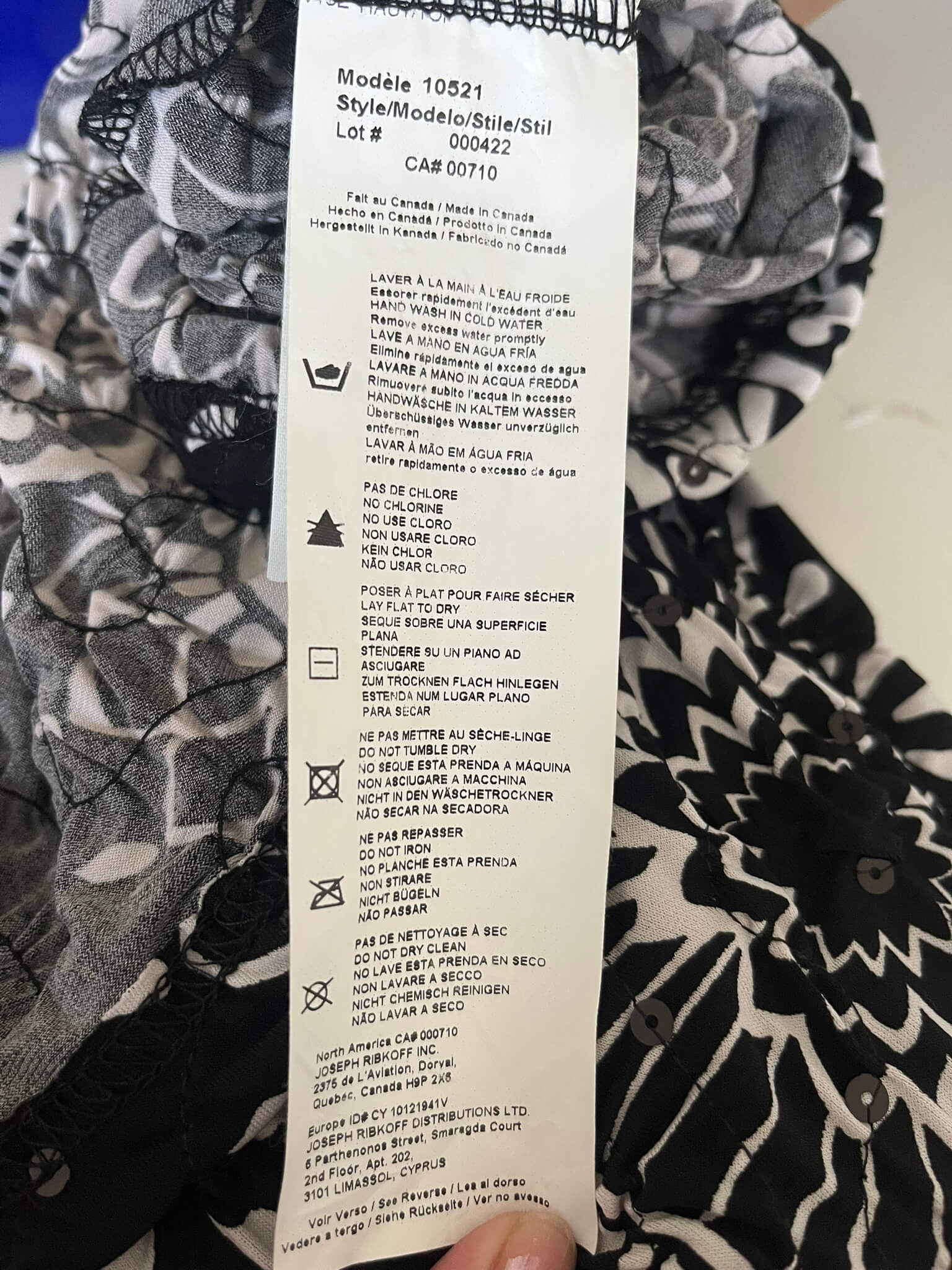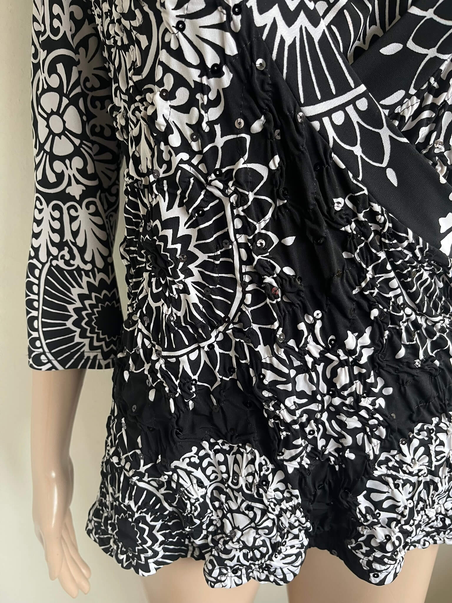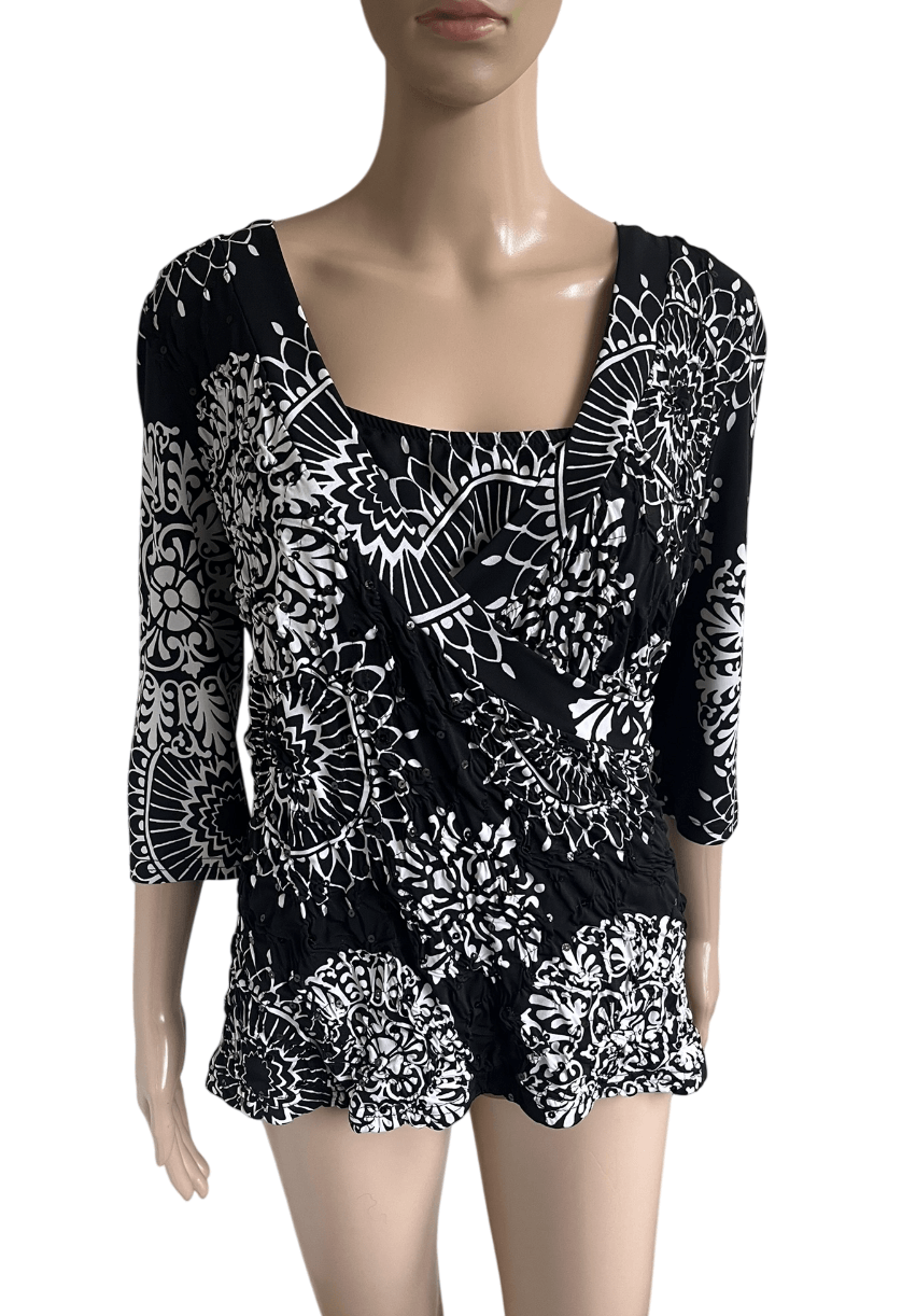 Zwarte overslag top met witte print en bewerkt met subtiele pailletten in de maat 40. Er zit een topje in bij de buste (zie één na laatste foto). Gemaakt van polyester en elastaan. Oksellengte 50 cm en lengte 60 cm.