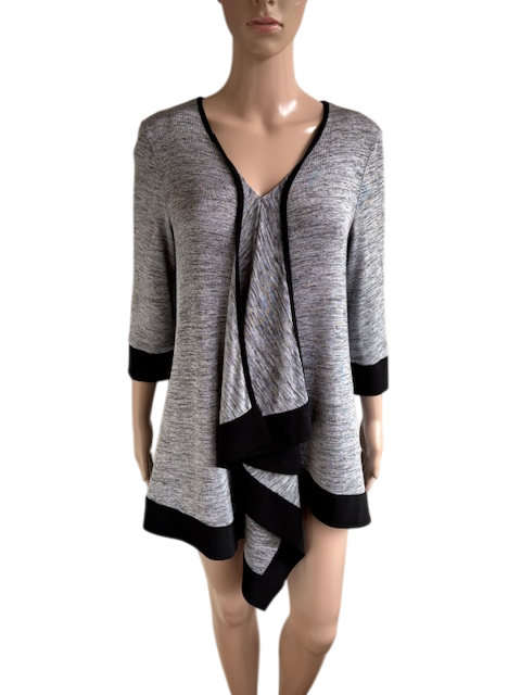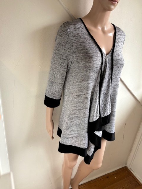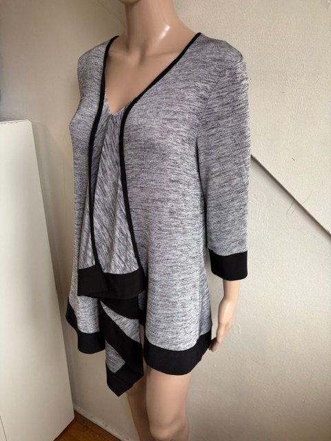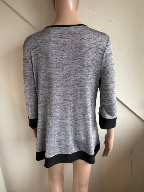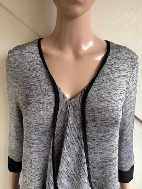 Feestelijke grijs gemêleerd tuniek met zwarte accenten in de maat 38. Soepelvallend materiaal, helaas ontbreekt het materiaallabel. Oksellengte 49 cm en lengte vanaf de schouders is 67 cm (het kortste gedeelte).