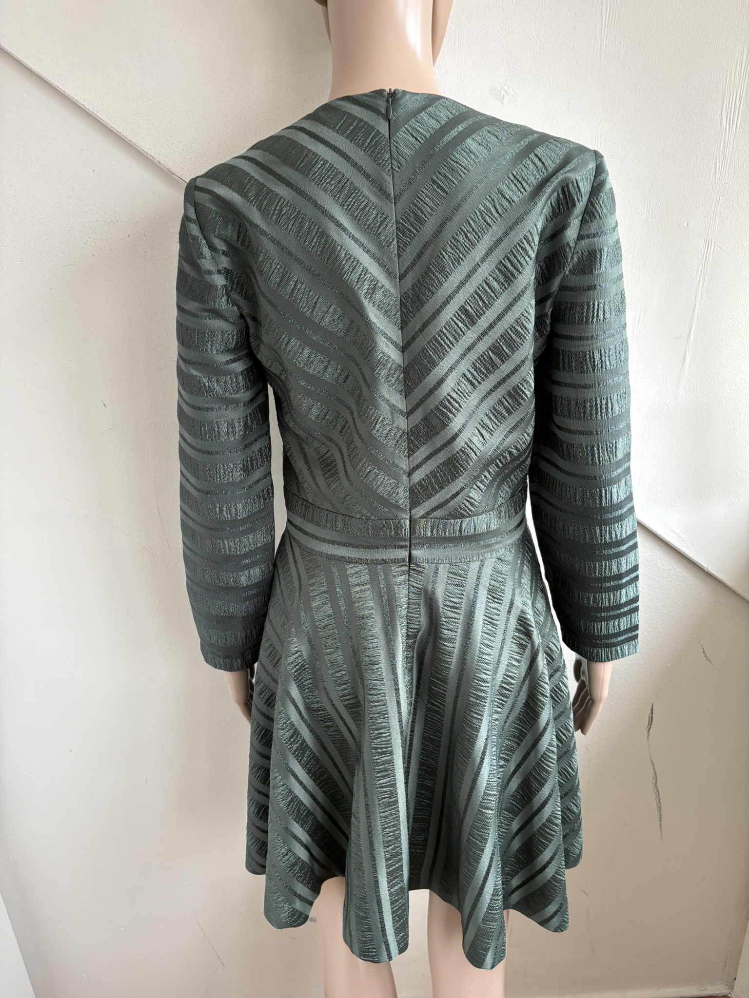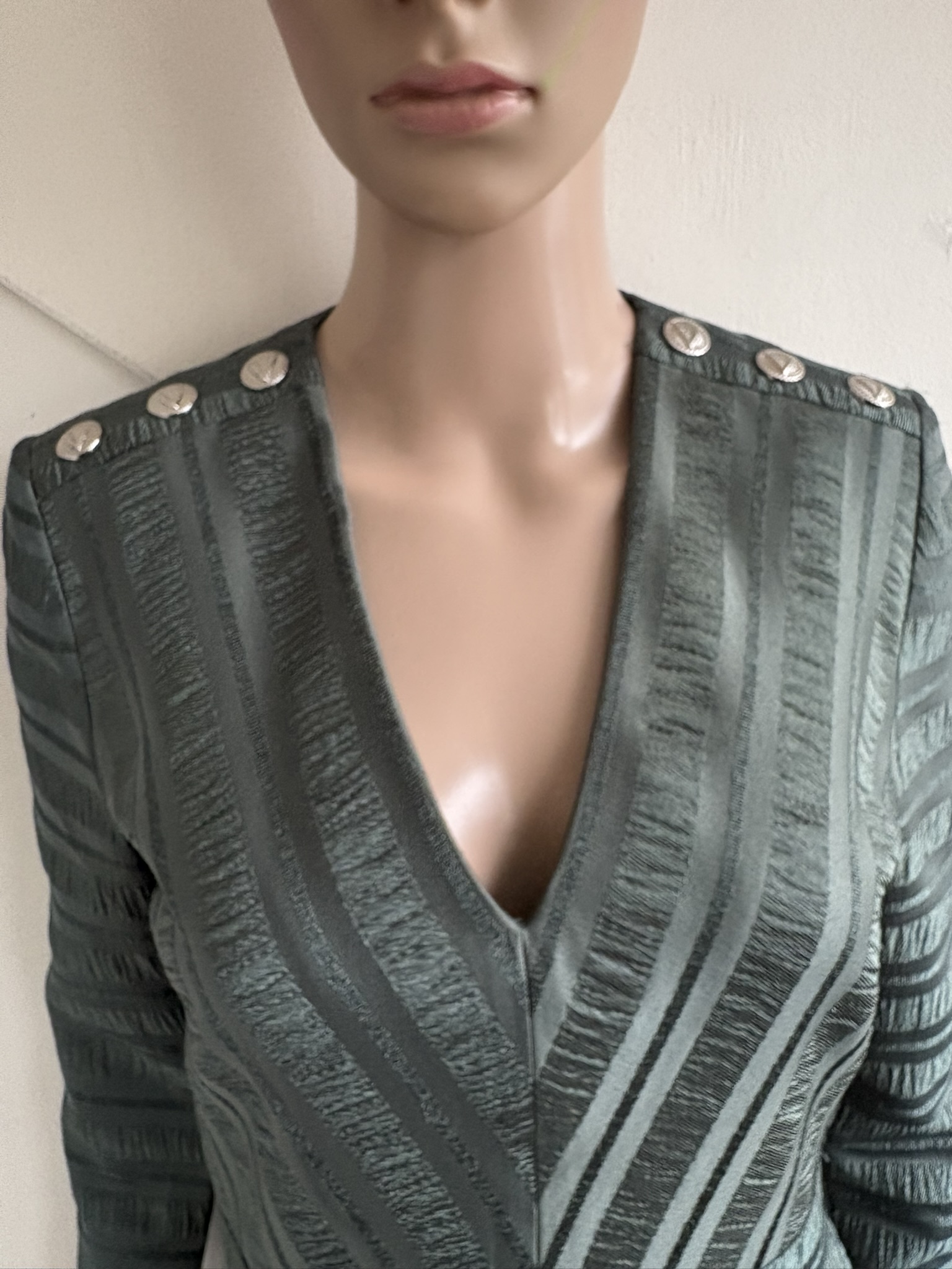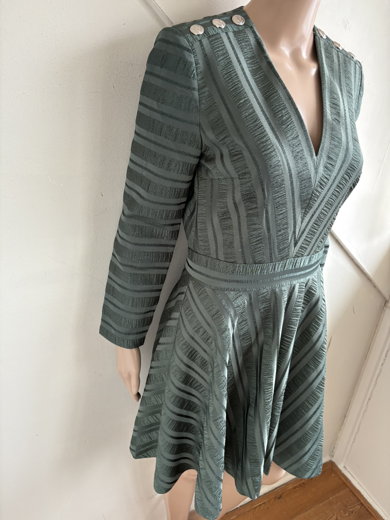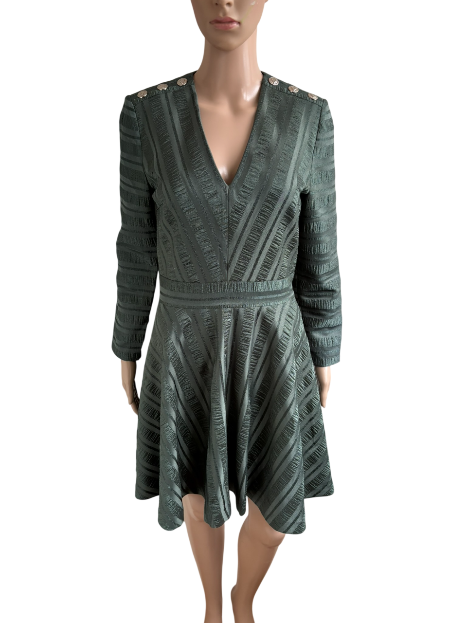 Groene getailleerde jurk met glanzend motief en knopen op de schouder in de maat S. Gemaakt van polyester en elastaan en de voering is ook van polyester gemaakt. Oksellengte 45 cm en lengte 87 cm.