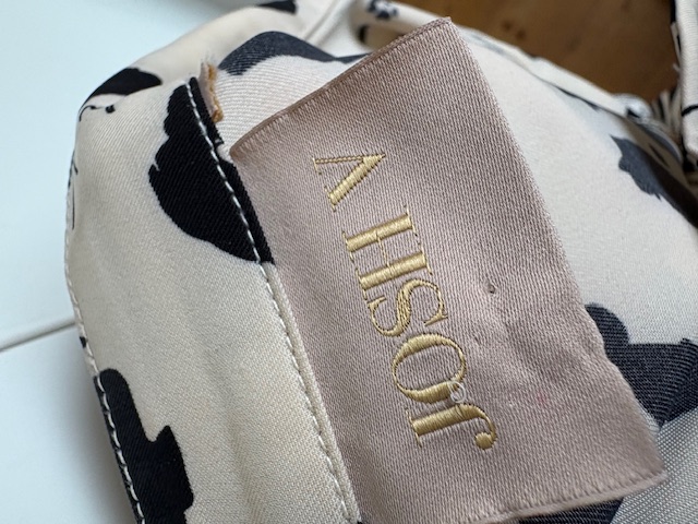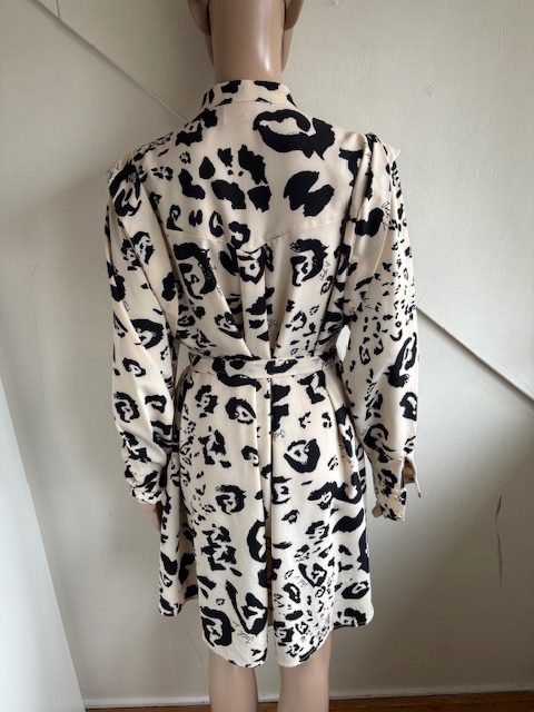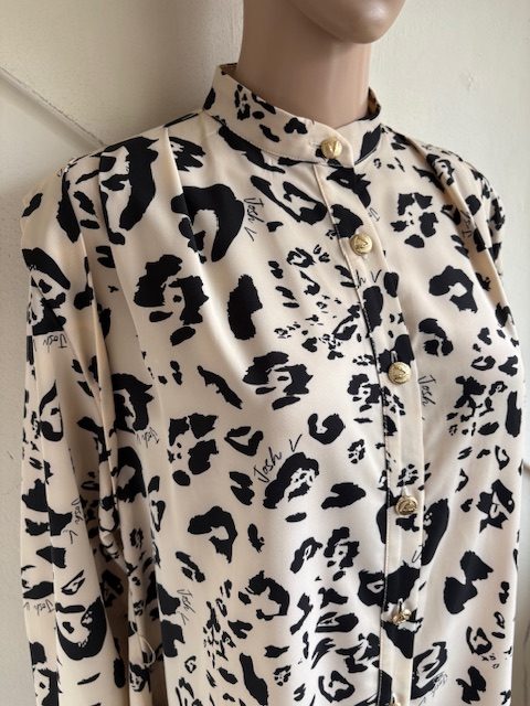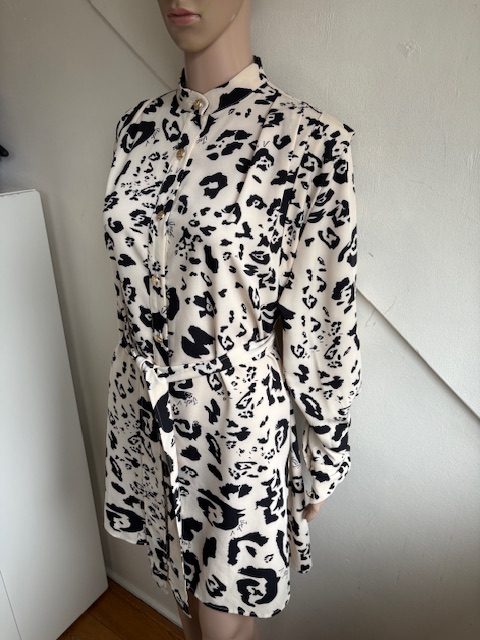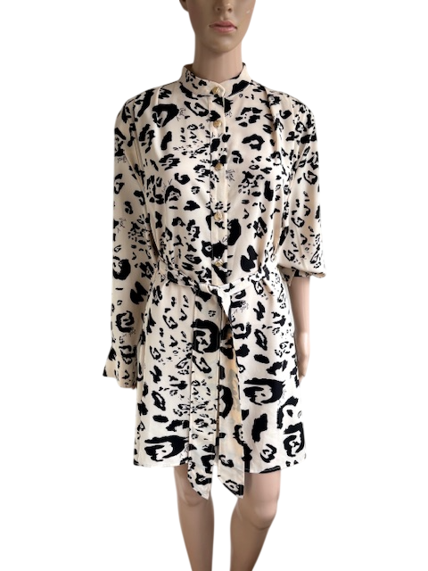 Cremekleurig tuniek of doorknoopjurk met zwarte print, een riem en goudkleurige knopen in de maat 42/44. Oksellengte 59 cm en lengte 88 cm.