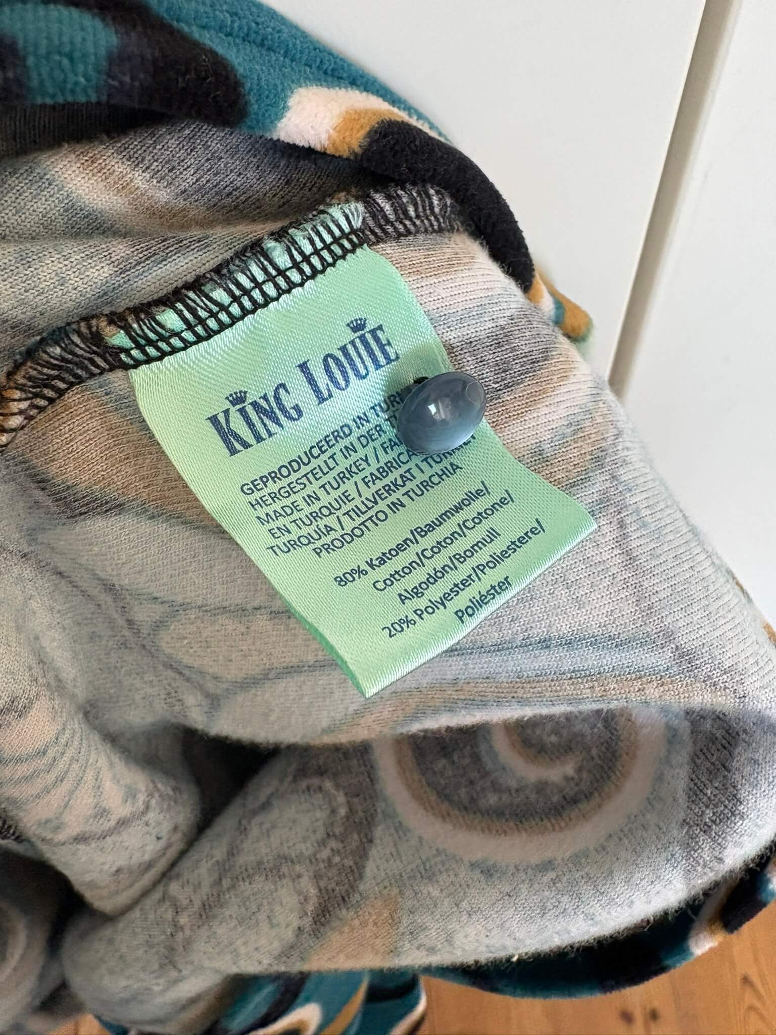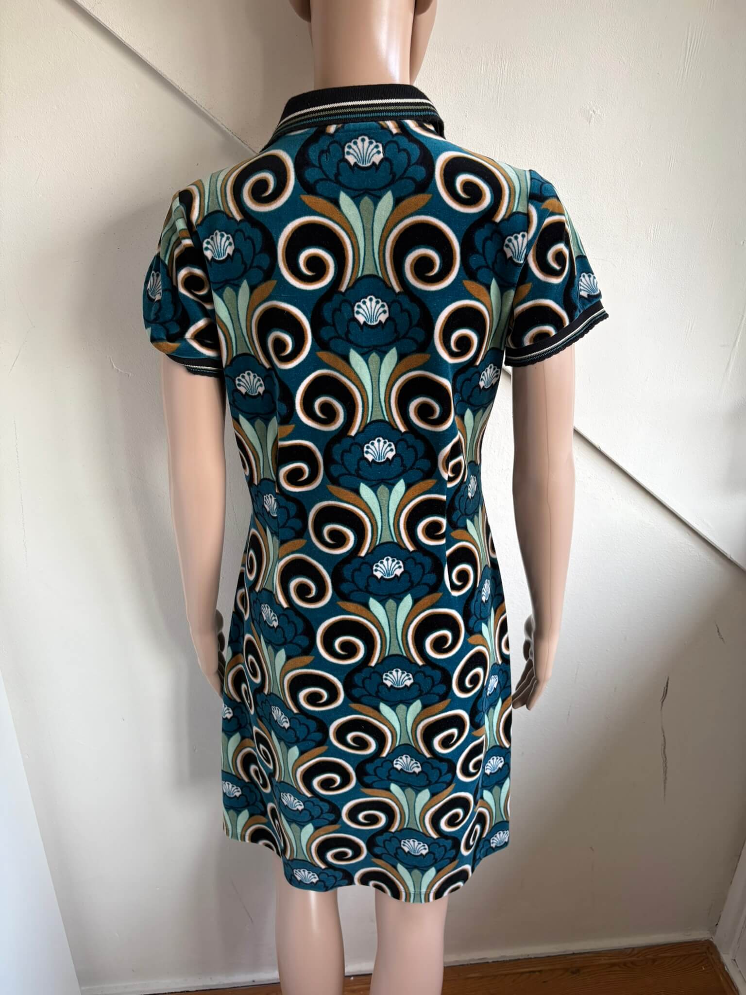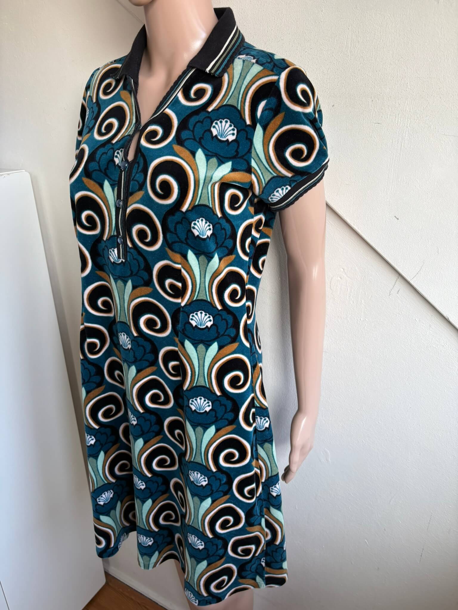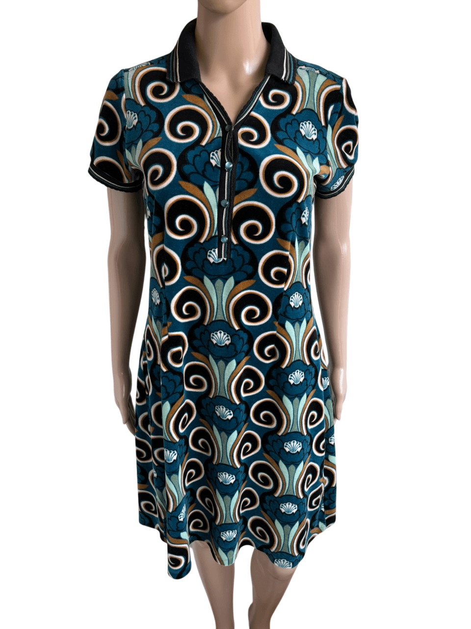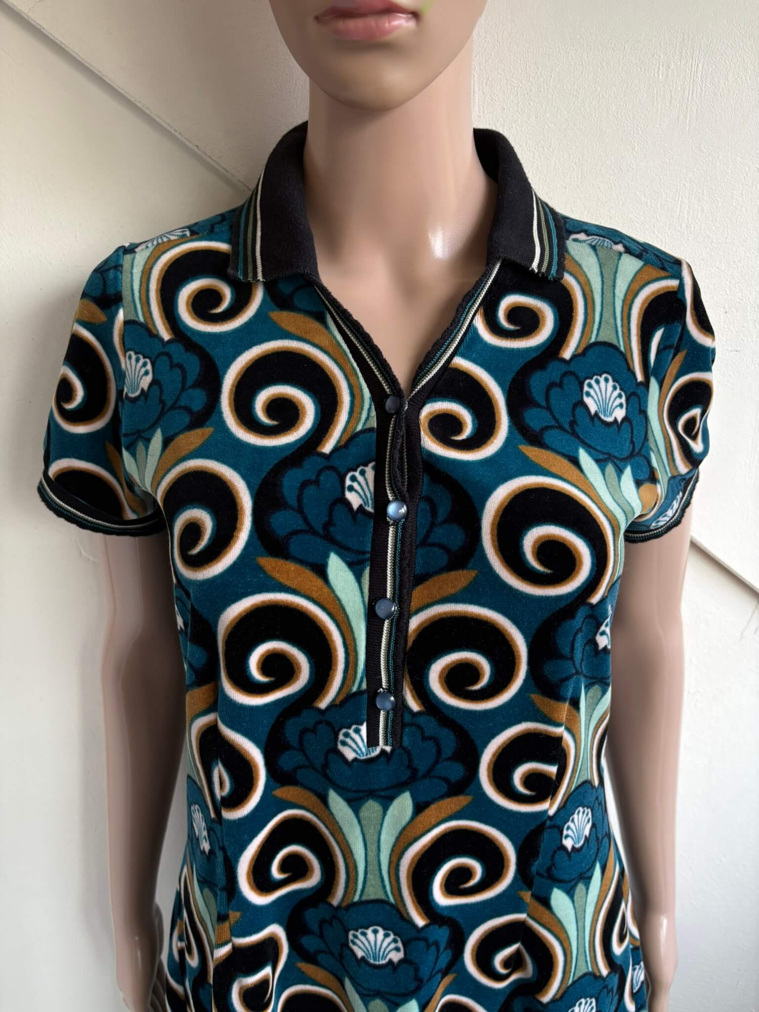 Petrolblauwe jurk met retroprint in de maat S. Gemaakt van fluweelachtig materiaal, katoen en polyester. Oksellengte 47 cm en lengte 91 cm.