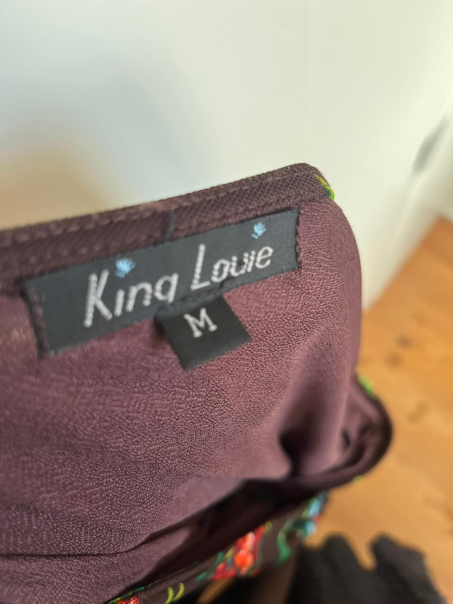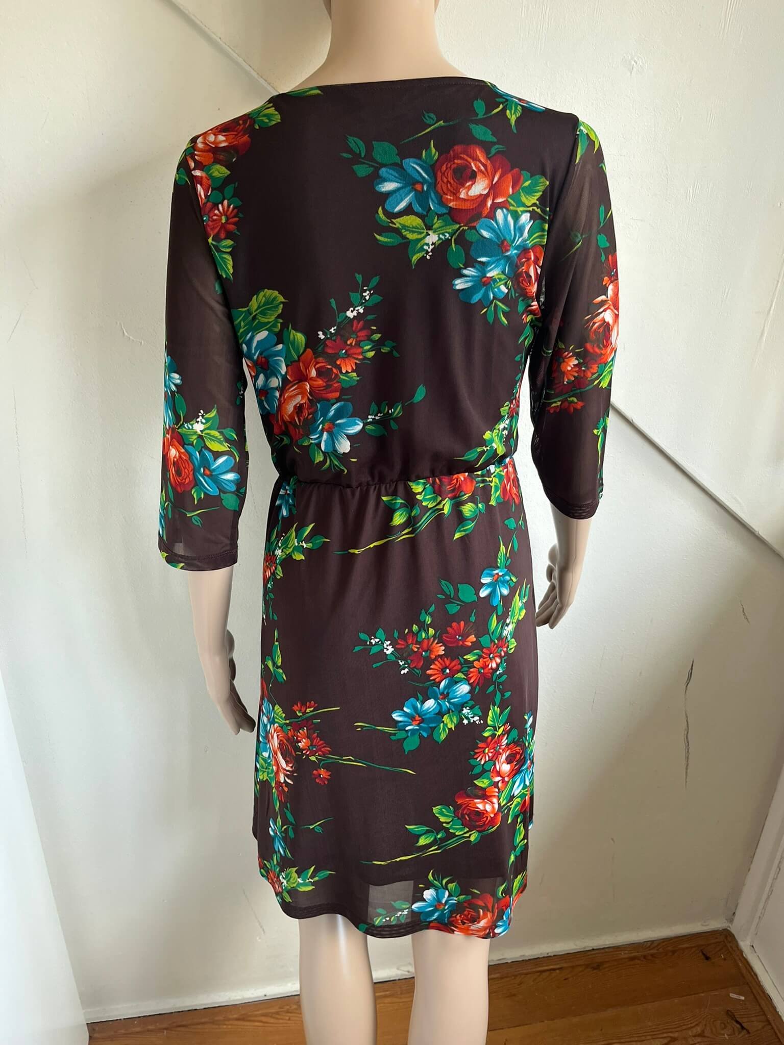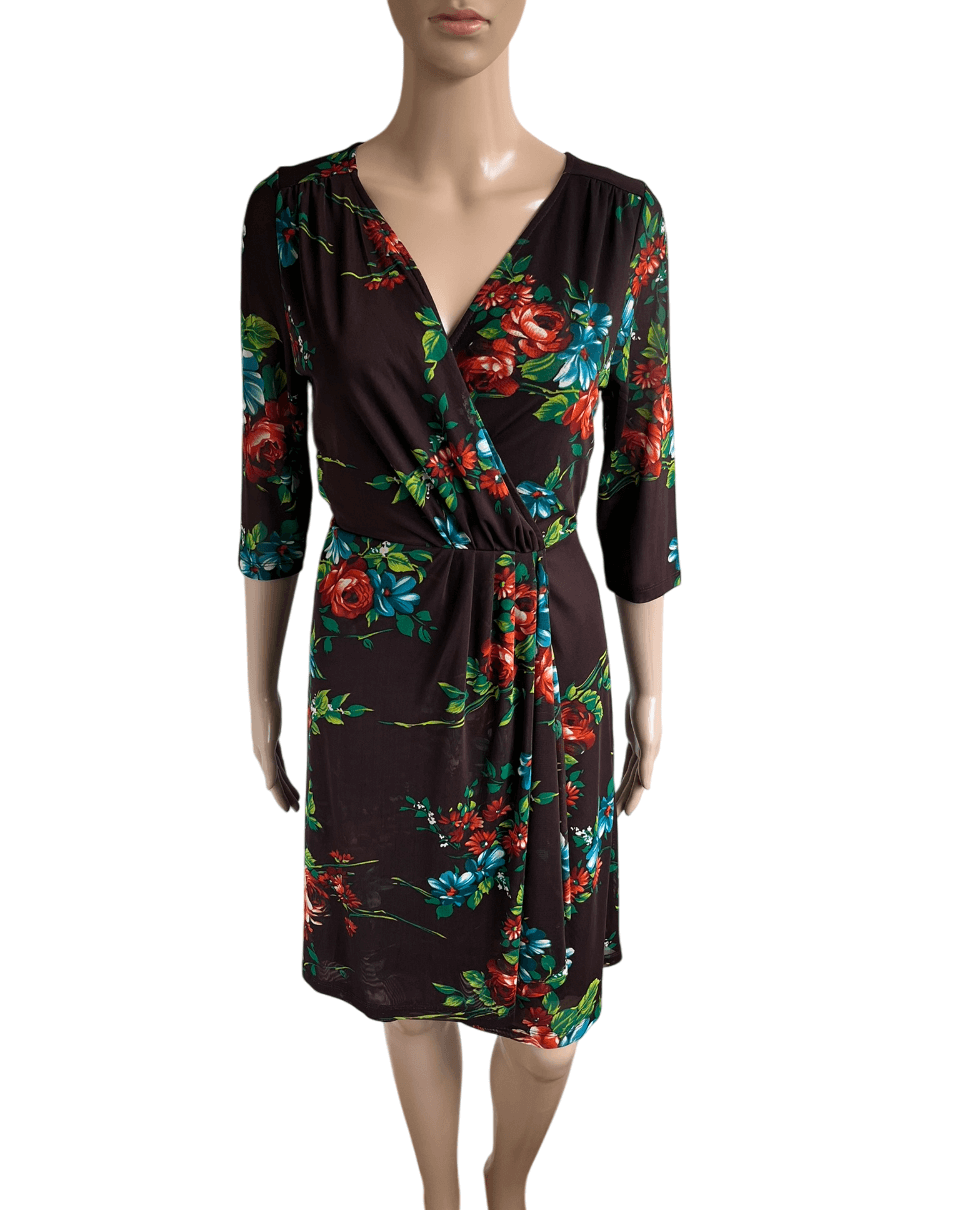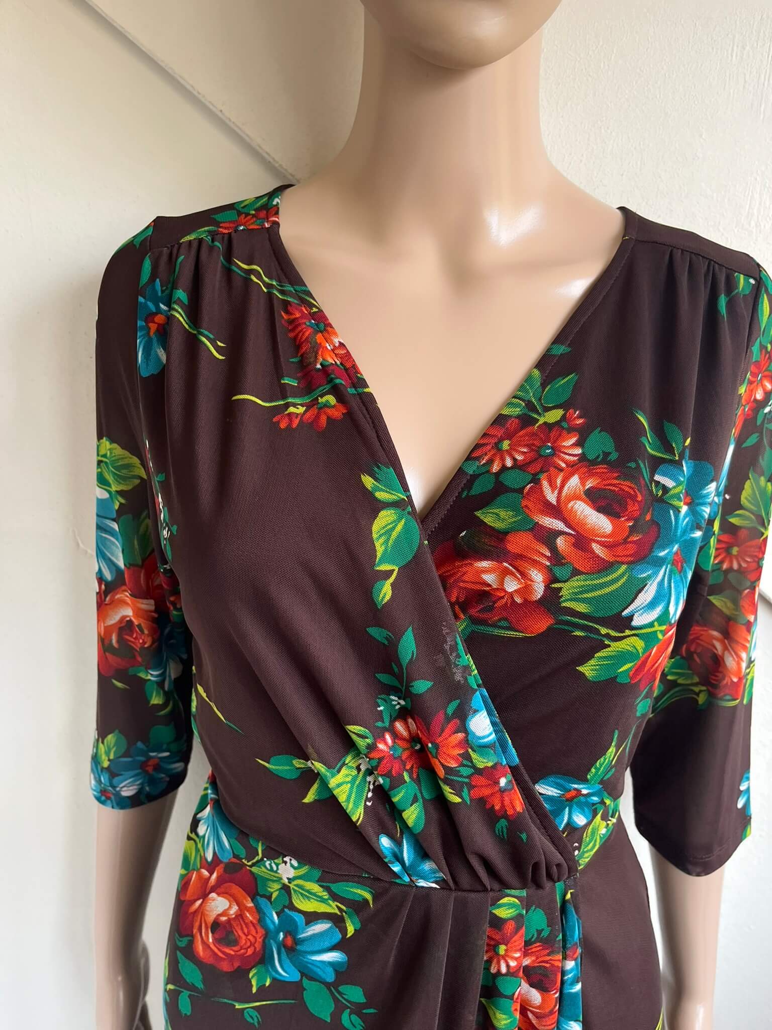 Bruine getailleerde overslagjurk met een blauw rode bloemenprint in de maat M. Gemaakt van polyester en elastaan.
