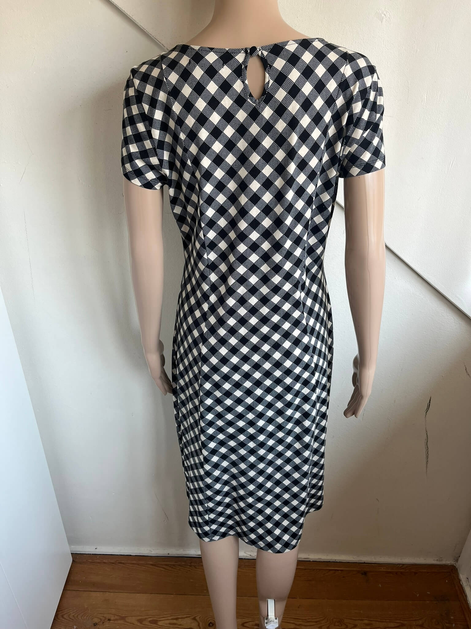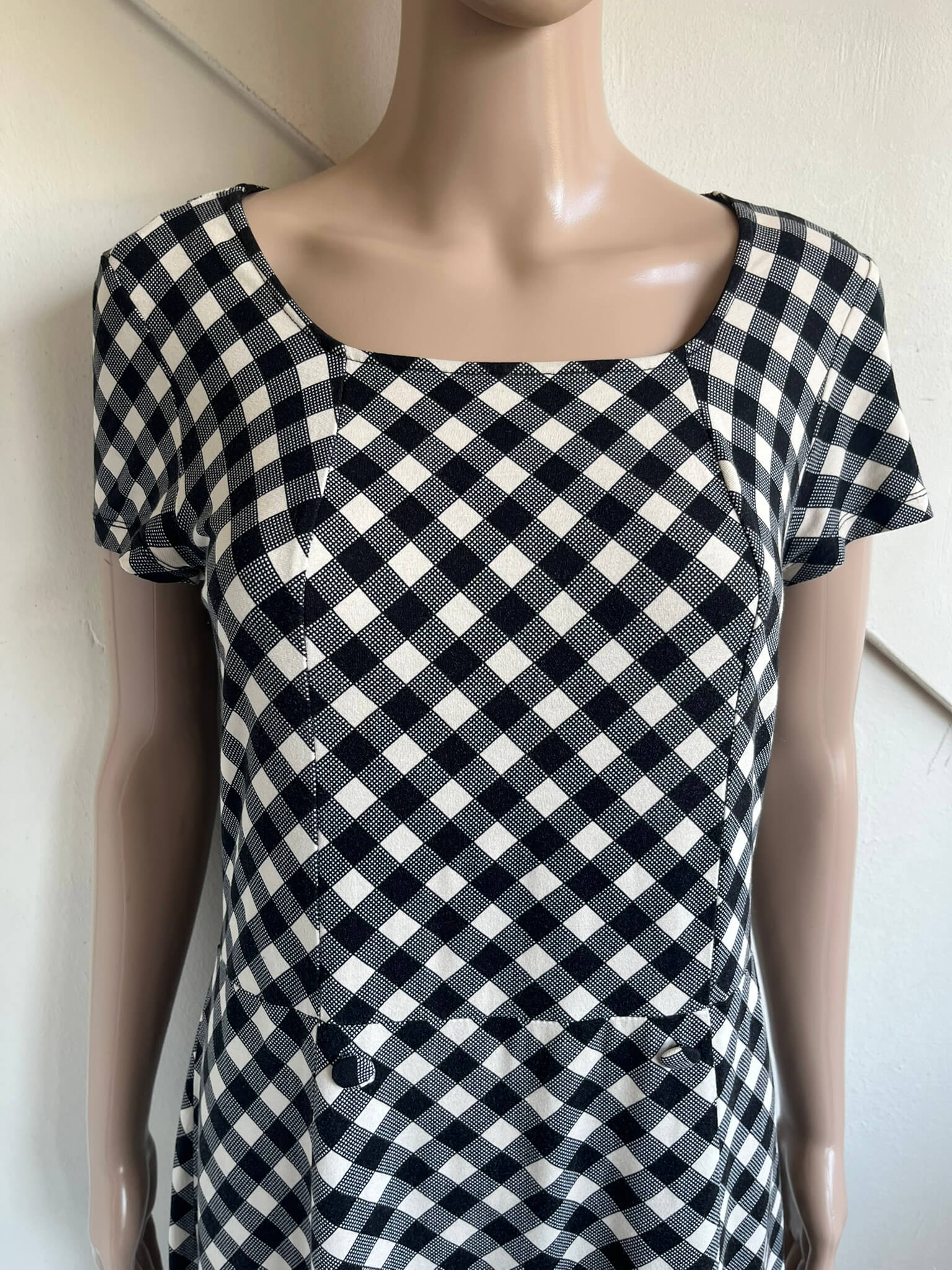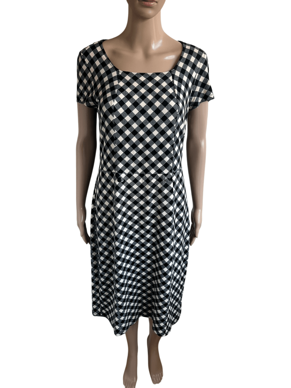 Zwart wit geblokte jurk in een retro / vintage stijl in de maat M. In het label staat maat L maar valt een maatje smaller want oksellengte is 47 cm en lengte 100 cm. Gemaakt van viscose en elastaan.