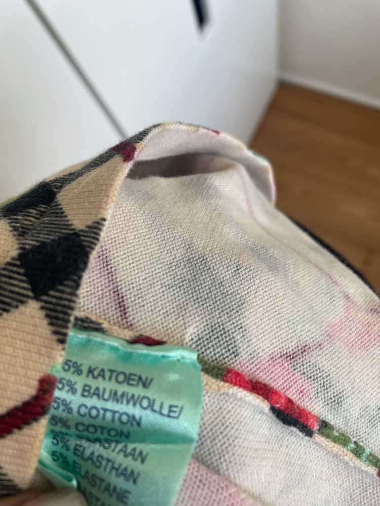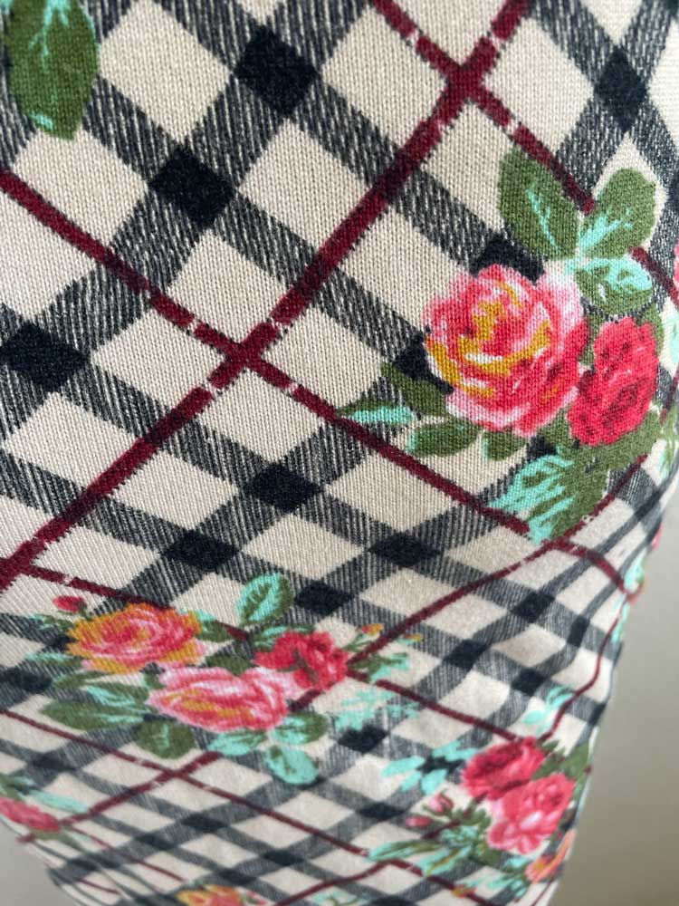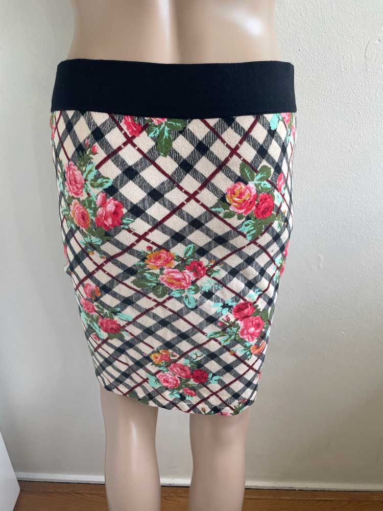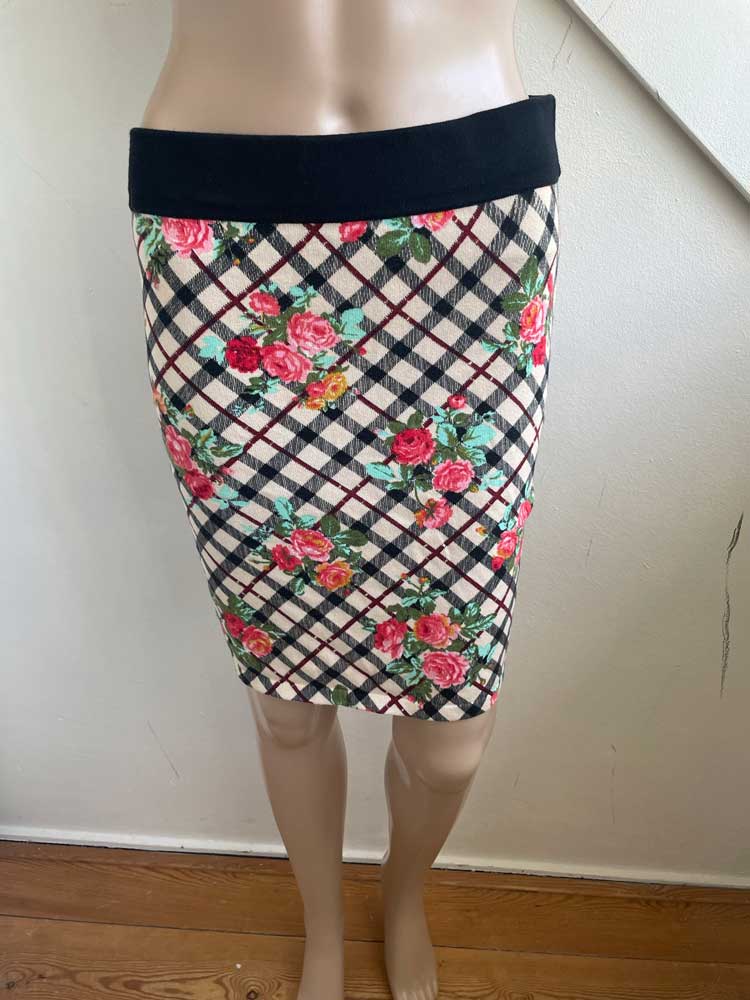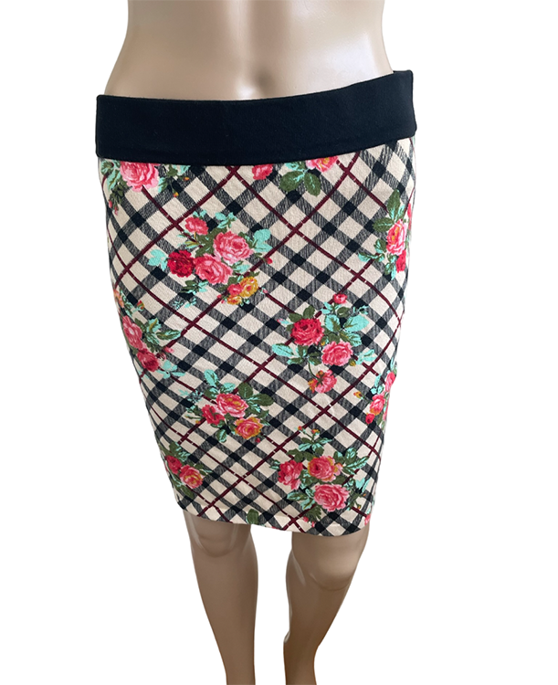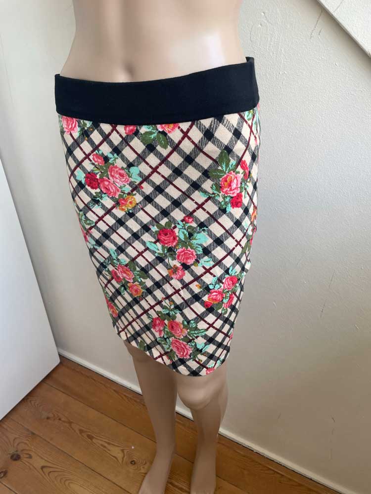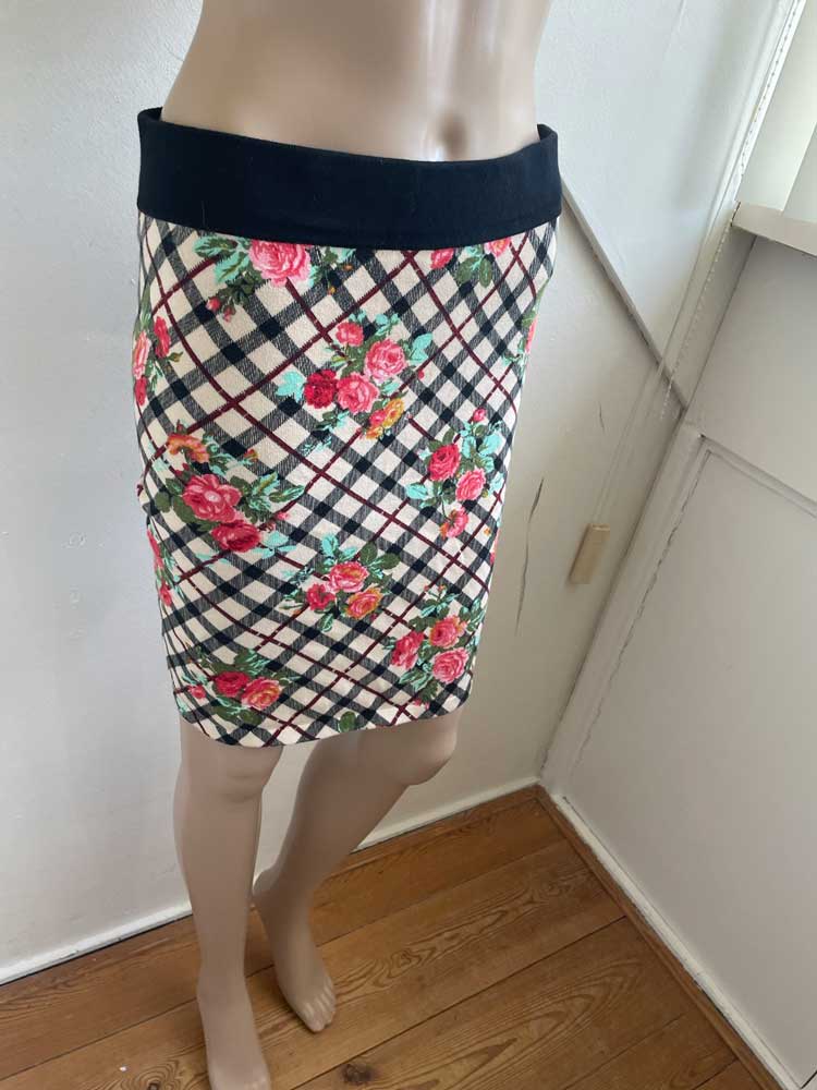 Zwart offwhite geblokt rokje met roze bloemenprint in de maat M, gemaakt van katoen. Taillewijdte is 40 cm, en lengte is 49 cm.