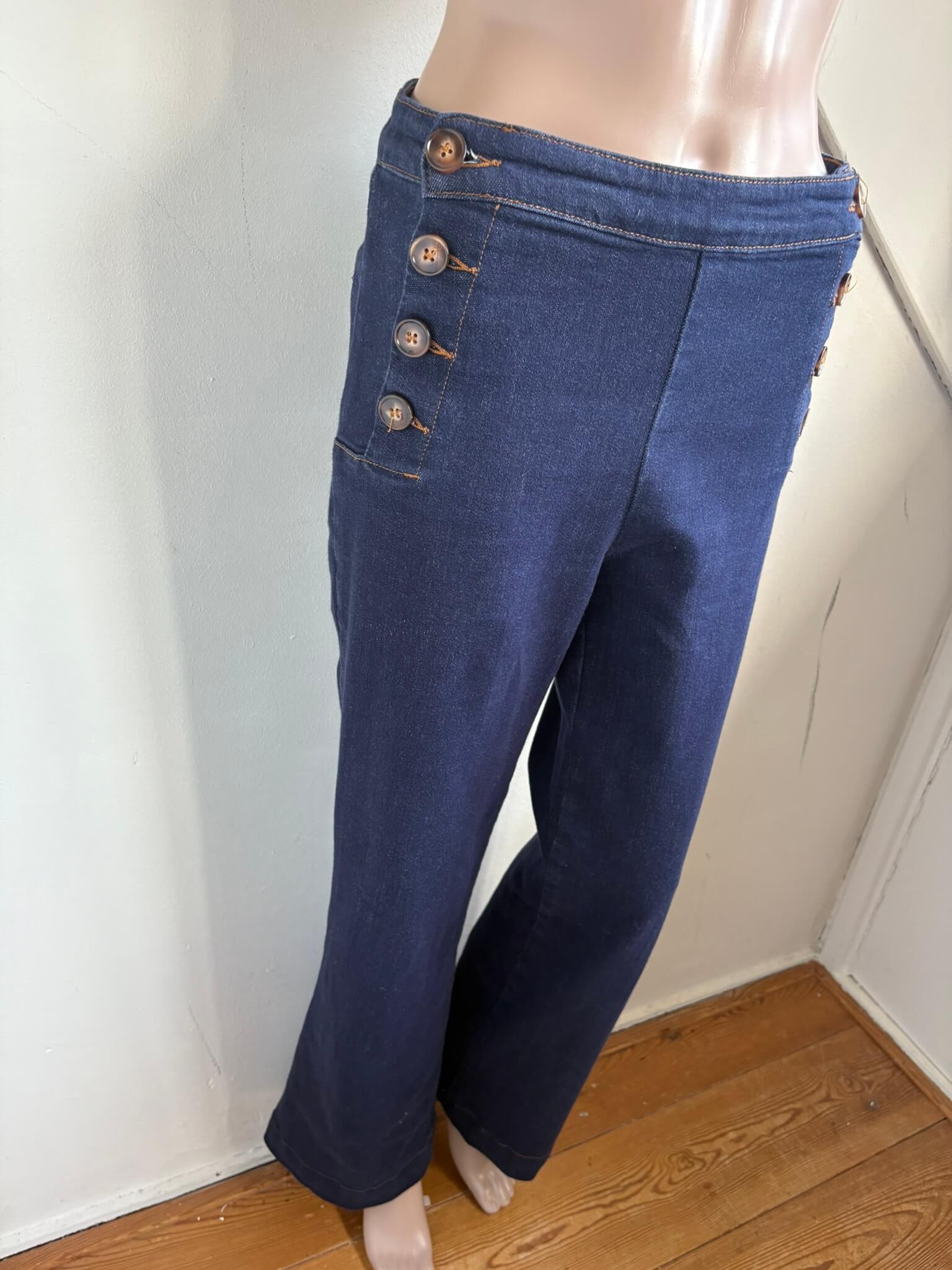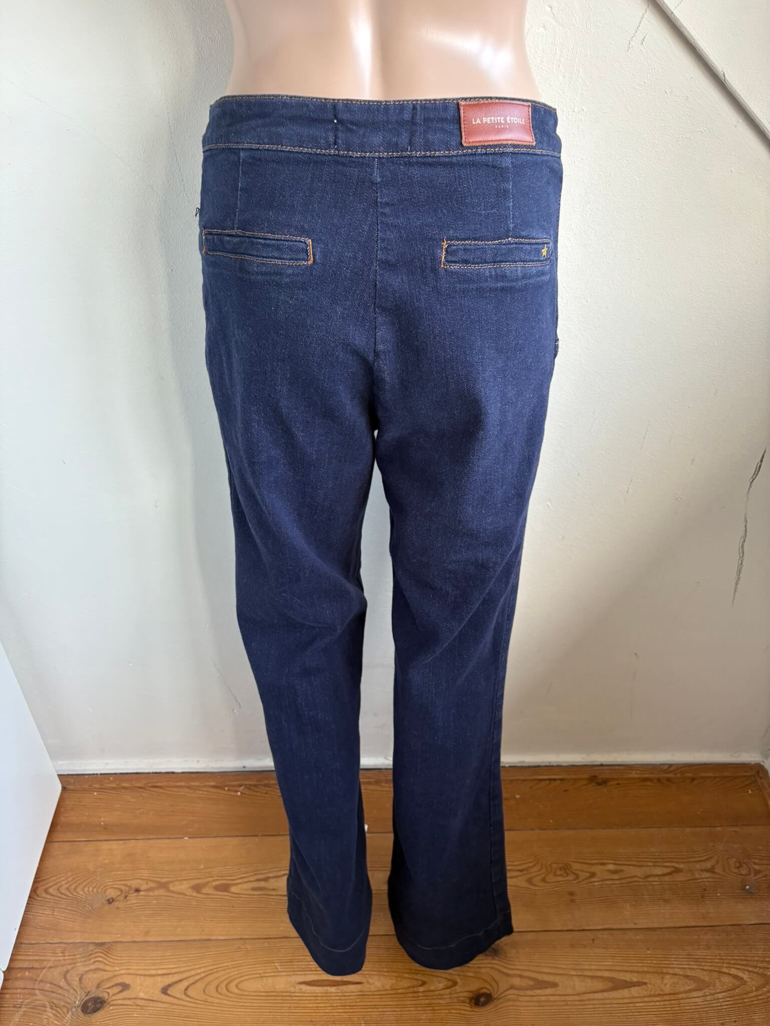 Donkerblauwe vintage stijl spijkerbroek / jeans in de Franse maat 38 = maat 36, met sierknopen op de zakken en rechte tot wijde pijpen. Gemaakt van katoen, polyester en elastaan. Taillewijdte 38 cm en lengte 103 cm.