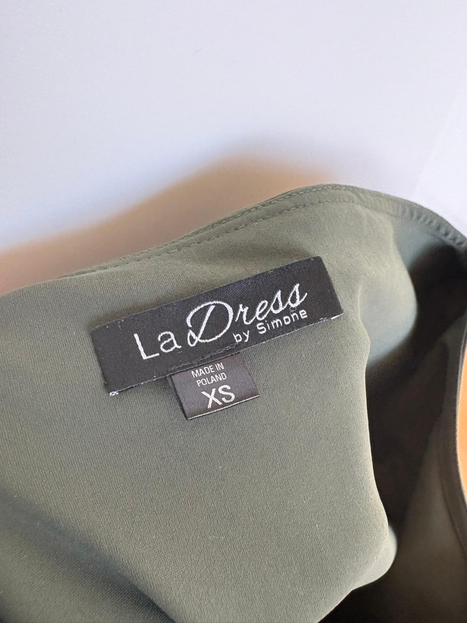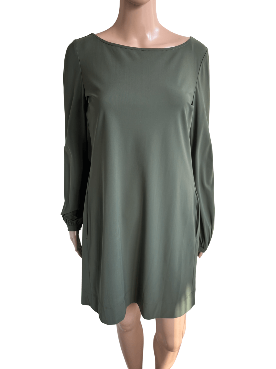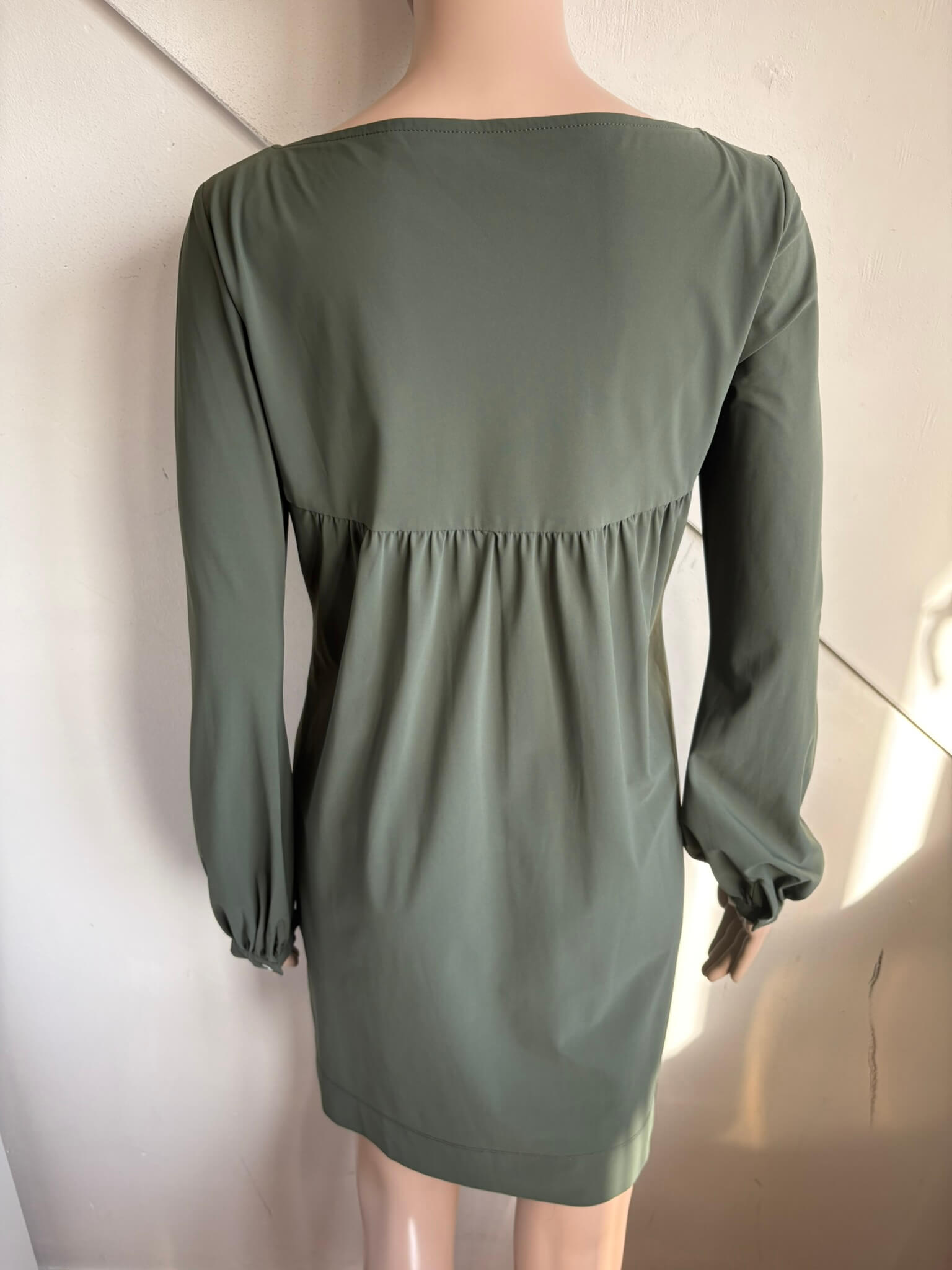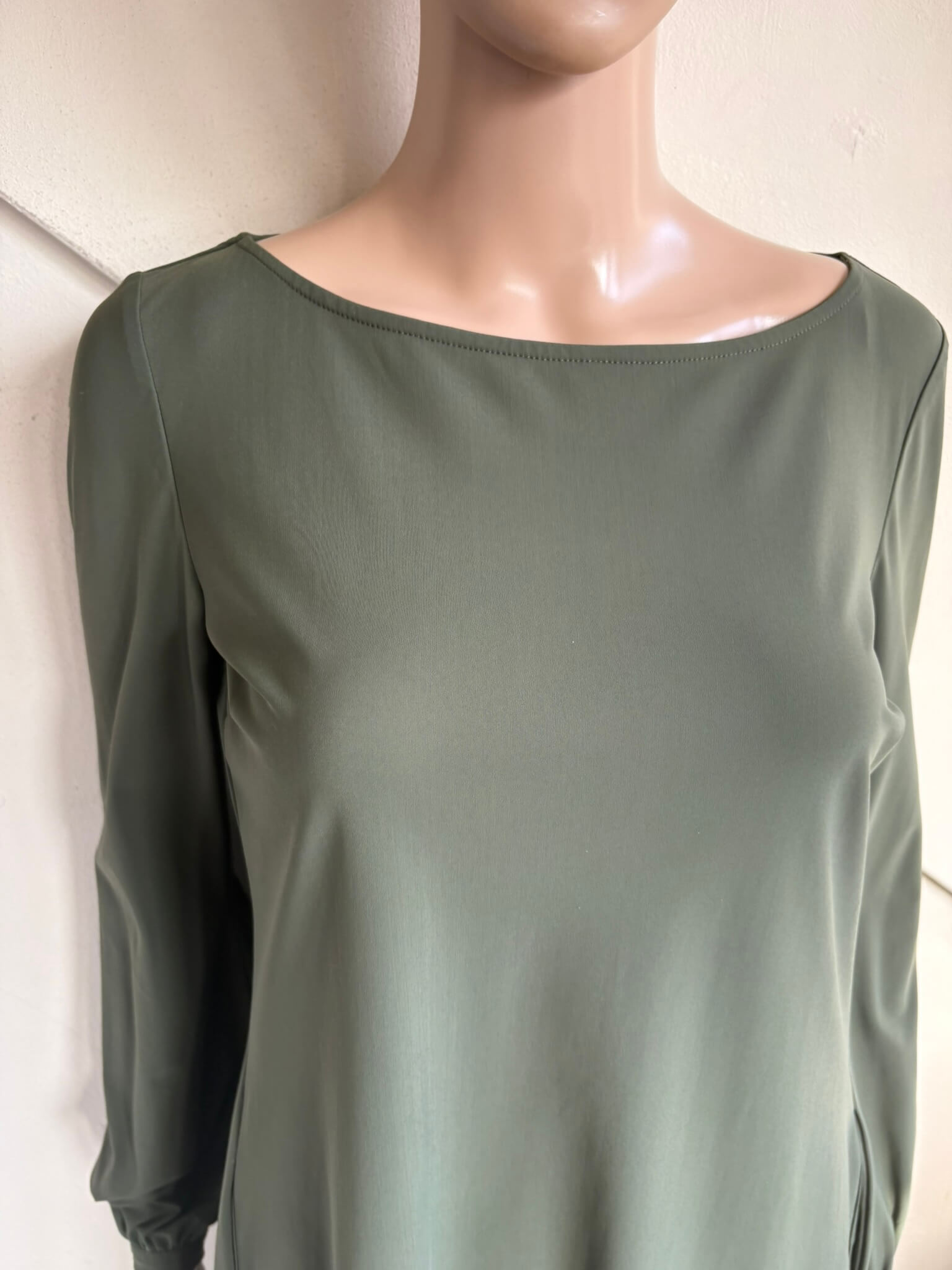 Khaki groene travelstof jurk of tuniek in de maat XS. Een maat S zou eventueel ook kunnen, want oksellengte is 45 cm, en lengte is 83 cm. Gemaakt van polyamide en elastaan.