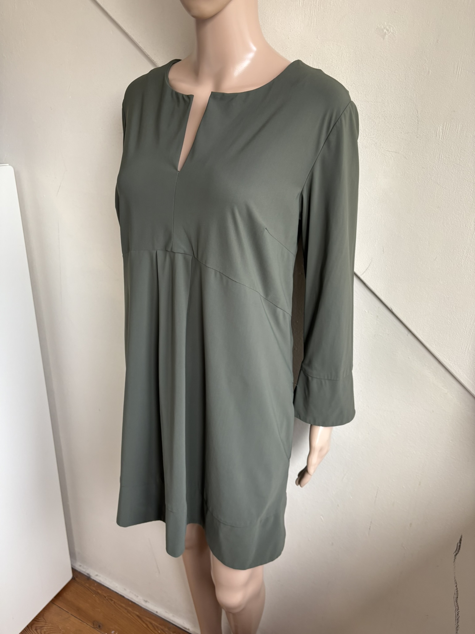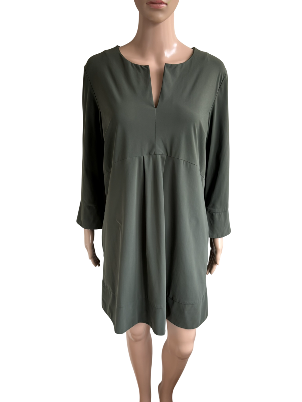 Khaki groene travelstof jurk of tuniek met zakken in de maat L. Gemaakt van polyamide en elastaan. Oksellengte 52 cm en lengte 84 cm.