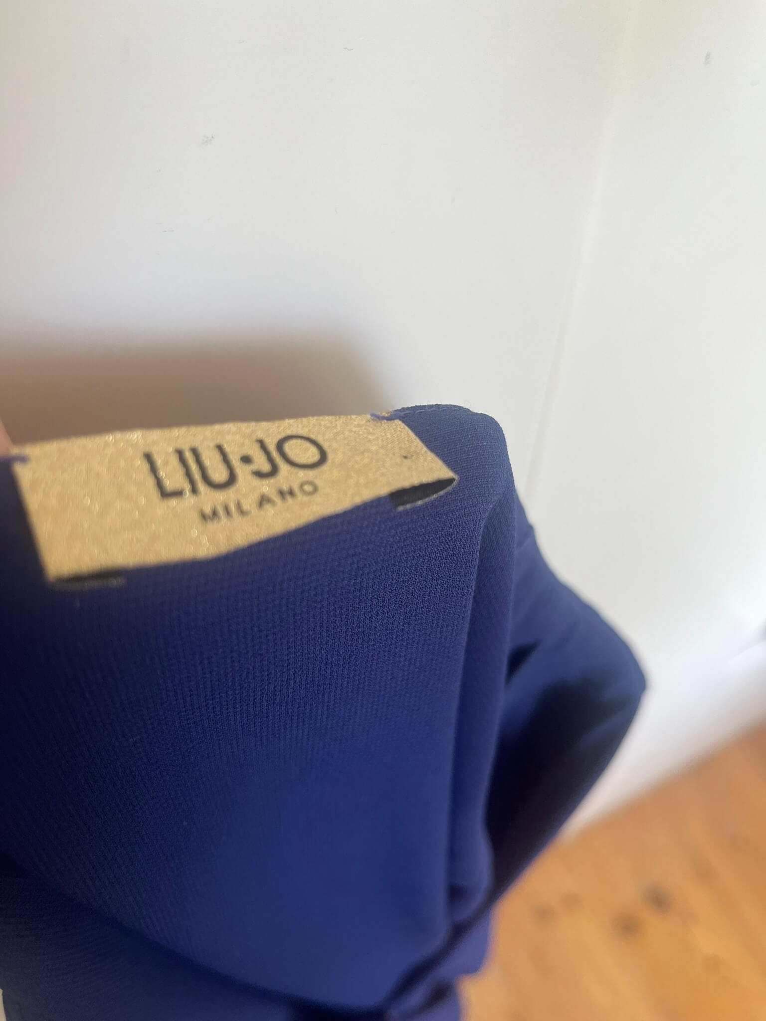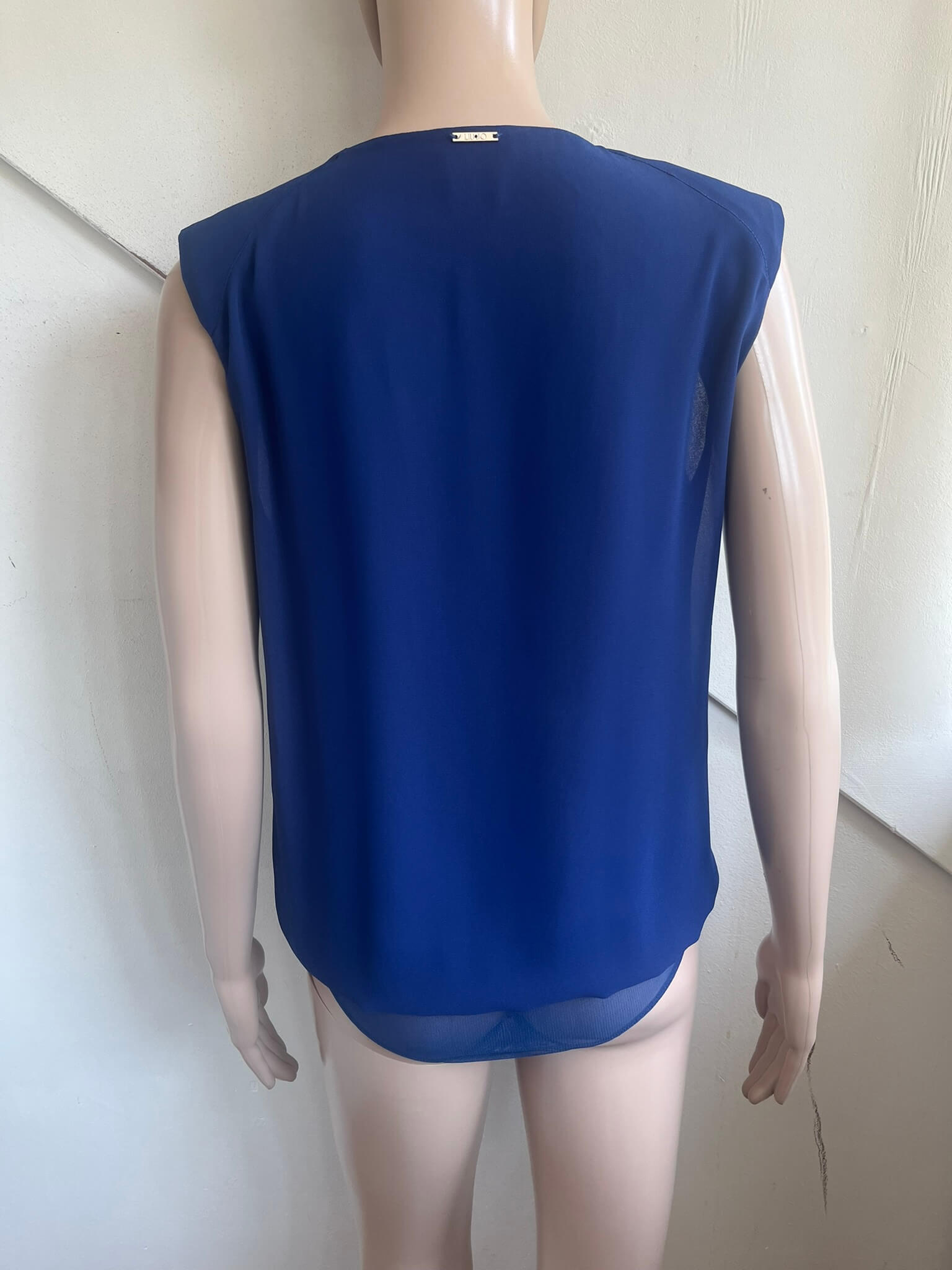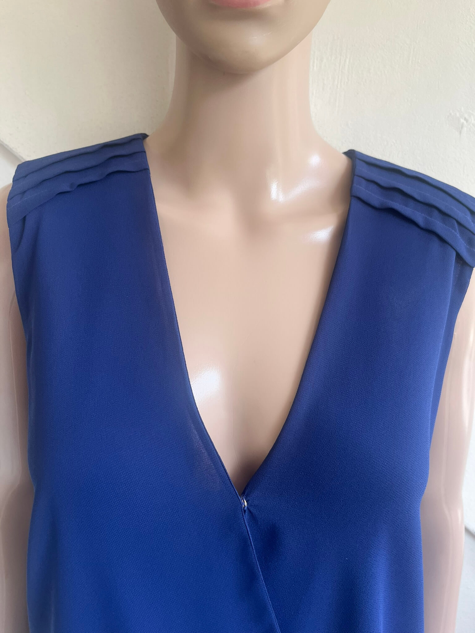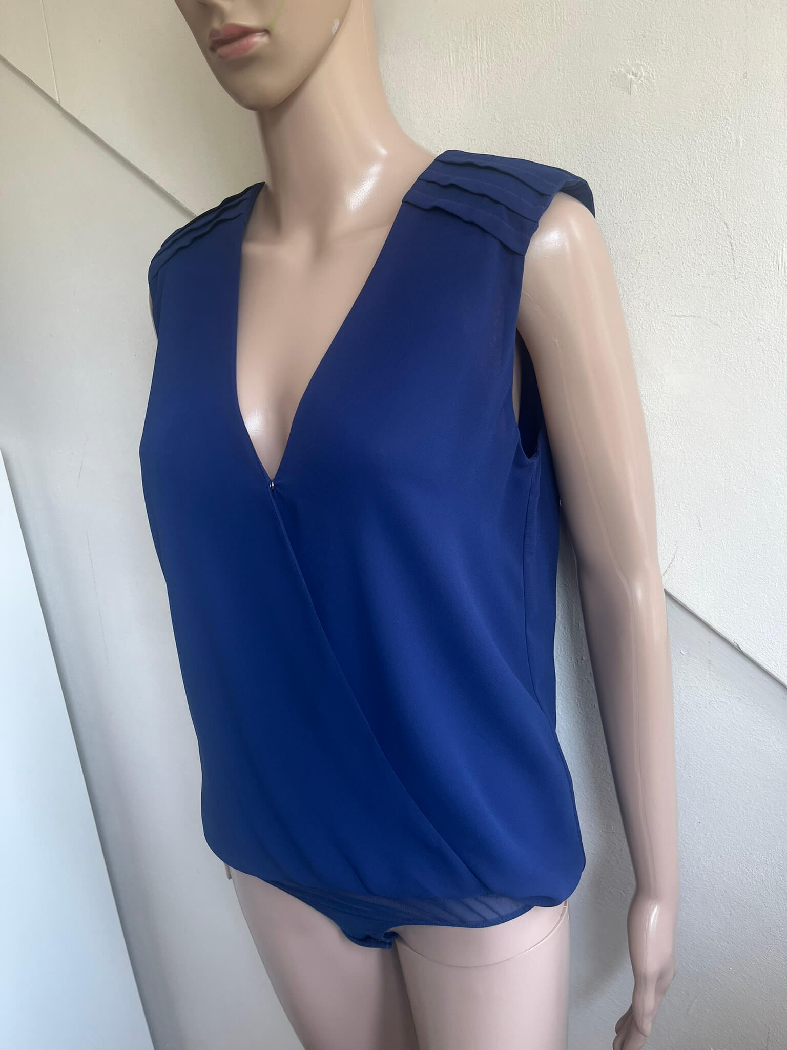 Donkerblauwe overslag body met dunne schoudervulling in de maat 36 (Italiaanse maat 42). Gemaakt van polyester, polyamide en elastaan. Oksellengte 46 cm en lengte tot aan broekje 58 cm.