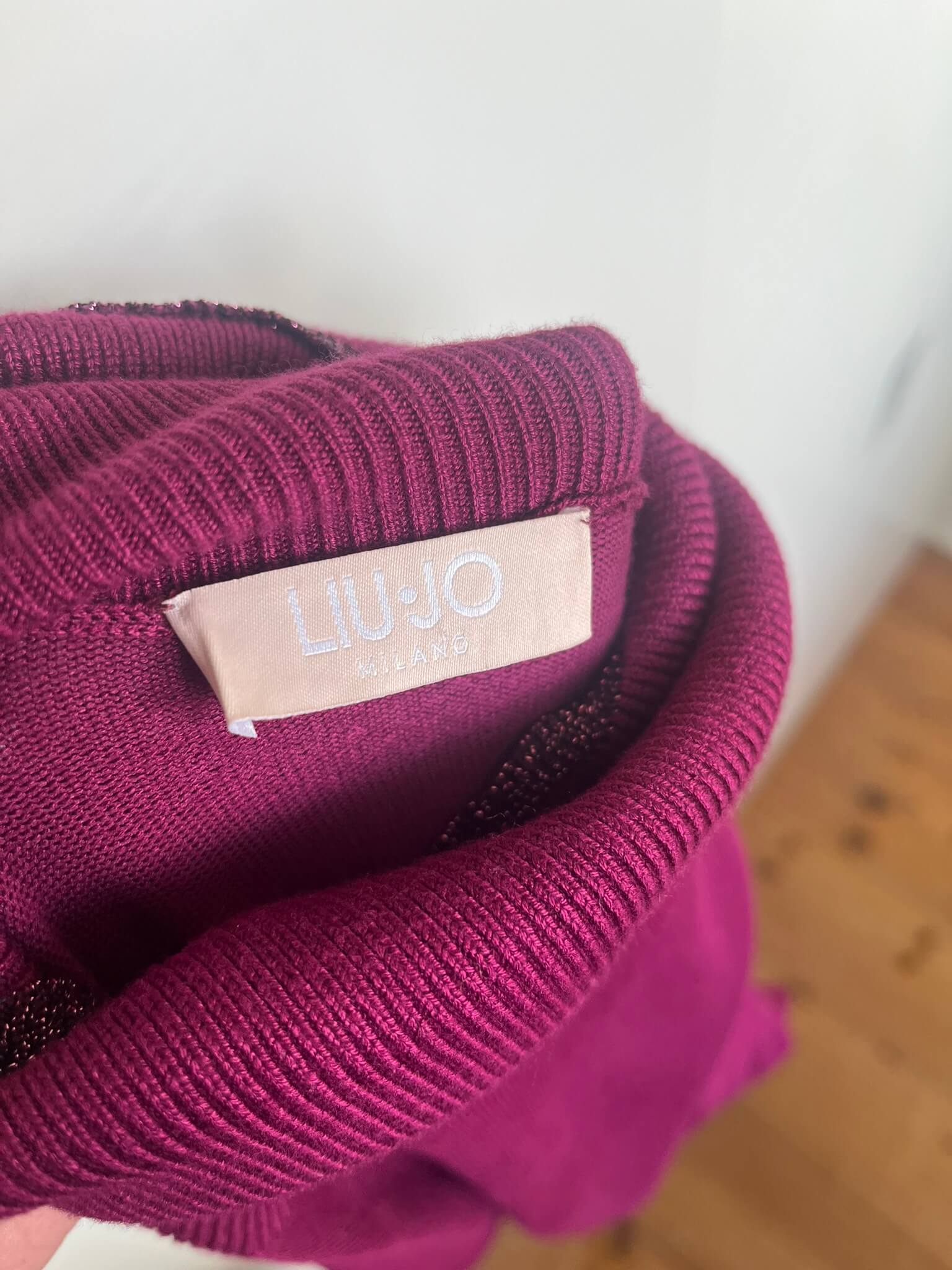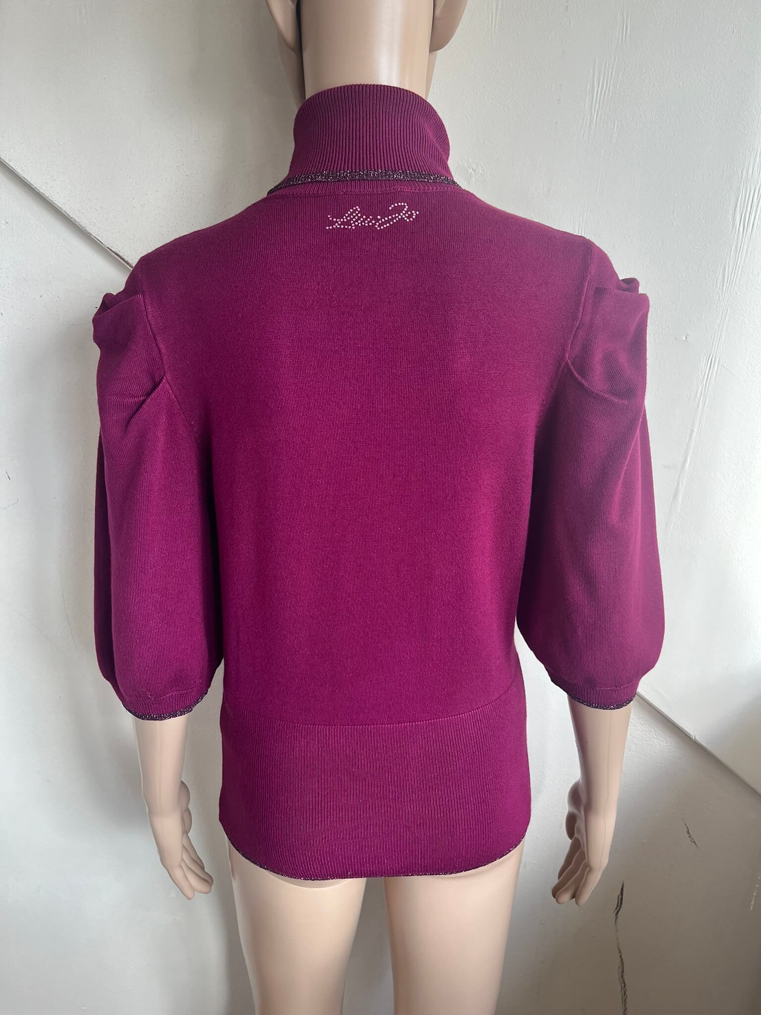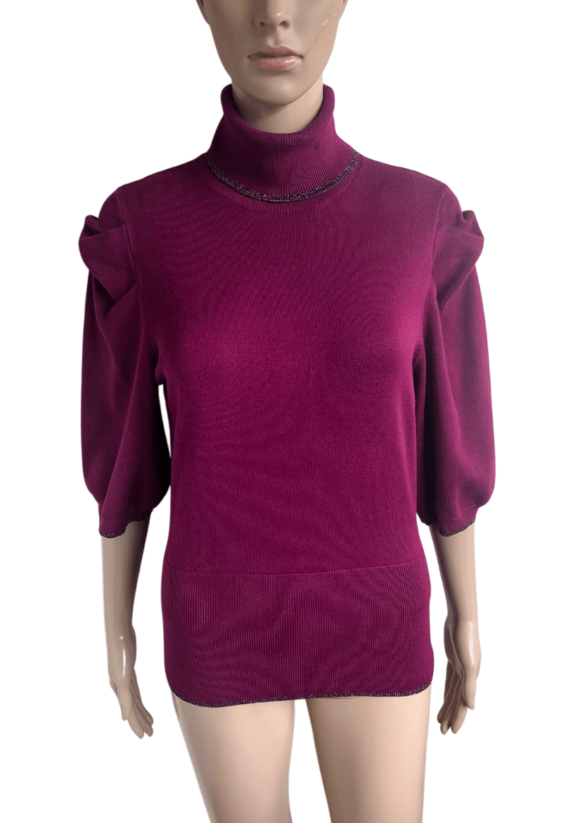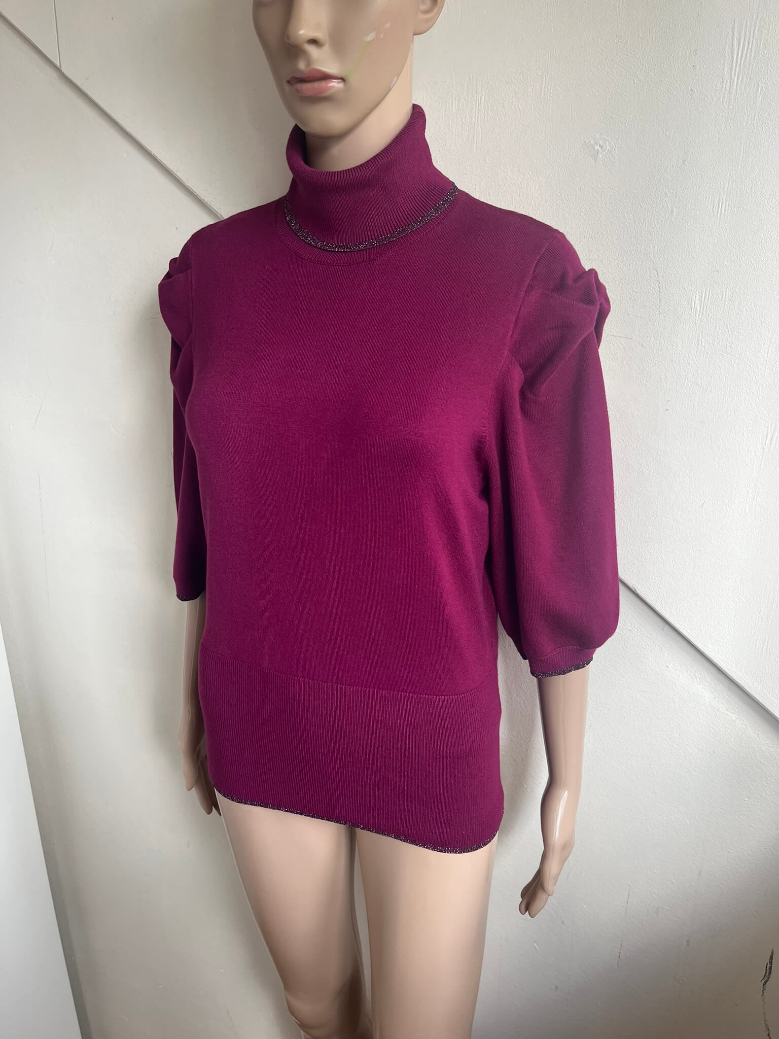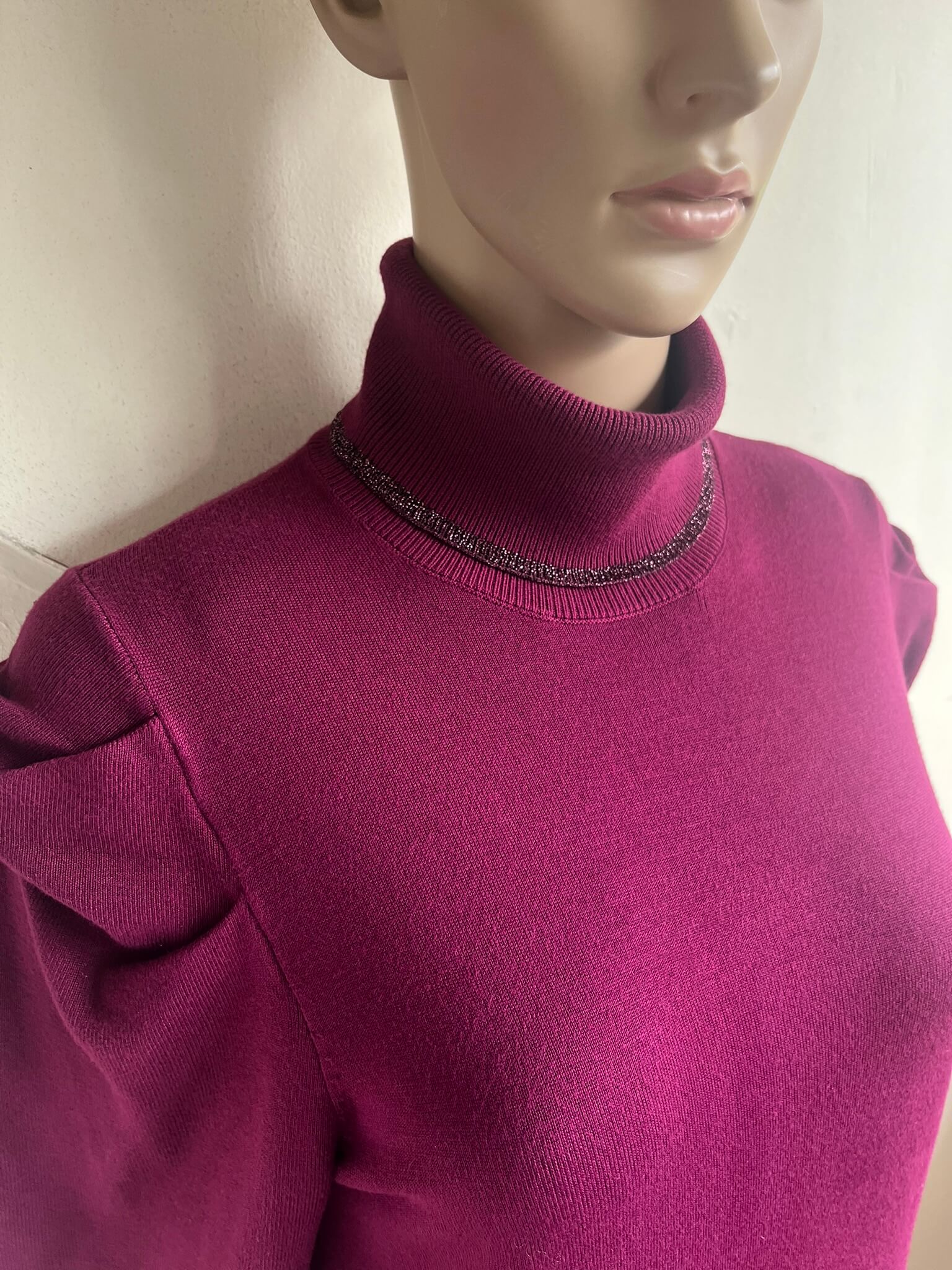 Mooie coltrui met leuke details en subtiele glitter in de stof in de maat M. De kleur is paars / roze ; magenta. In het label staat maat L maar valt een maatje kleiner. Gemaakt van viscose en polyamide. Oksellengte 48 cm en lengte 58 cm.