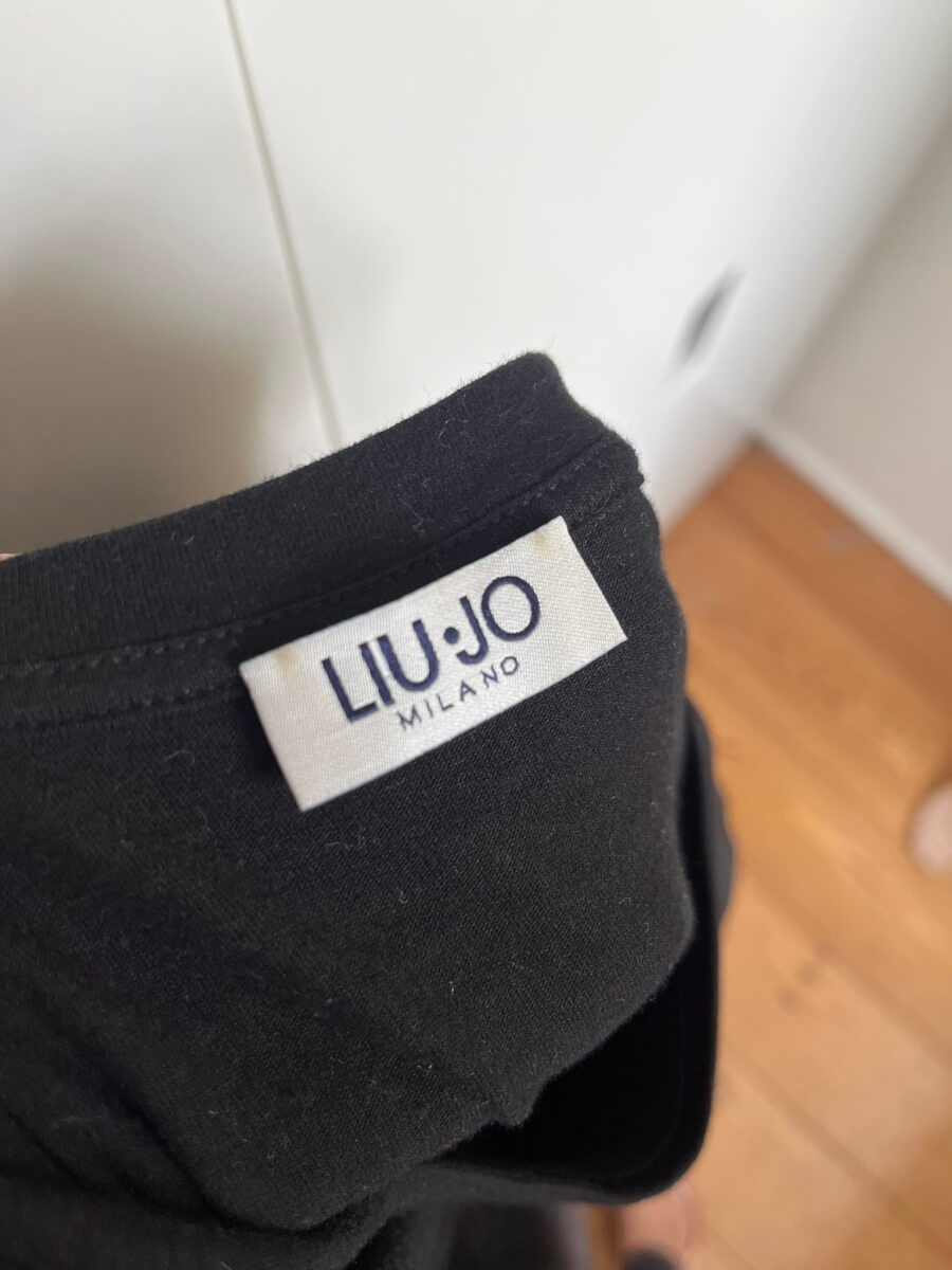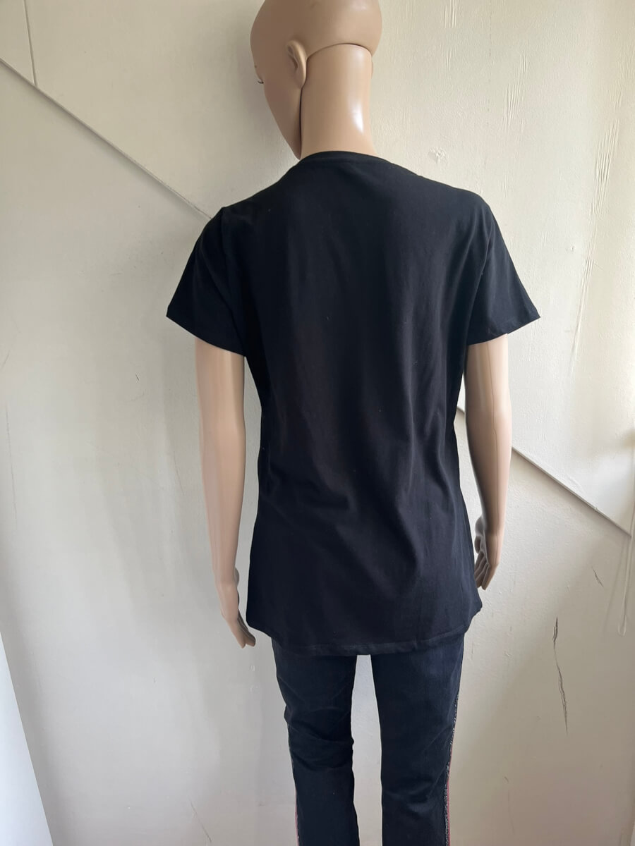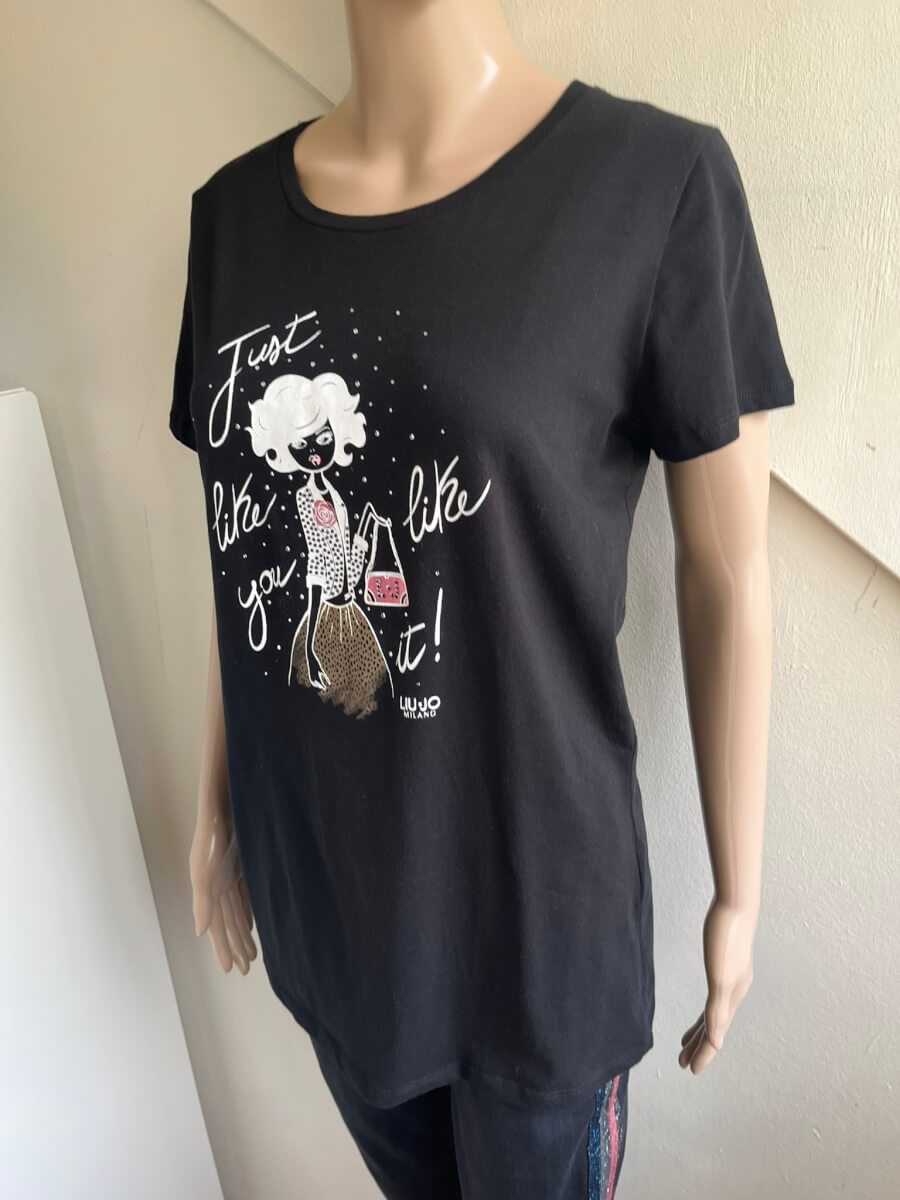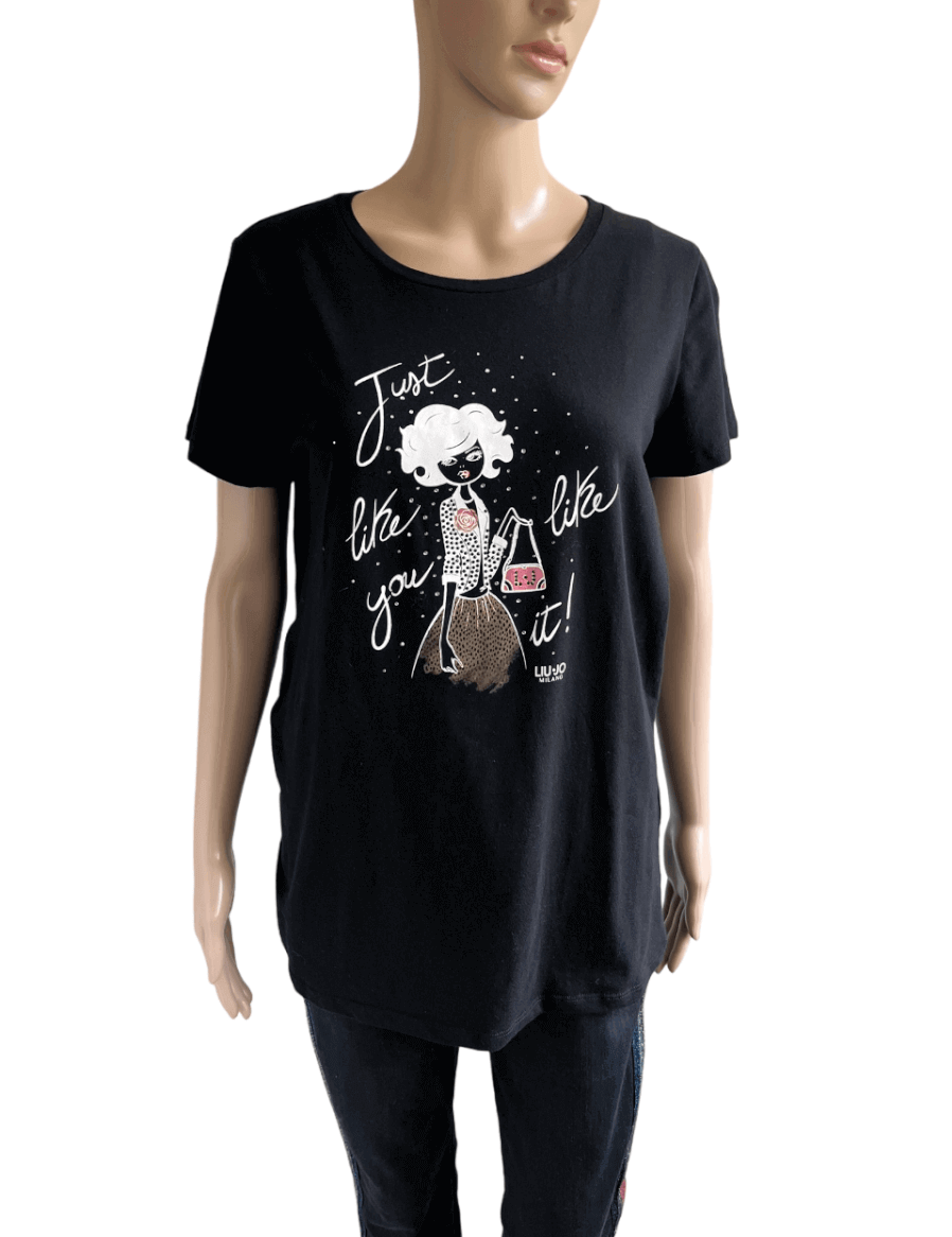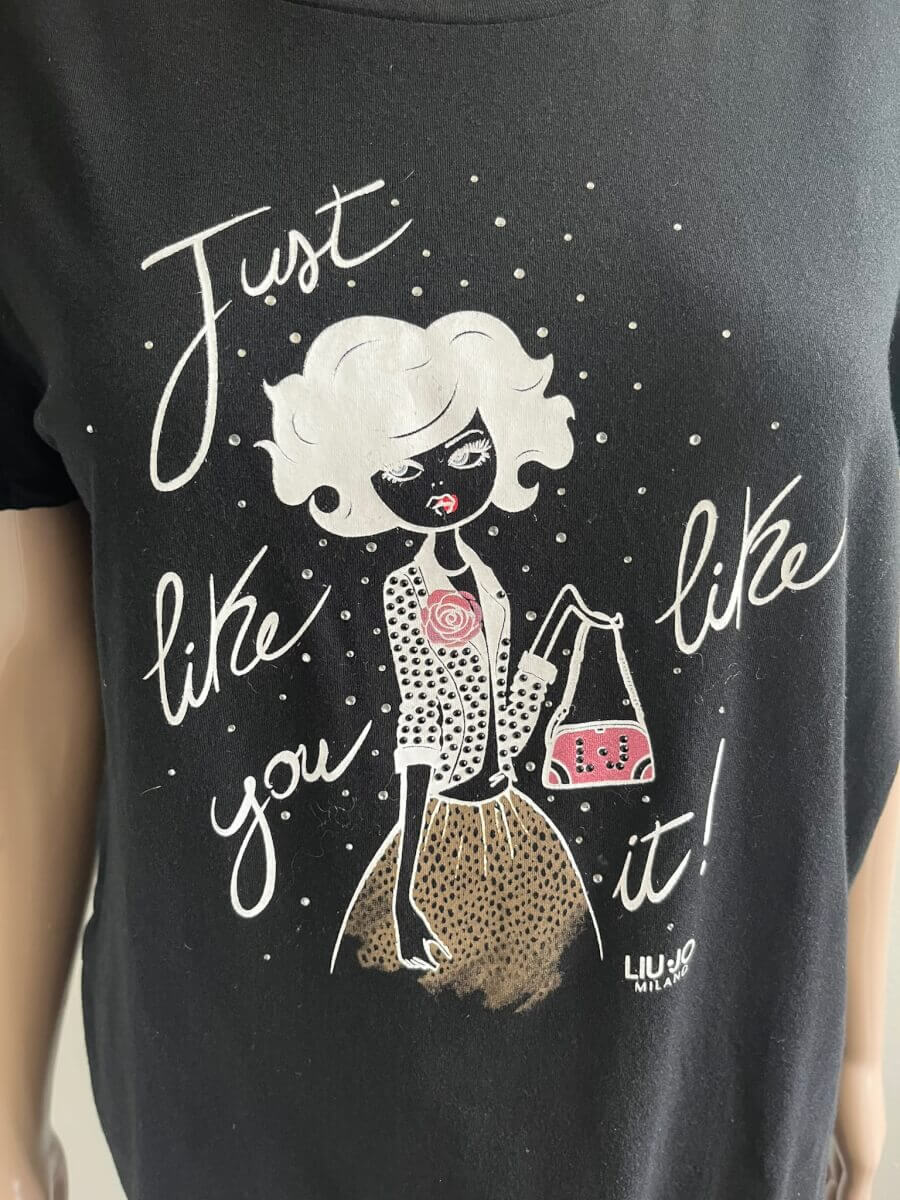 Zwart t-shirt of top met een print en tekst (just like you like it) en bewerkt met strass steentjes in de maat 40. In label staat maat xl, maar valt als een maat 40 want oksellengte is 50 cm en lengte is 68 cm. Gemaakt van katoen en elastaan.
