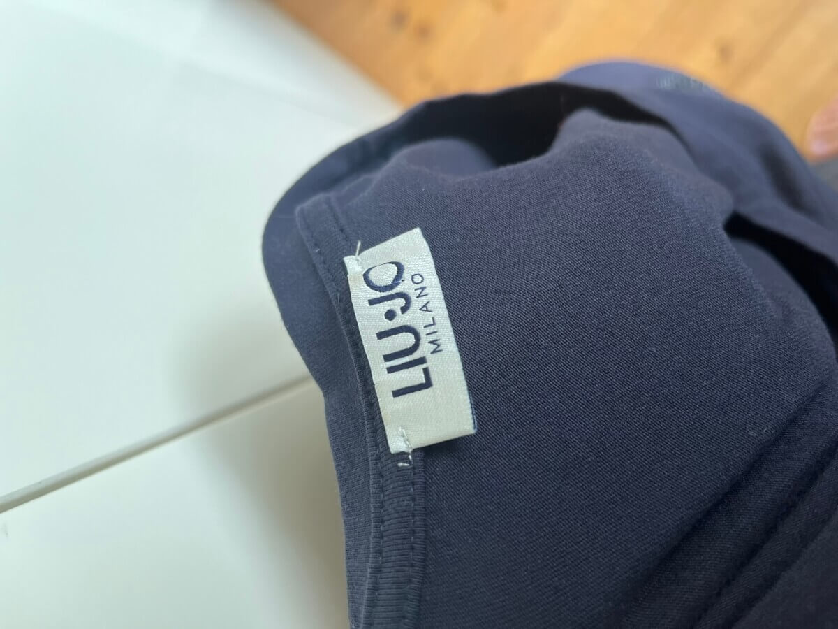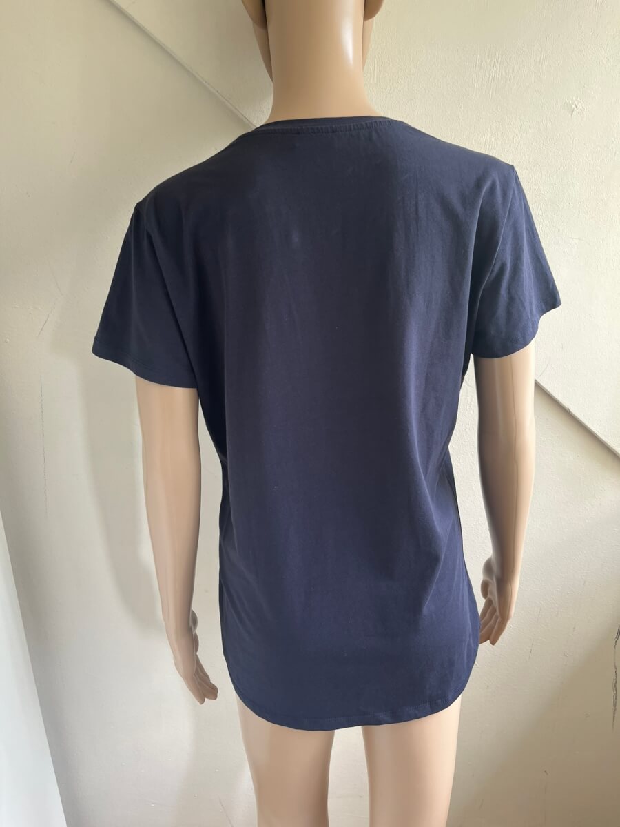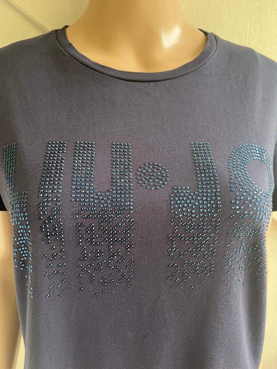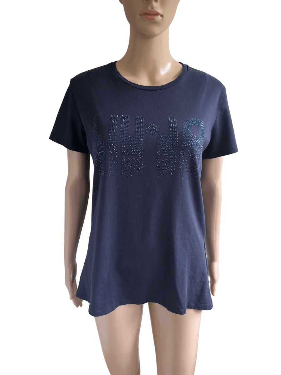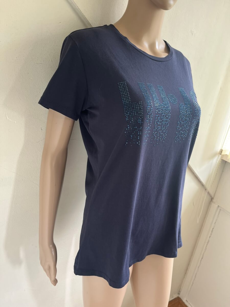 Donkerblauwe top met blauwe kleine steentjes studjes met de tekst Liu Jo. Maat in het label is L , valt denk ik het beste bij maat 40. Oksellengte 52 cm en lengte 65 cm. Gemaakt van katoen en elastaan.