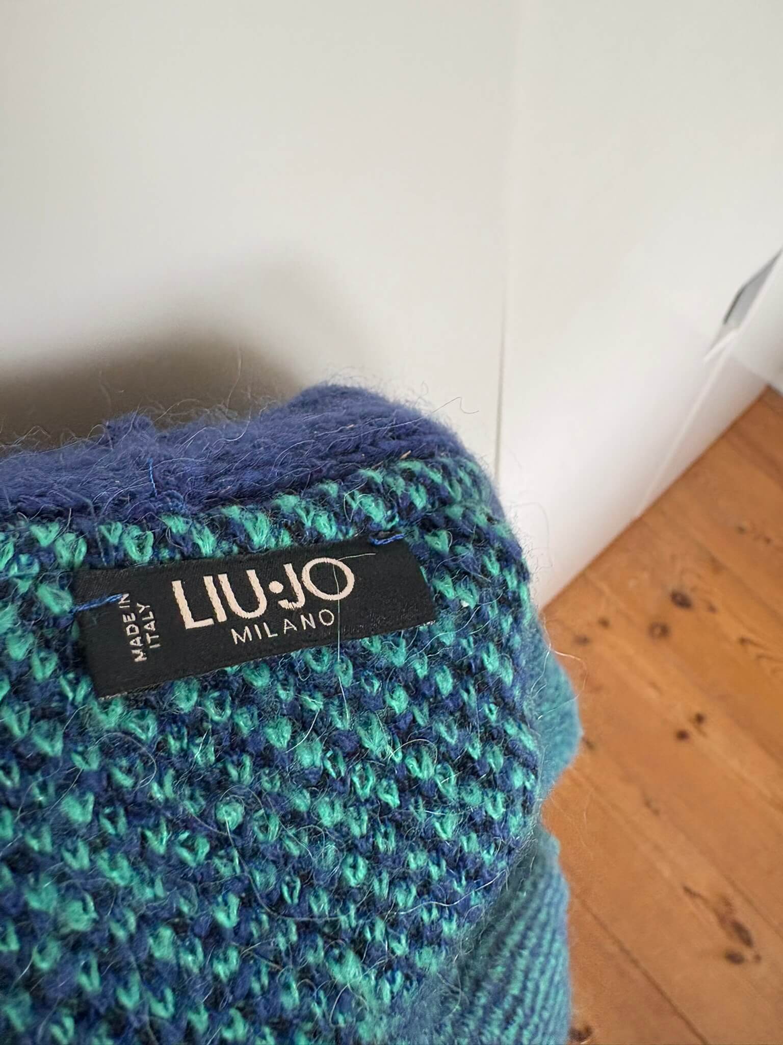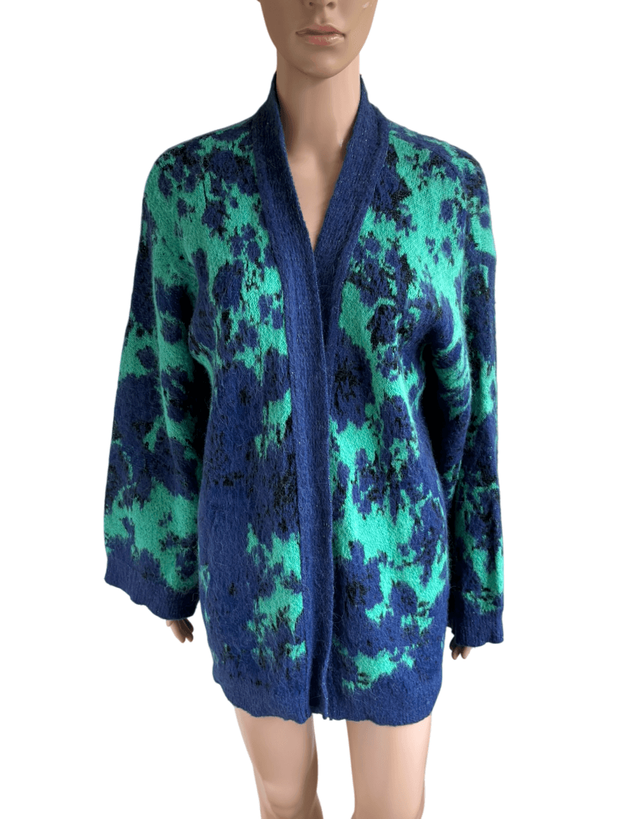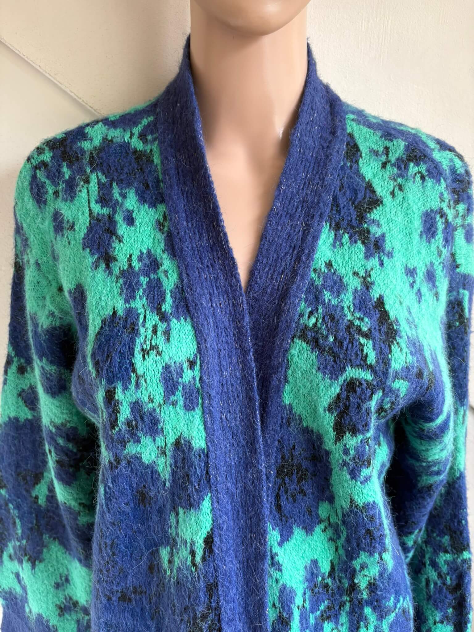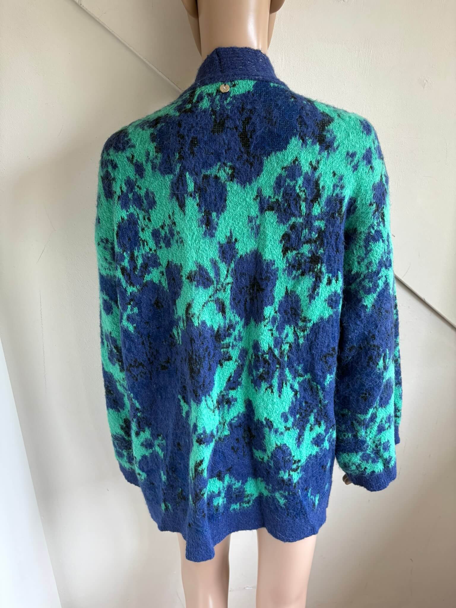 Mooi open vest met een turquoise en blauw motief in de maat S. Valt oversized of ruim, dus een maat 38 of 40 zou ook nog kunnen. Oksellengte is 56 cm en lengte is 72 cm. Gemaakt van polyamide, acryllic, alpaca, polyester en metaal fibre.