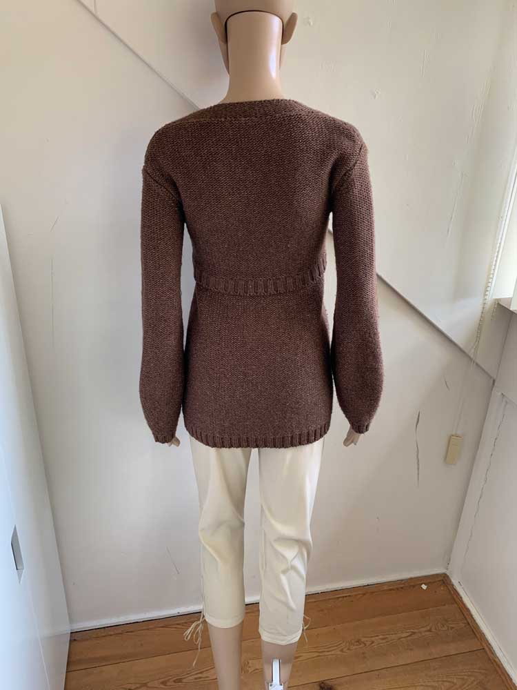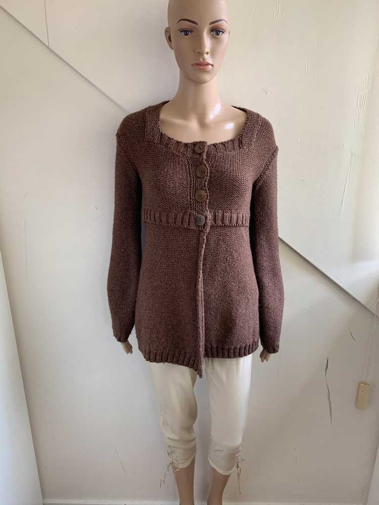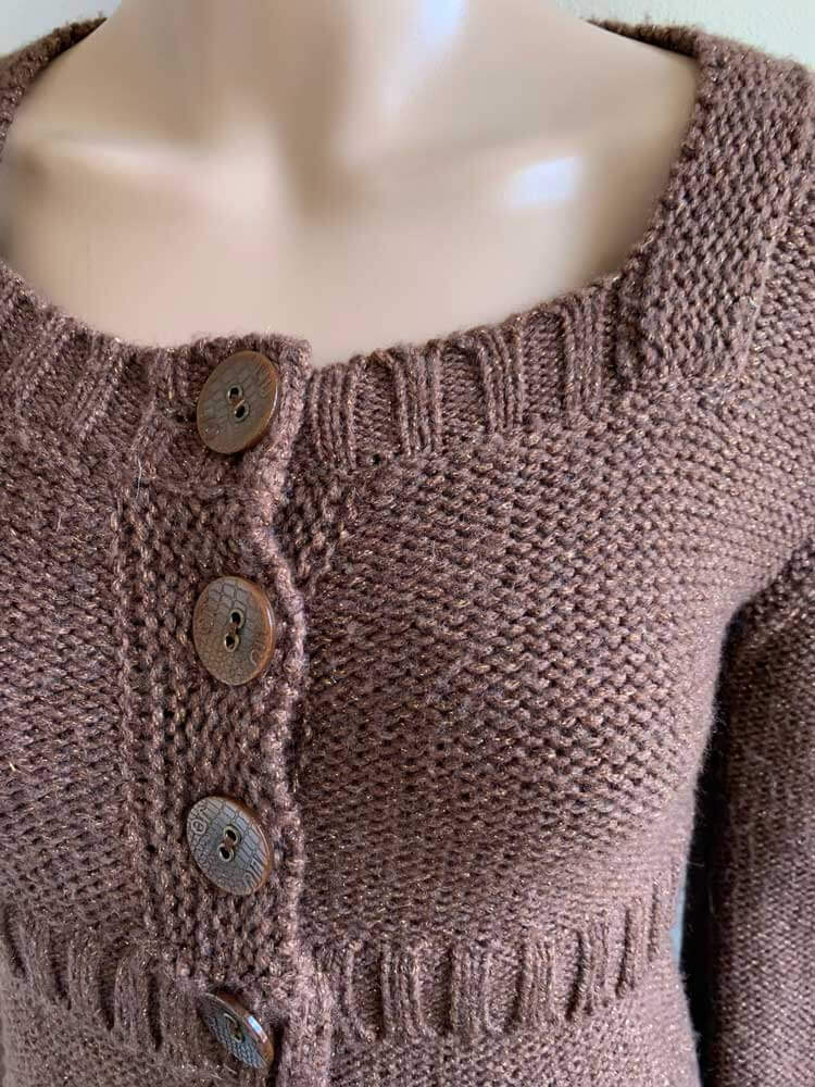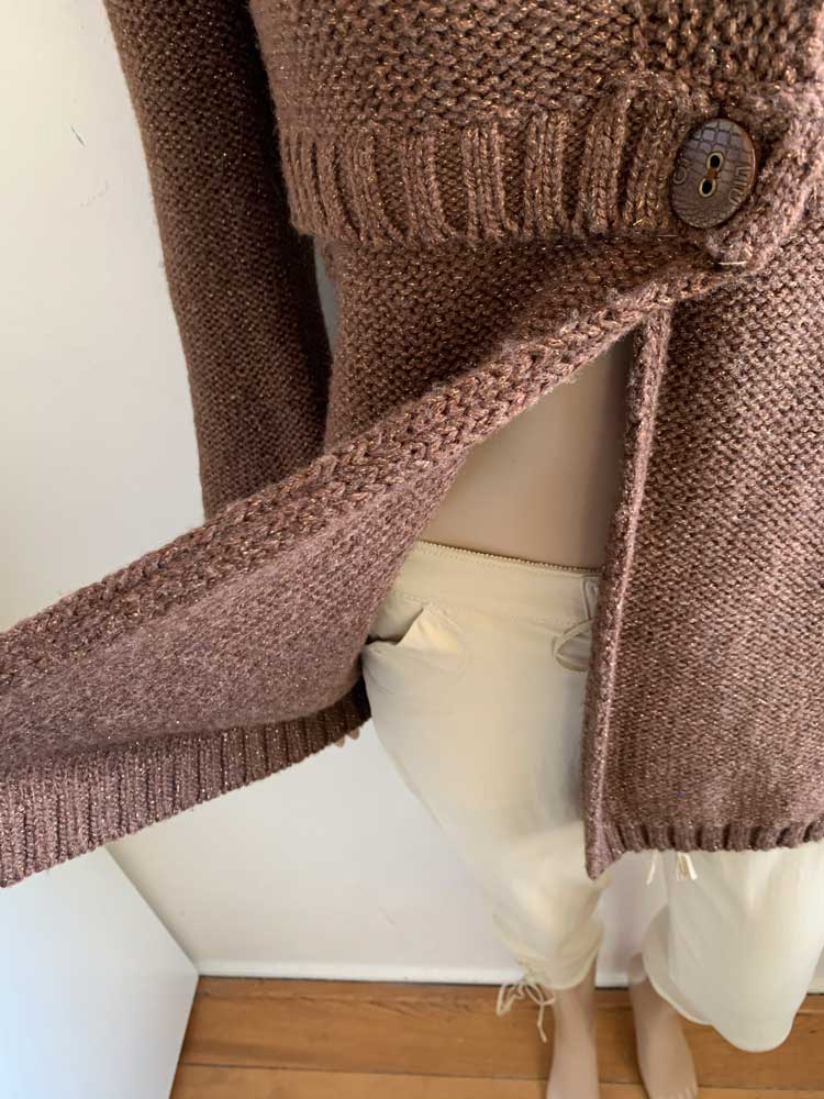 Bruin vest met subtie goudgloed in de maat 36. Bovenste gedeelte knopen en onderste valt los. Gemaakt van acryl, wol, polyester en polyamide. Oksellengte 45 cm.