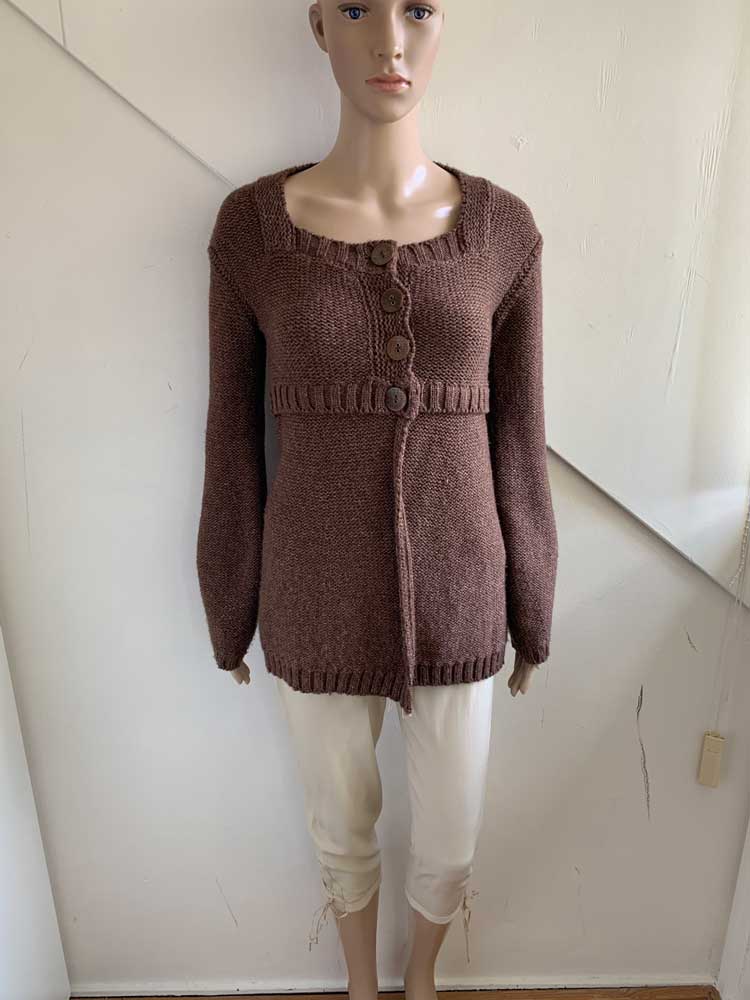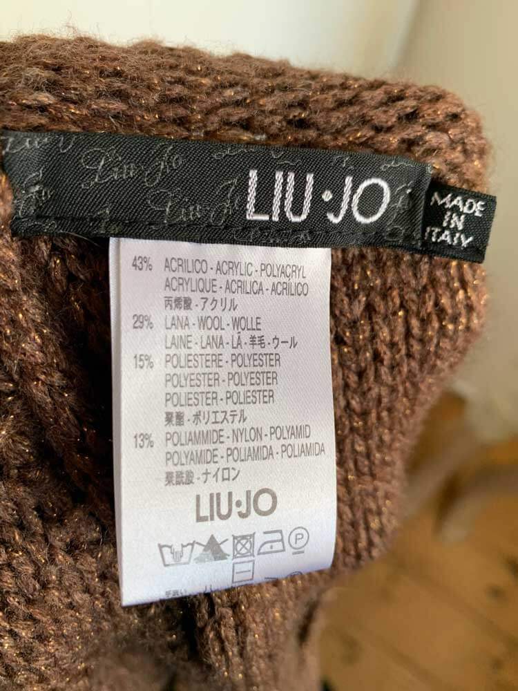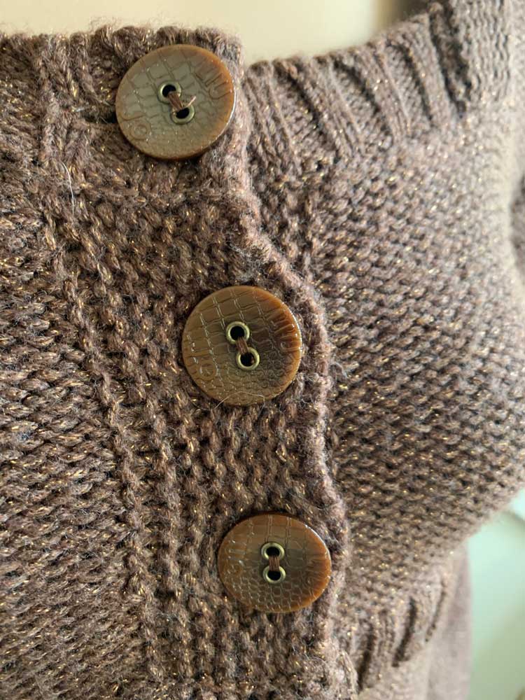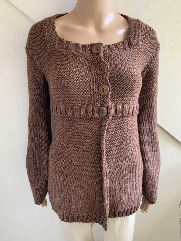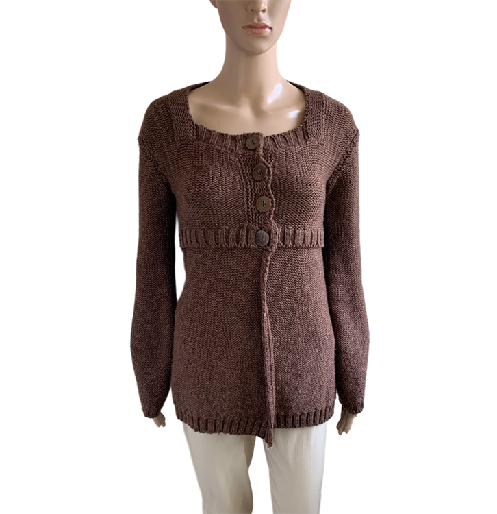 Bruin vest met subtie goudgloed in de maat 36. Bovenste gedeelte knopen en onderste valt los. Gemaakt van acryl, wol, polyester en polyamide. Oksellengte 45 cm.