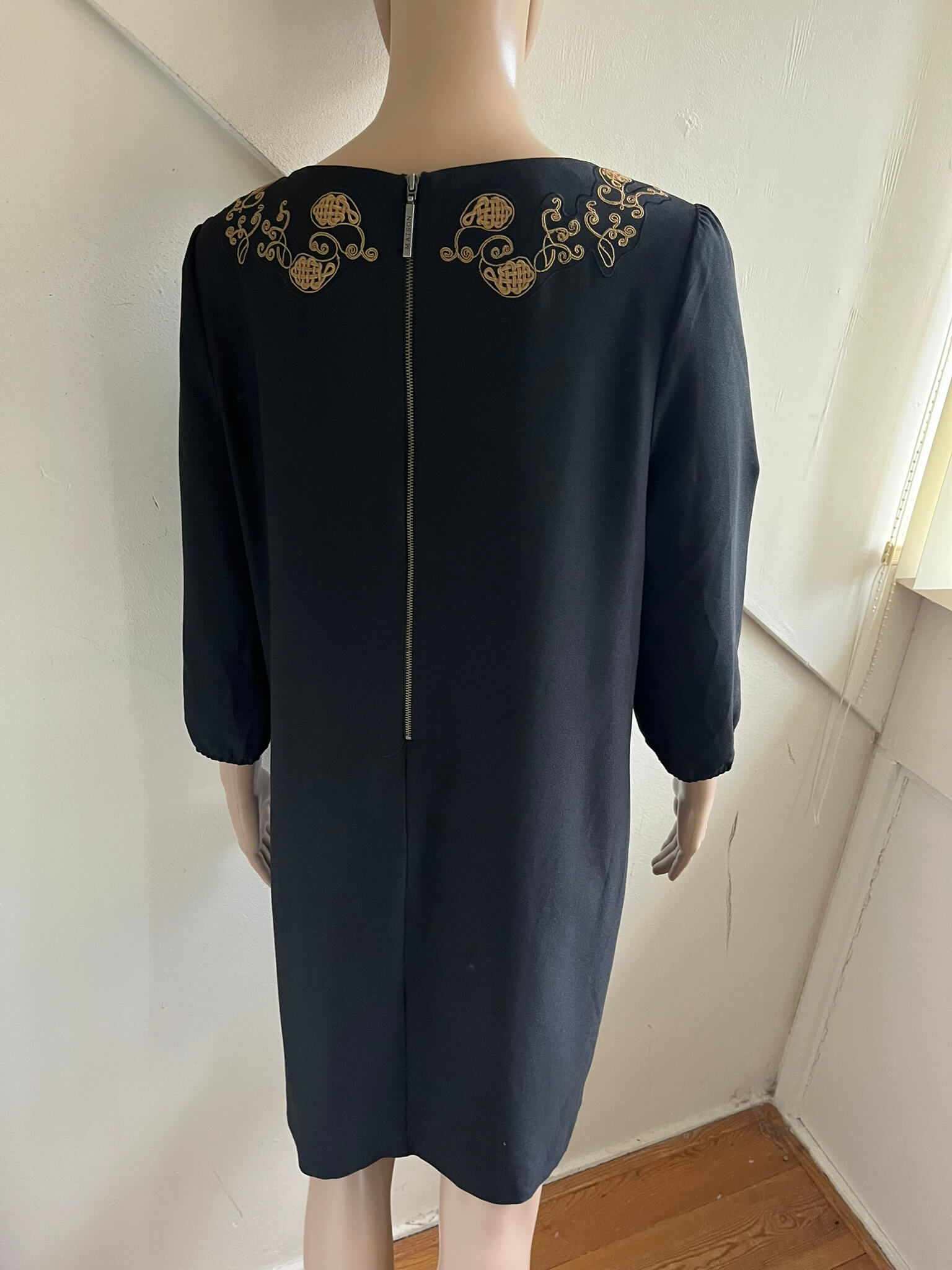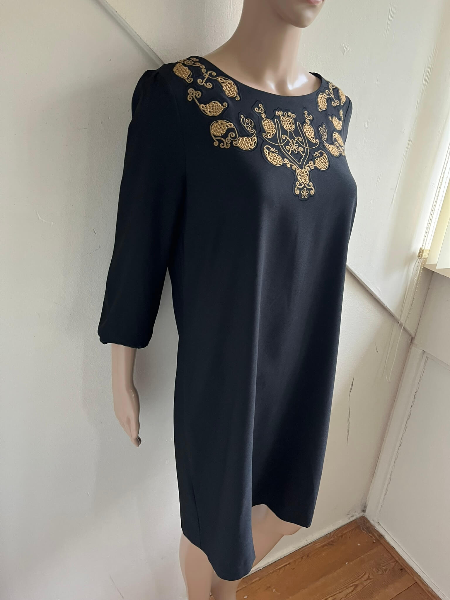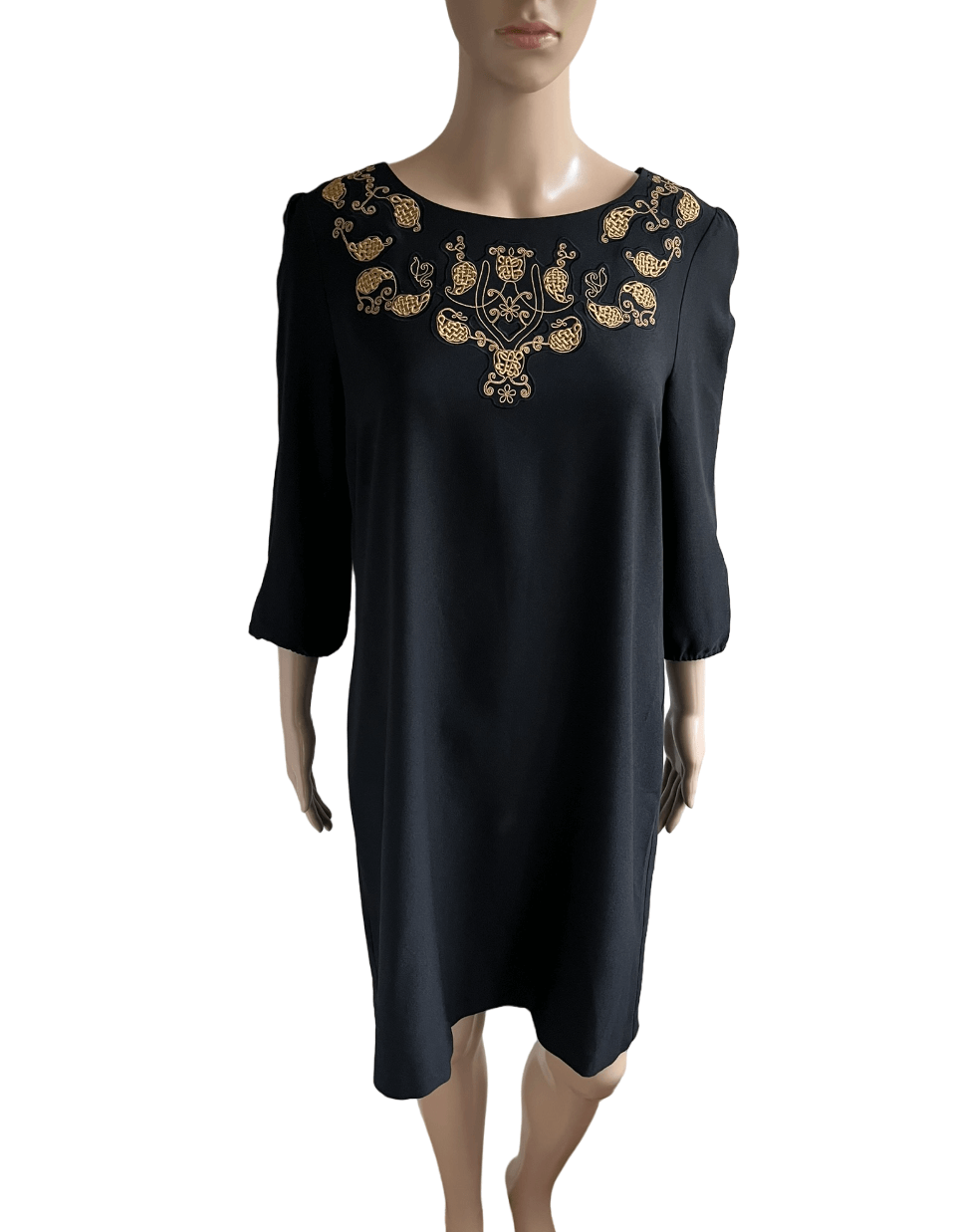 Zwarte jurk met driekwartsmouwen en bewerkt met goudbruine  borduursels in de maat 2 = 38. Materiaallabel ontbreekt. Oksellengte 49 cm en lengte 93 cm.