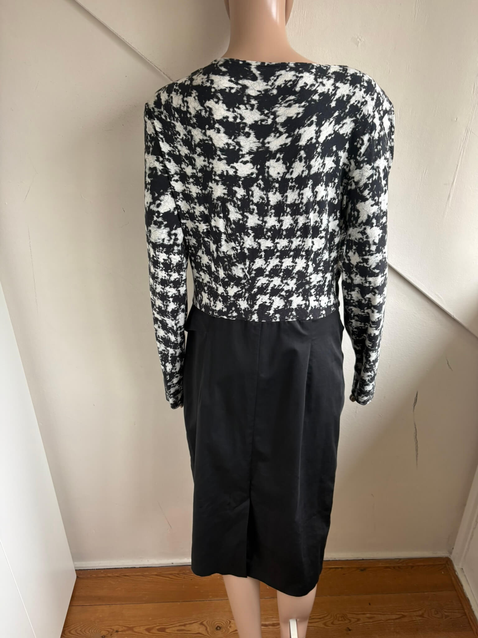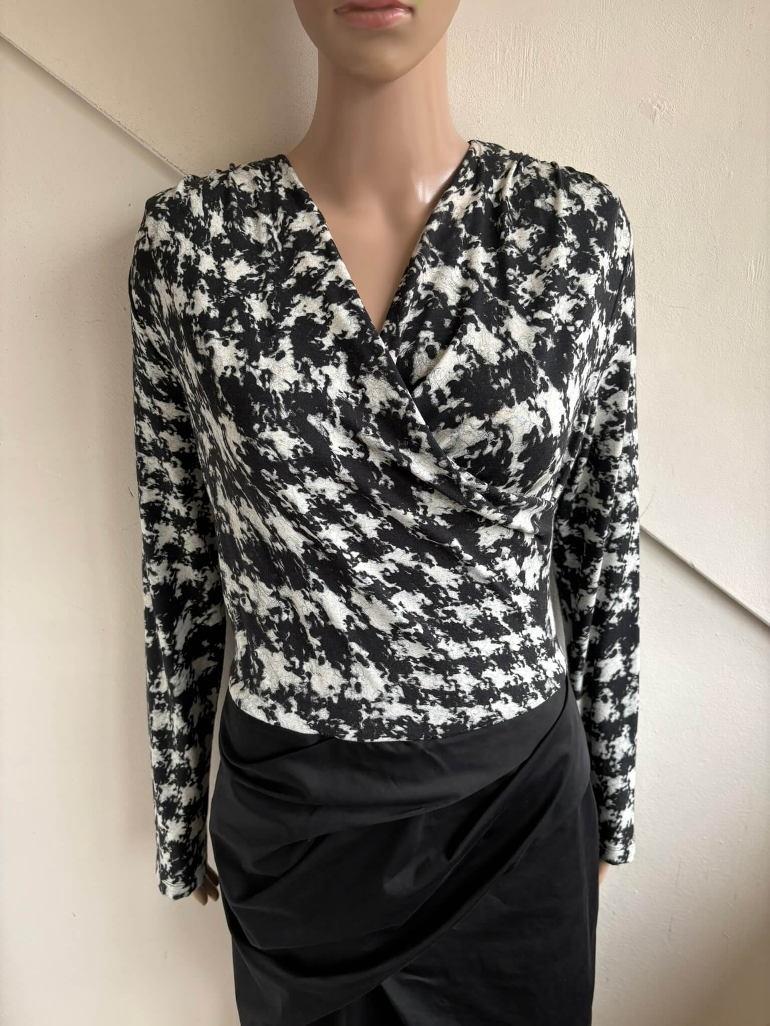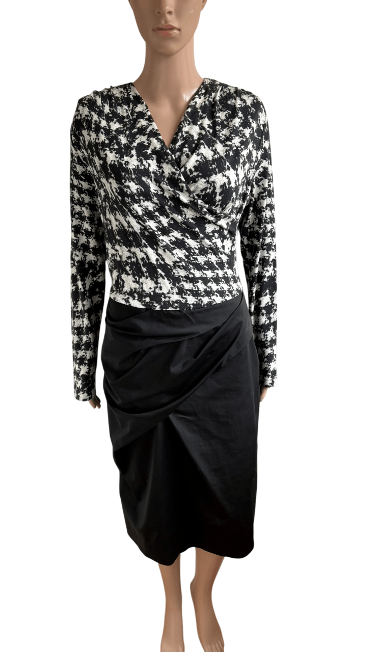 Feestelijke overslag jurk met een zwart rokgedeelte en een topgedeelte met een zwart witte print in de maat N5=42. Gemaakt van viscose, katoen en elastaan.