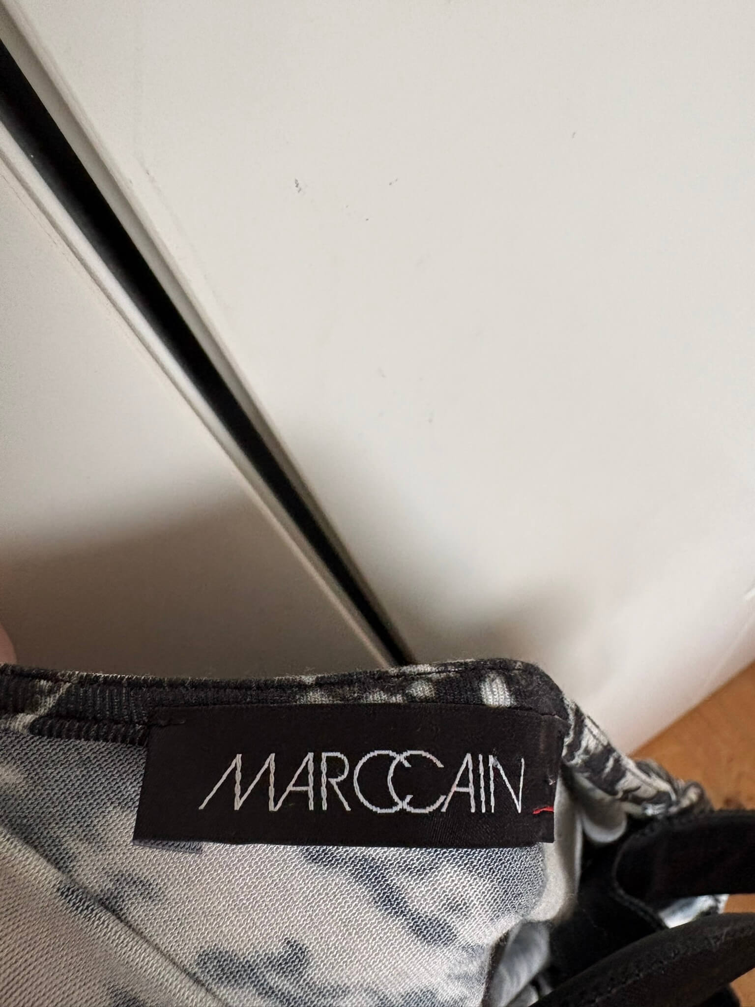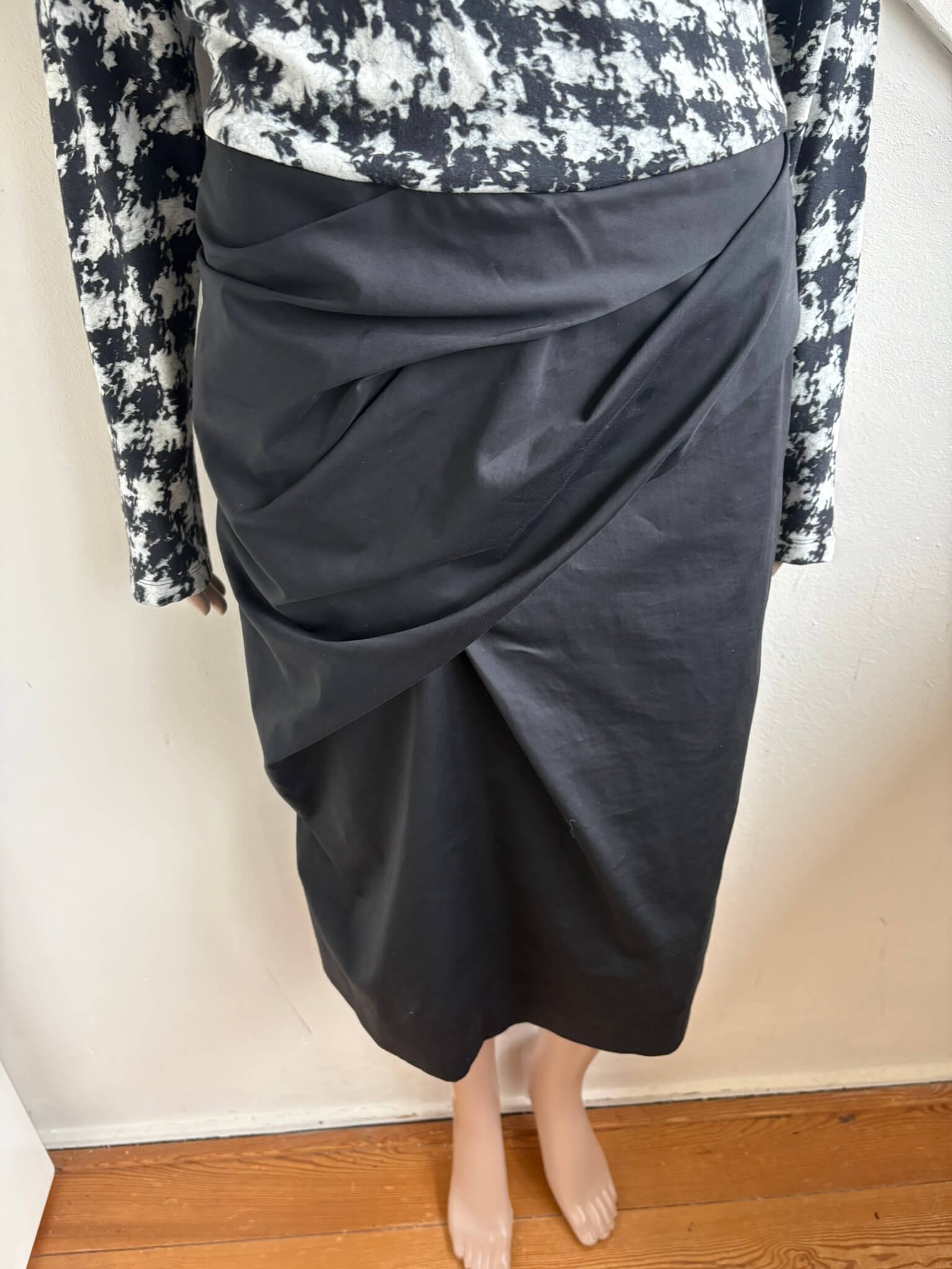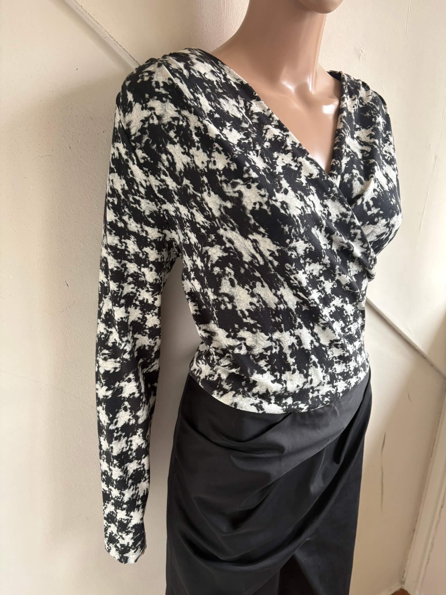 Feestelijke overslag jurk met een zwart rokgedeelte en een topgedeelte met een zwart witte print in de maat N5=42. Gemaakt van viscose, katoen en elastaan.