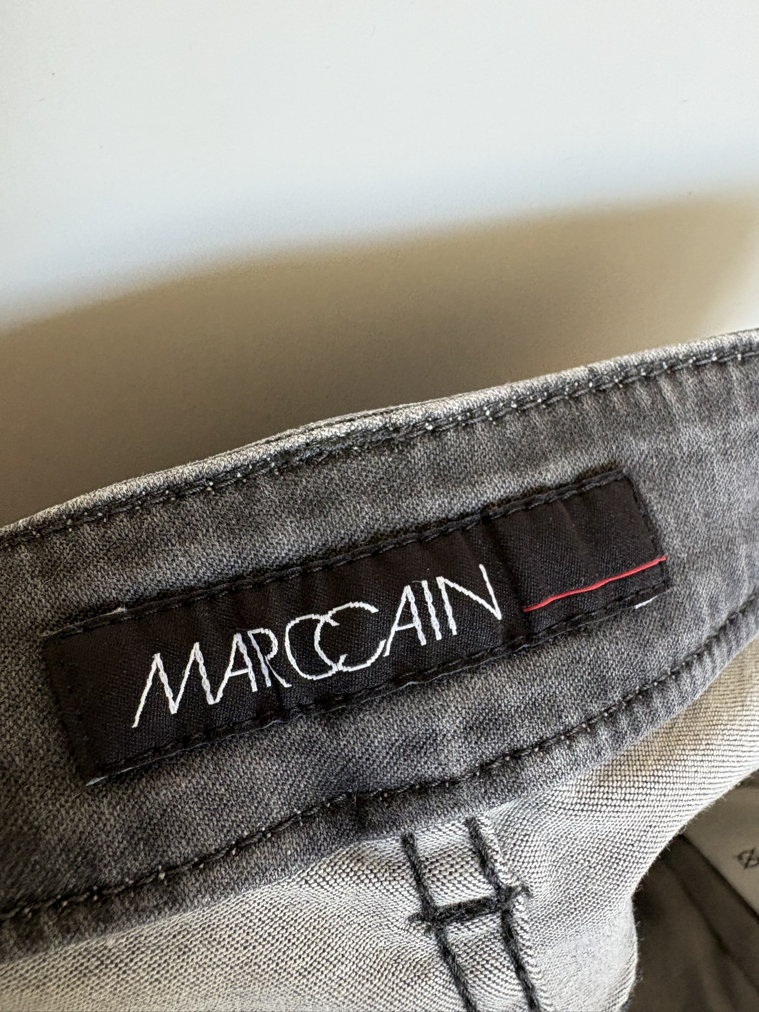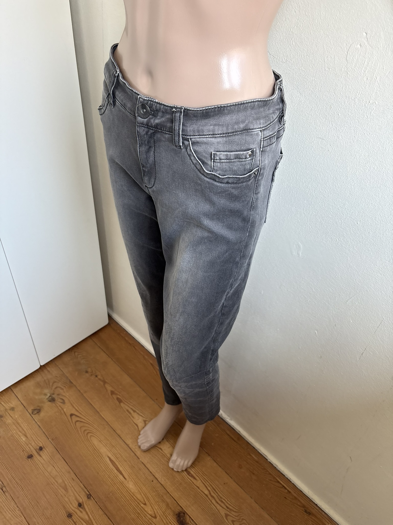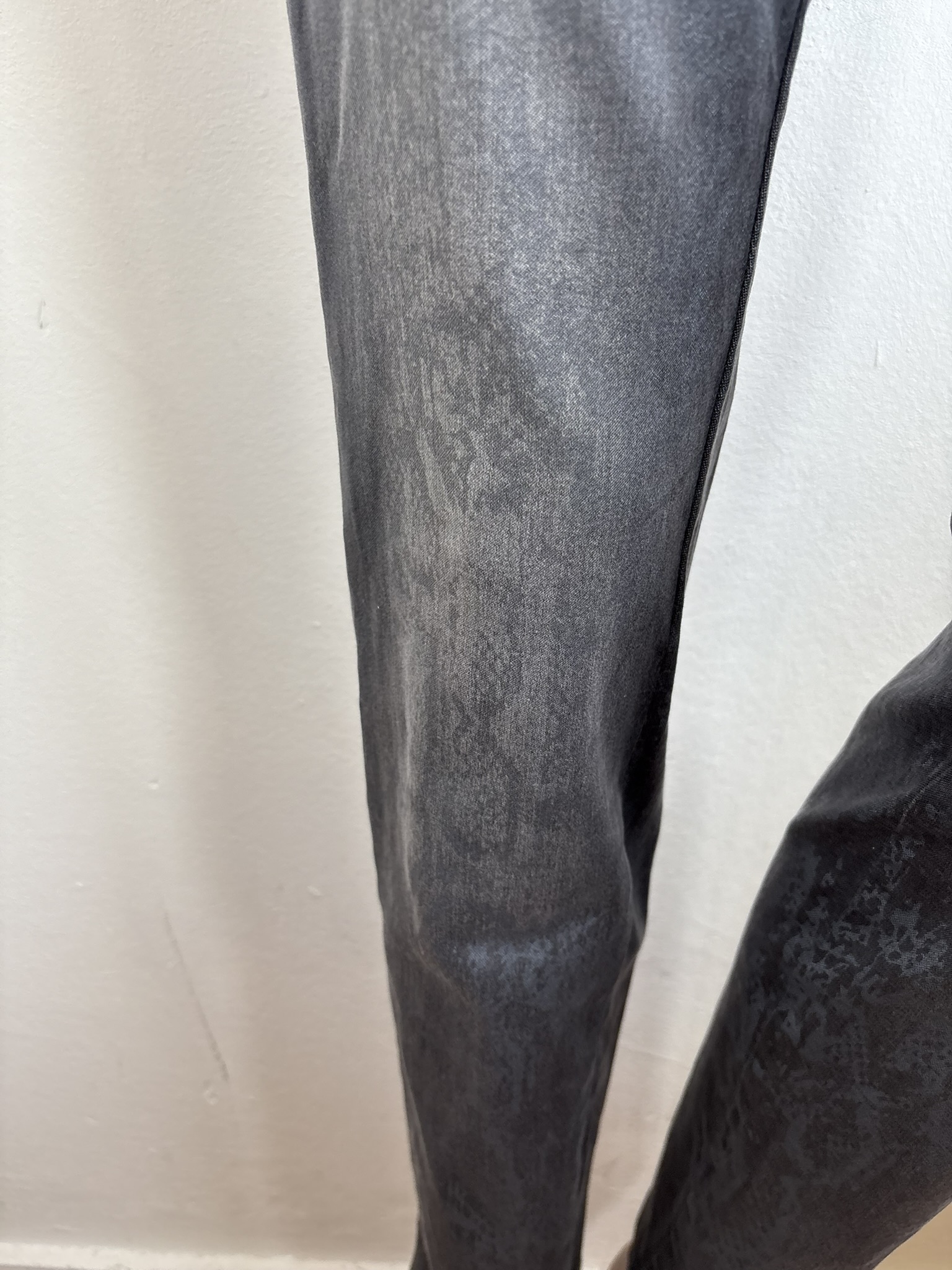 Grijze spijkerbroek met subtiele print op de onderste gedeelte van de pijpen in de maat N3 = 38. Valt als een smalle maat 38, taillewijdte 38 cm en lengte 97 cm.