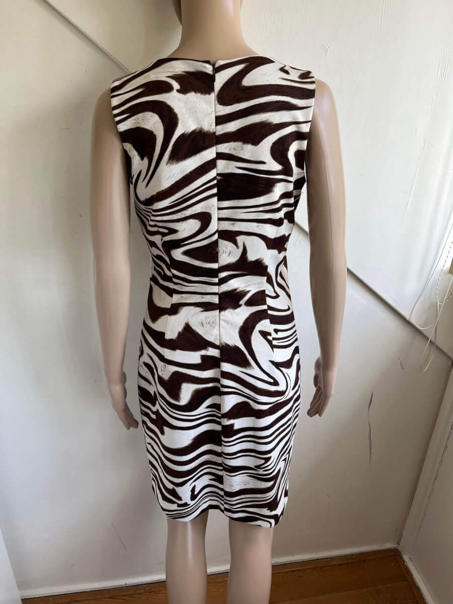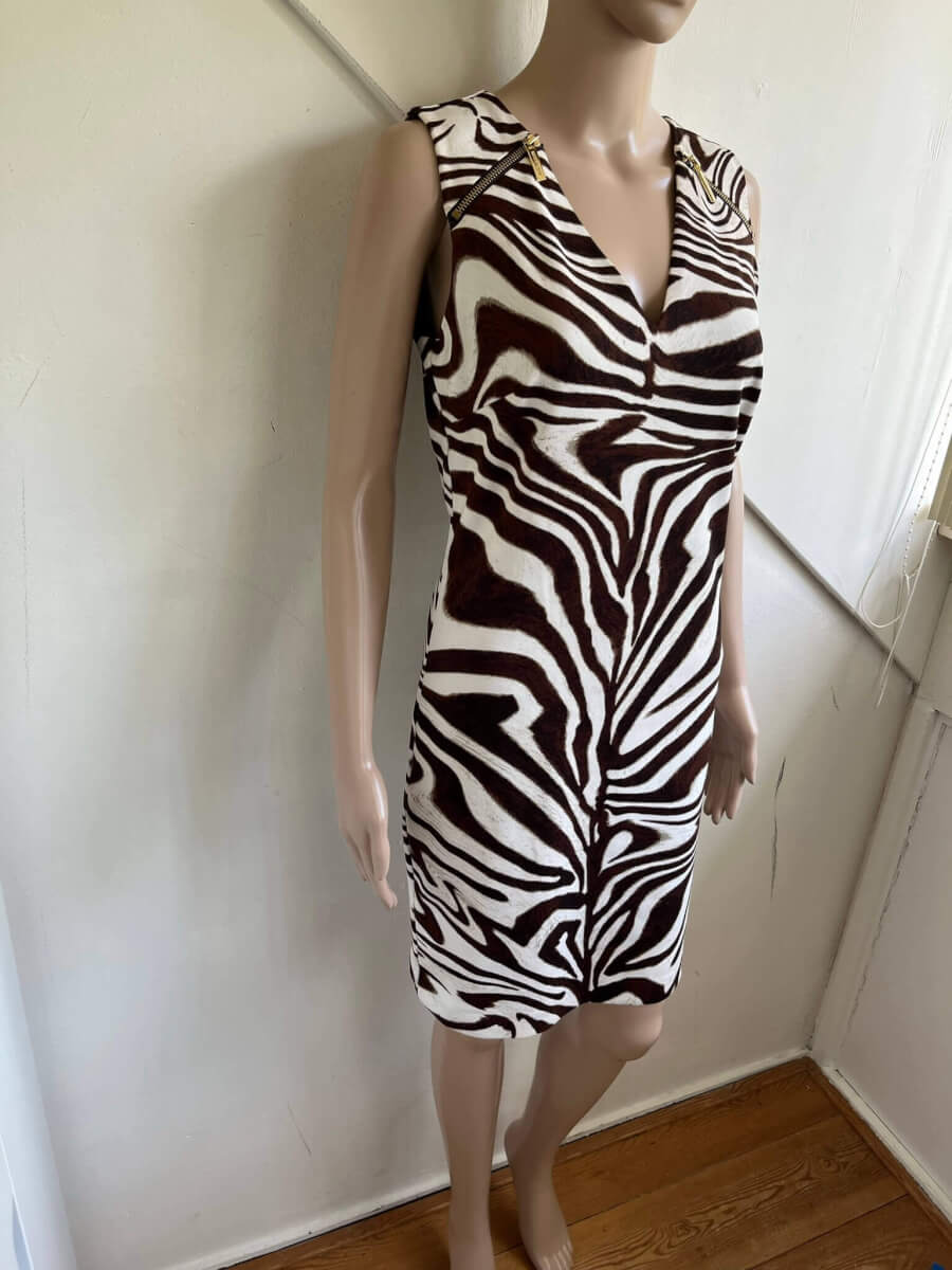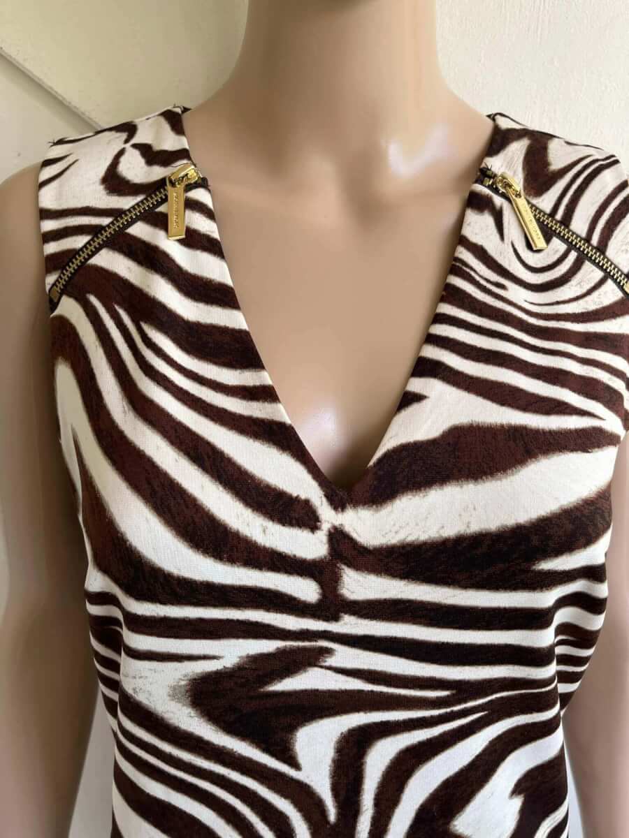 Prachtige gevoerde jurk met een wit beige bruine print in de maat S met ritsjes bij de schouders. De jurk is gemaakt van dikkere stof, polyester en spandex. In hele goede staat. Eventueel zou een maat 38 ook nog kunnen. Oksellengte 45 cm en lengte 88 cm. (oksellengte vergelijken met mouwloze top of jurk)