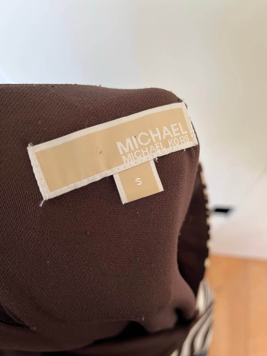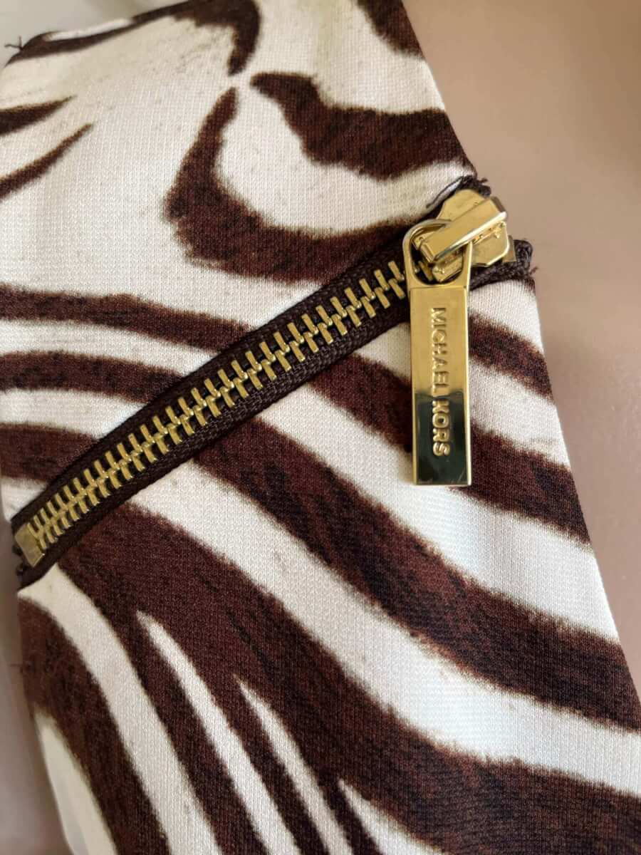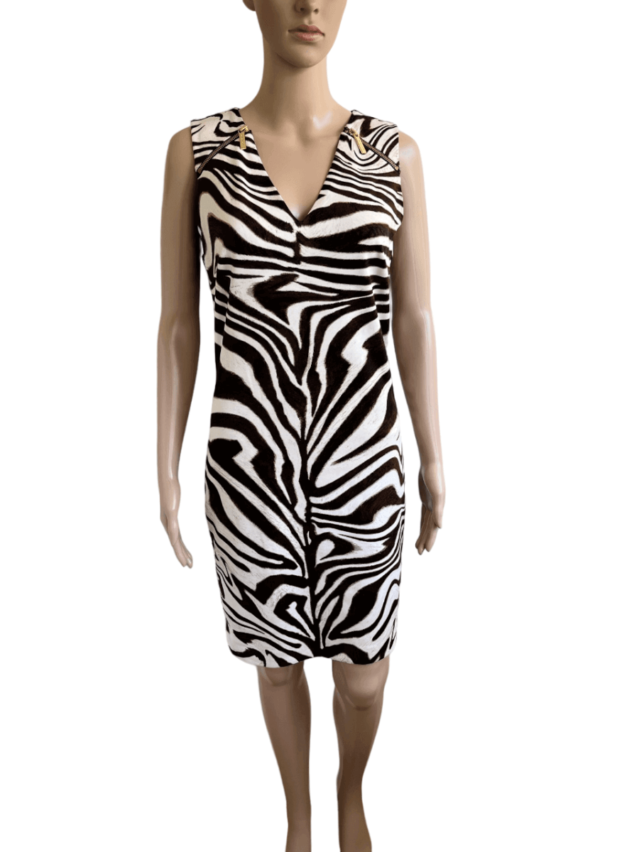 Prachtige gevoerde jurk met een wit beige bruine print in de maat S met ritsjes bij de schouders. De jurk is gemaakt van dikkere stof, polyester en spandex. In hele goede staat. Eventueel zou een maat 38 ook nog kunnen. Oksellengte 45 cm en lengte 88 cm. (oksellengte vergelijken met mouwloze top of jurk)