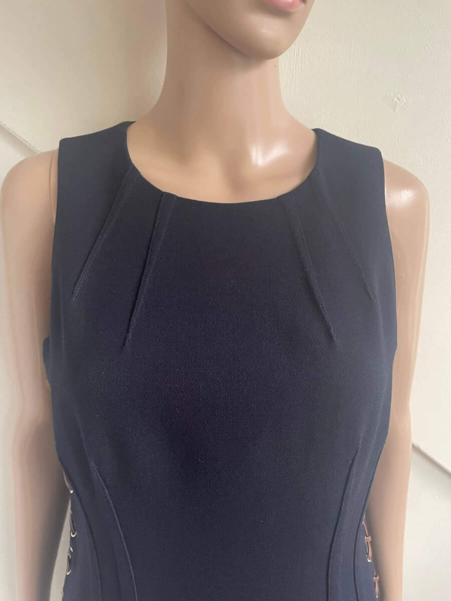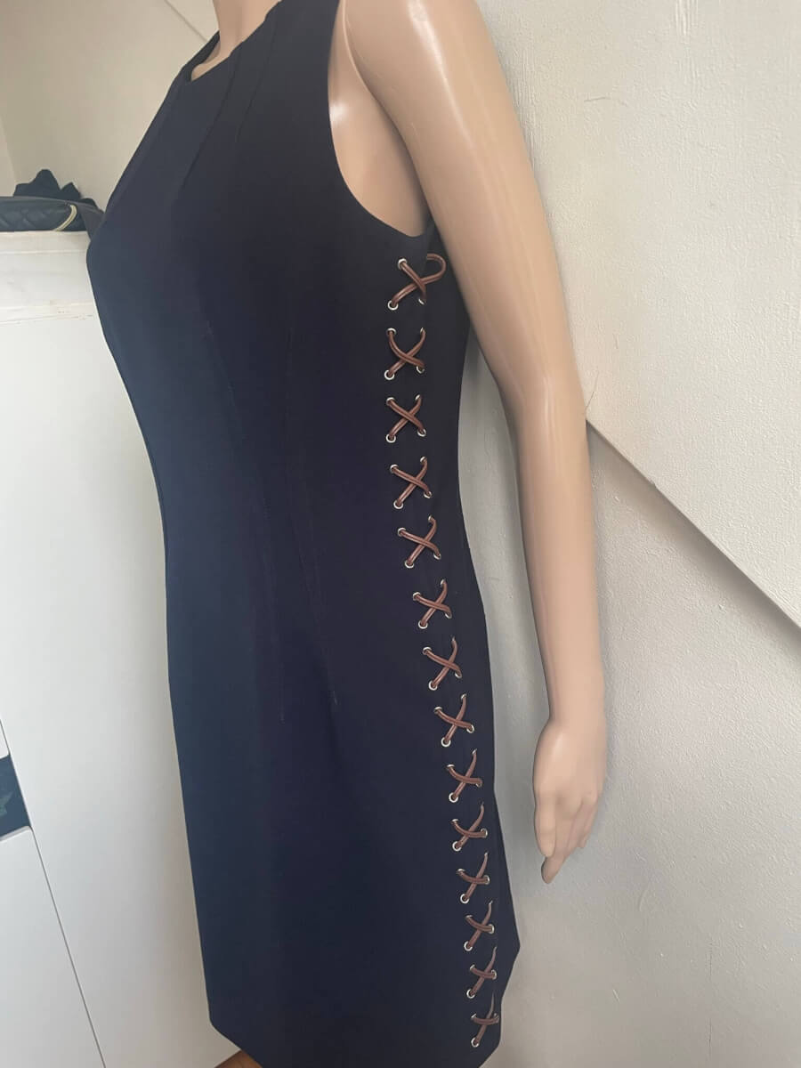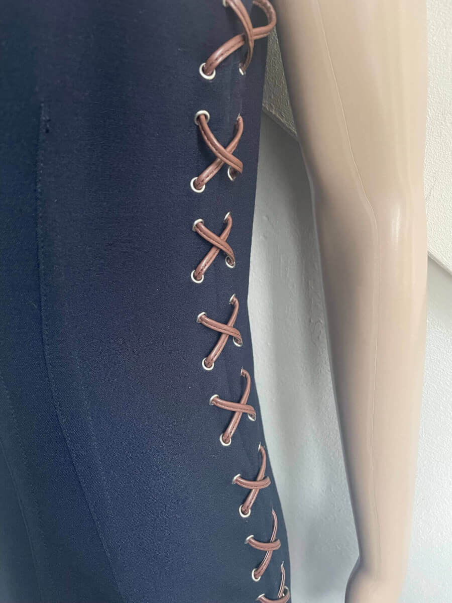 Donkerblauwe jurk gemaakt van dikkere zachte stof en met een bies van bruin fake leren gekruiste veters in de maat S . Gemaakt van polyester ,rayon en spandex. Oksellengte 46 cm en lengte is 89 cm.