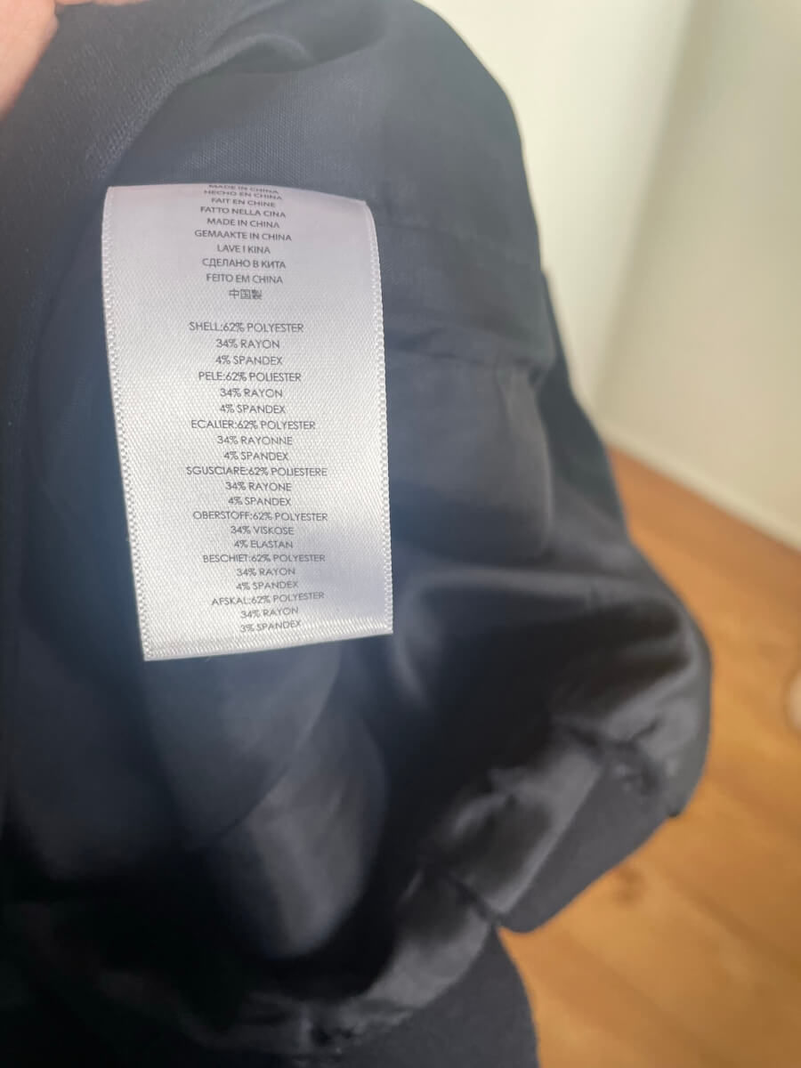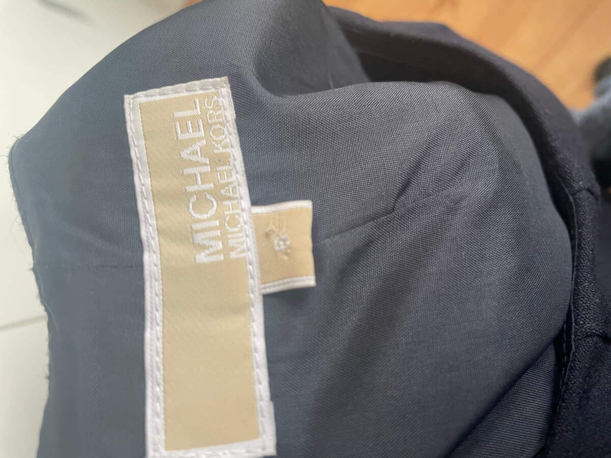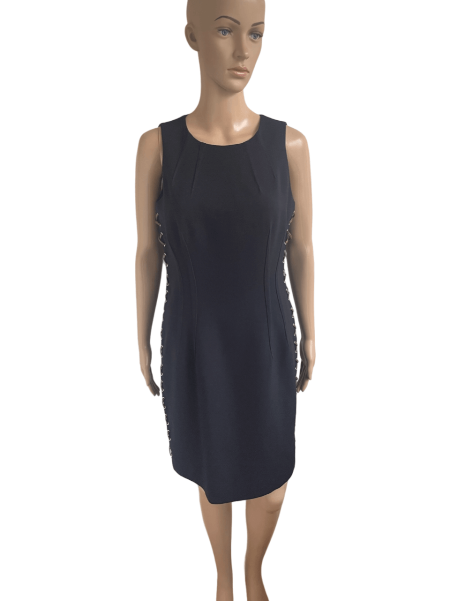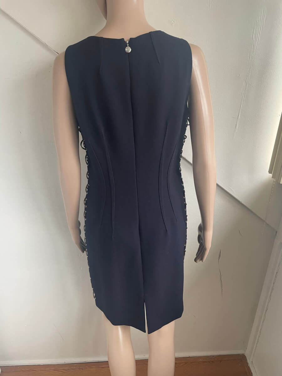 Donkerblauwe jurk gemaakt van dikkere zachte stof en met een bies van bruin fake leren gekruiste veters in de maat S . Gemaakt van polyester ,rayon en spandex. Oksellengte 46 cm en lengte is 89 cm.