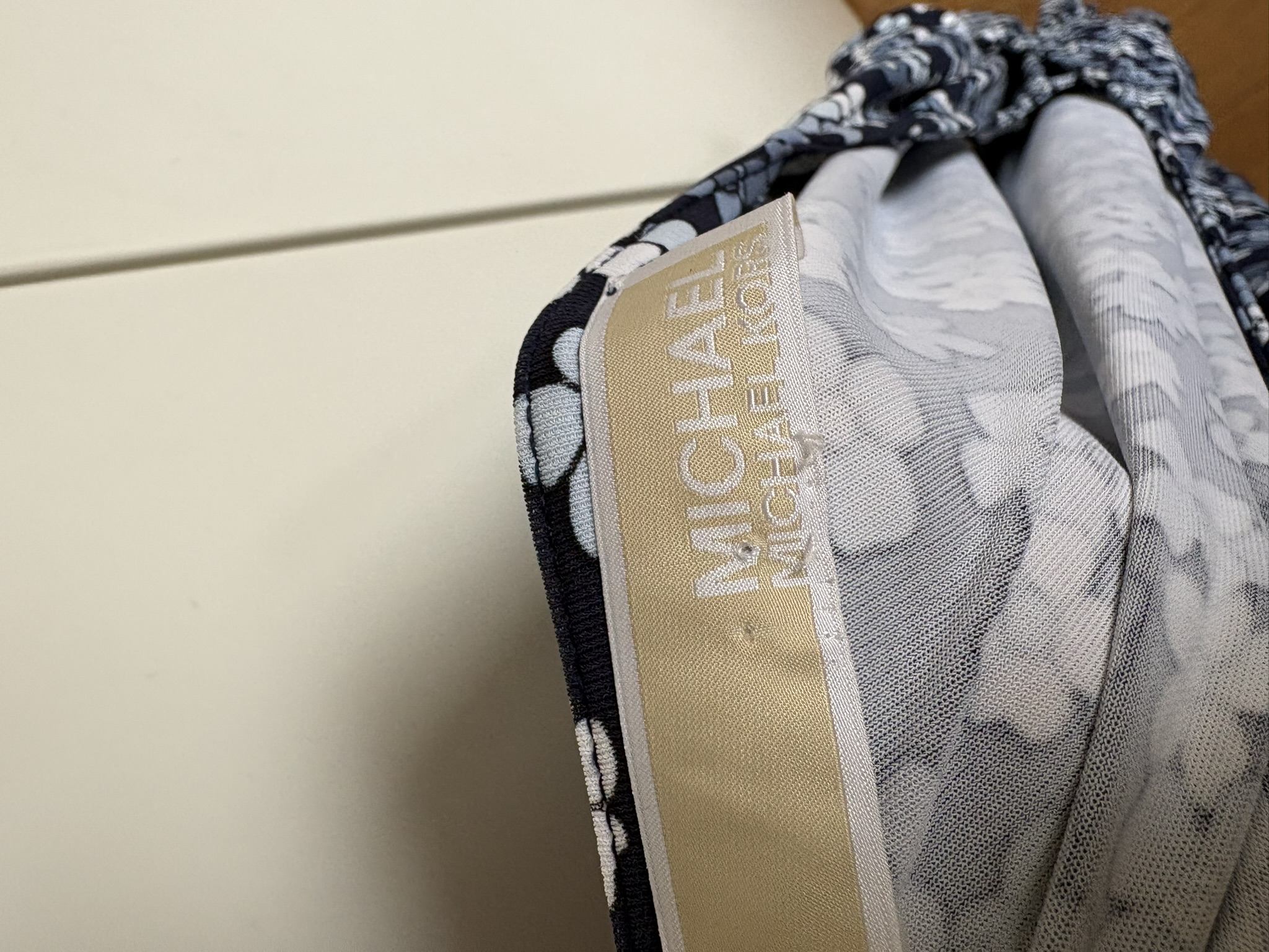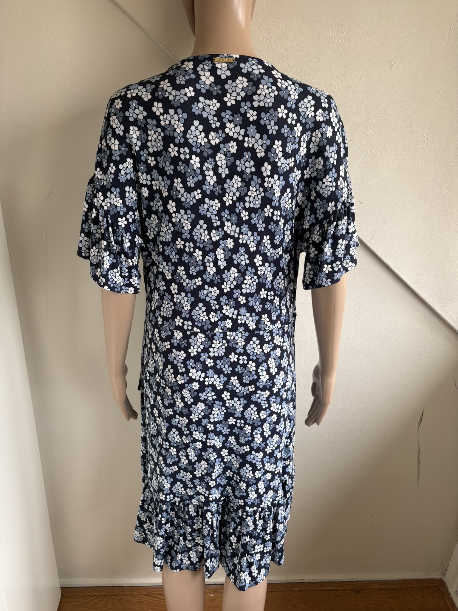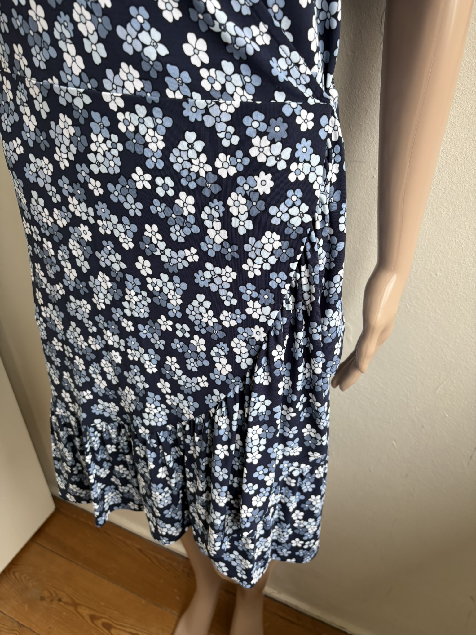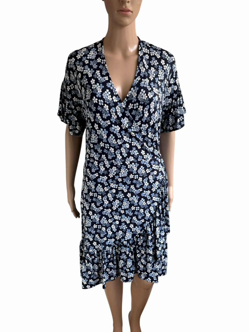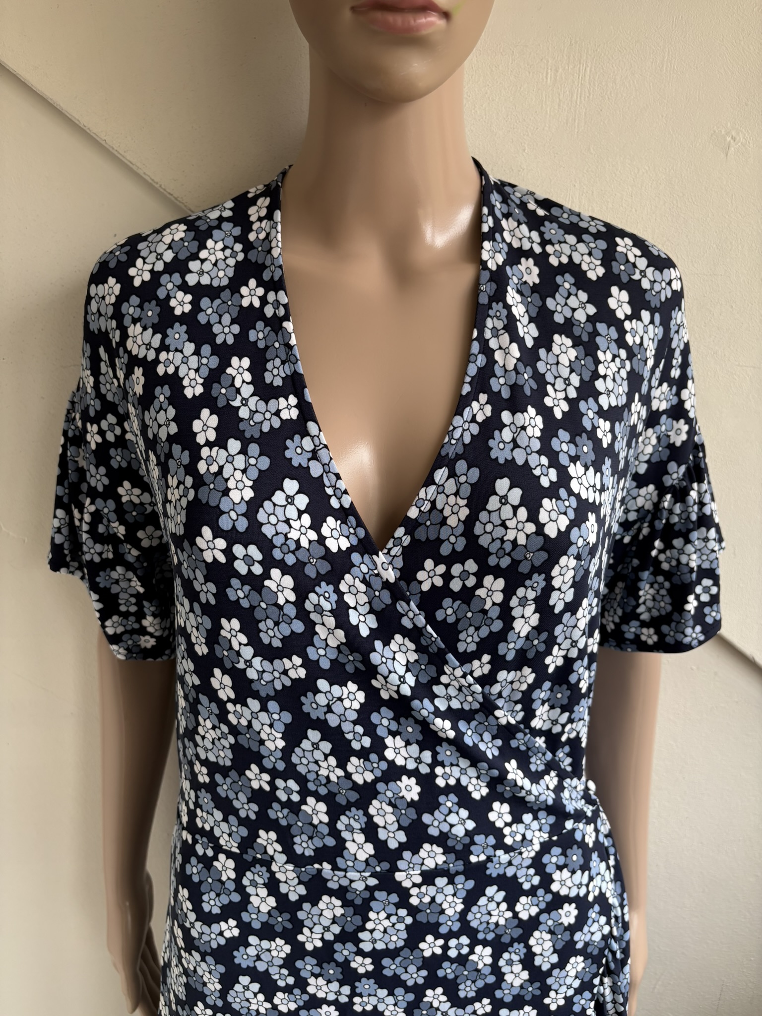 Donkerblauwe wikkeljurk / overslagjurk met lichtblauwe en witte bloemenprint in de maat M. De jurk heeft roezels op het rokgedeelte en heeft een oksellengte van 48 cm en een lengte van 98 cm. Gemaakt van wat dikker niet kreukend materiaal, materiaallabel ontbreekt.