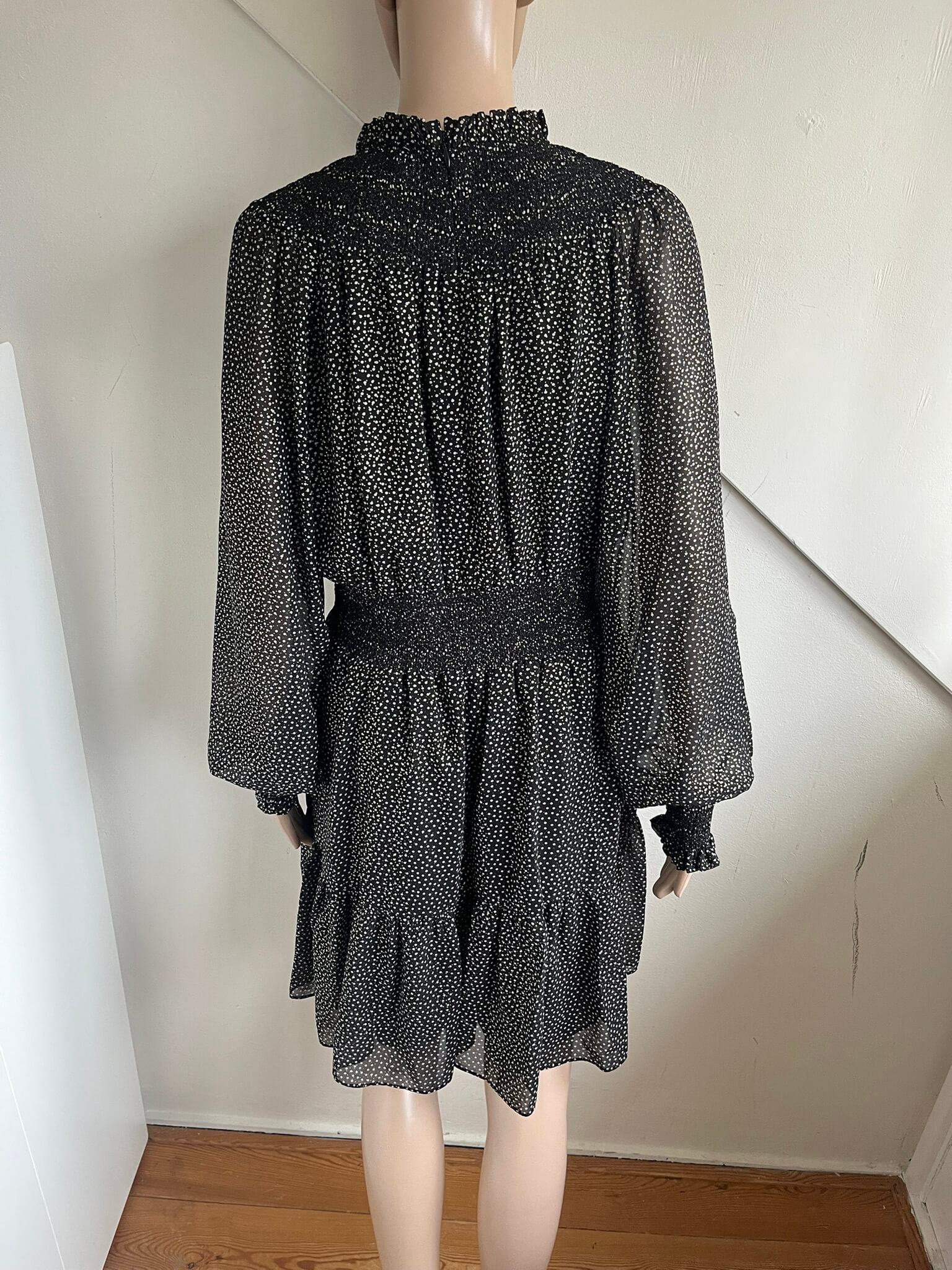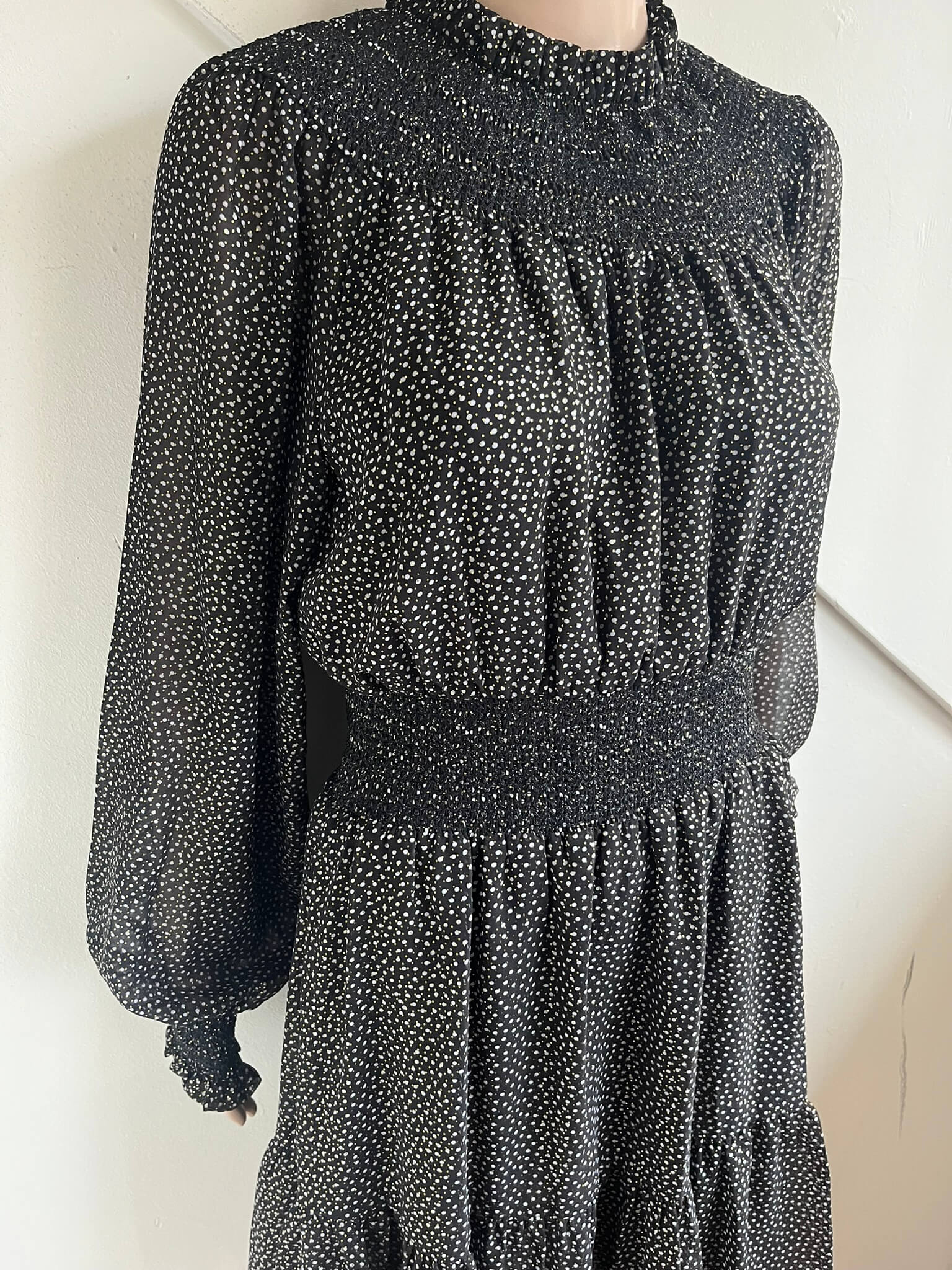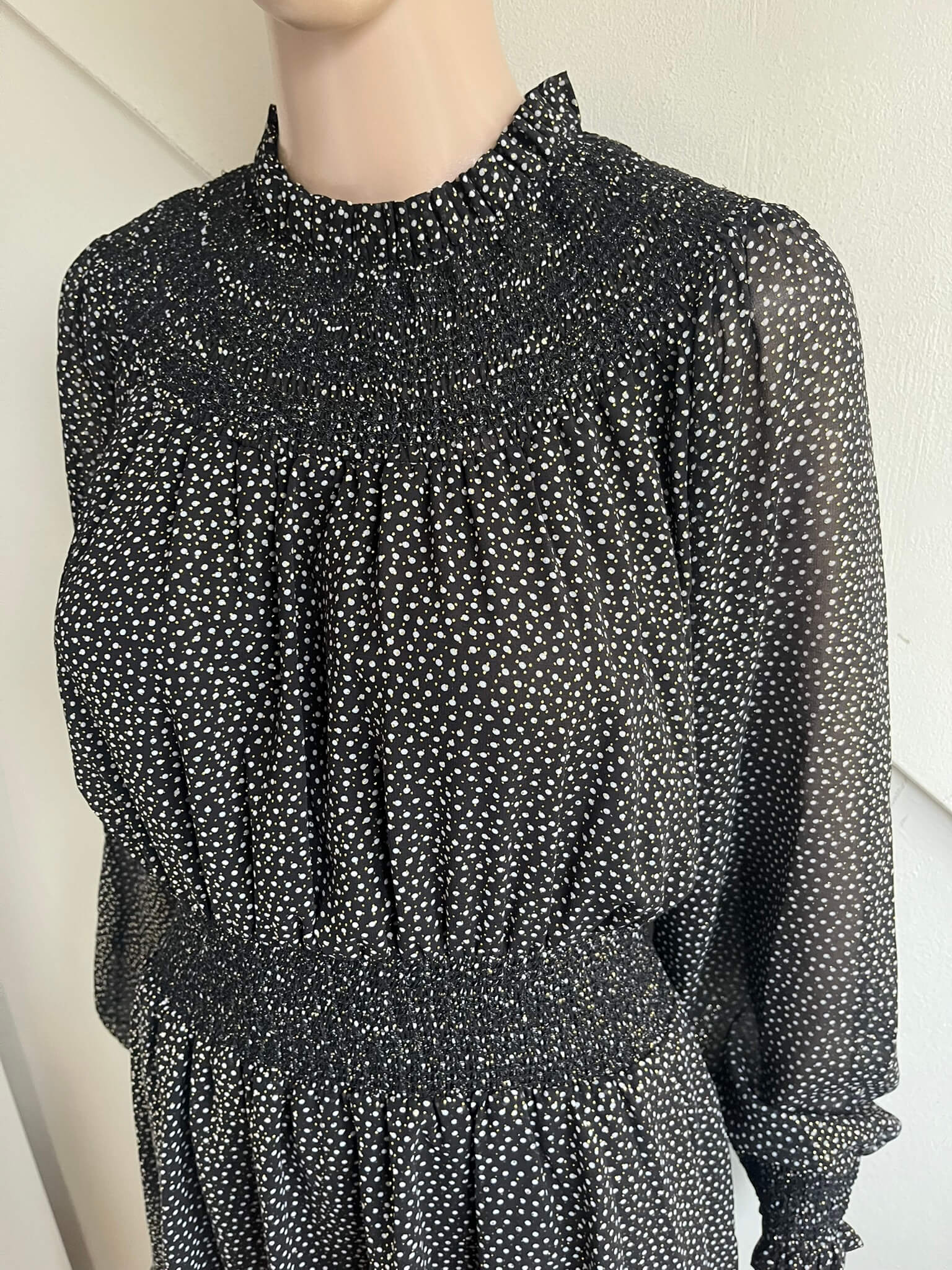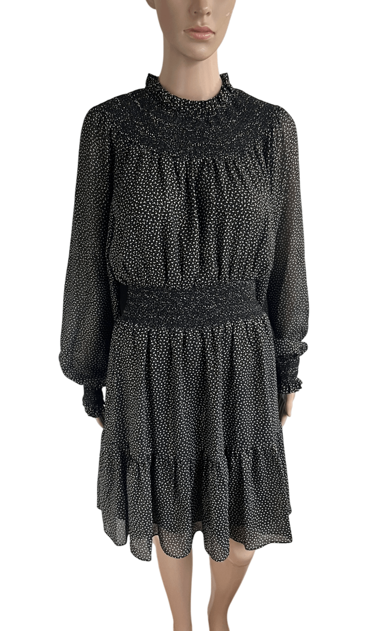 Mooie zwarte getailleerde jurk met grijze stippen en gouden stipjes in de maat M. Oksellengte 49 cm en lengte 93 cm. Gemaakt van polyester en de voering van recycled polyester en polyester.