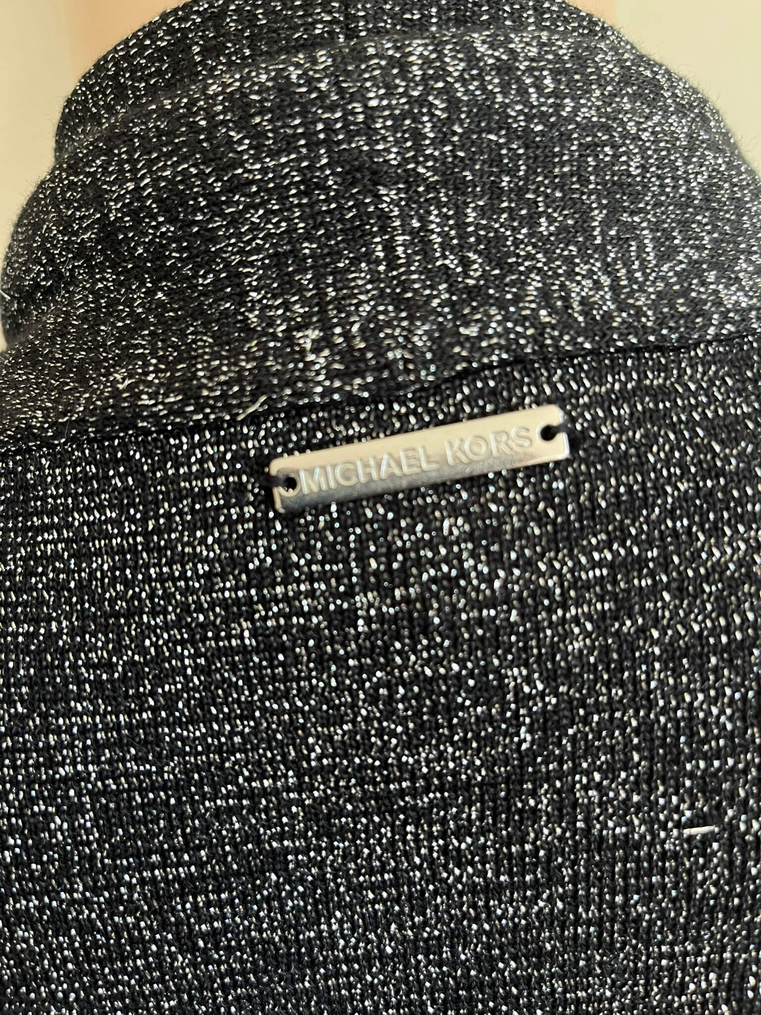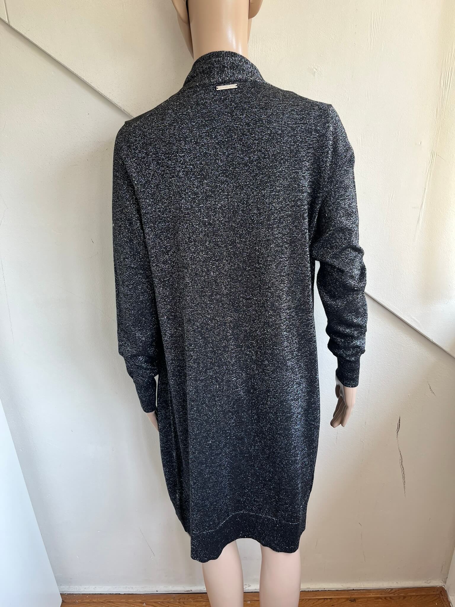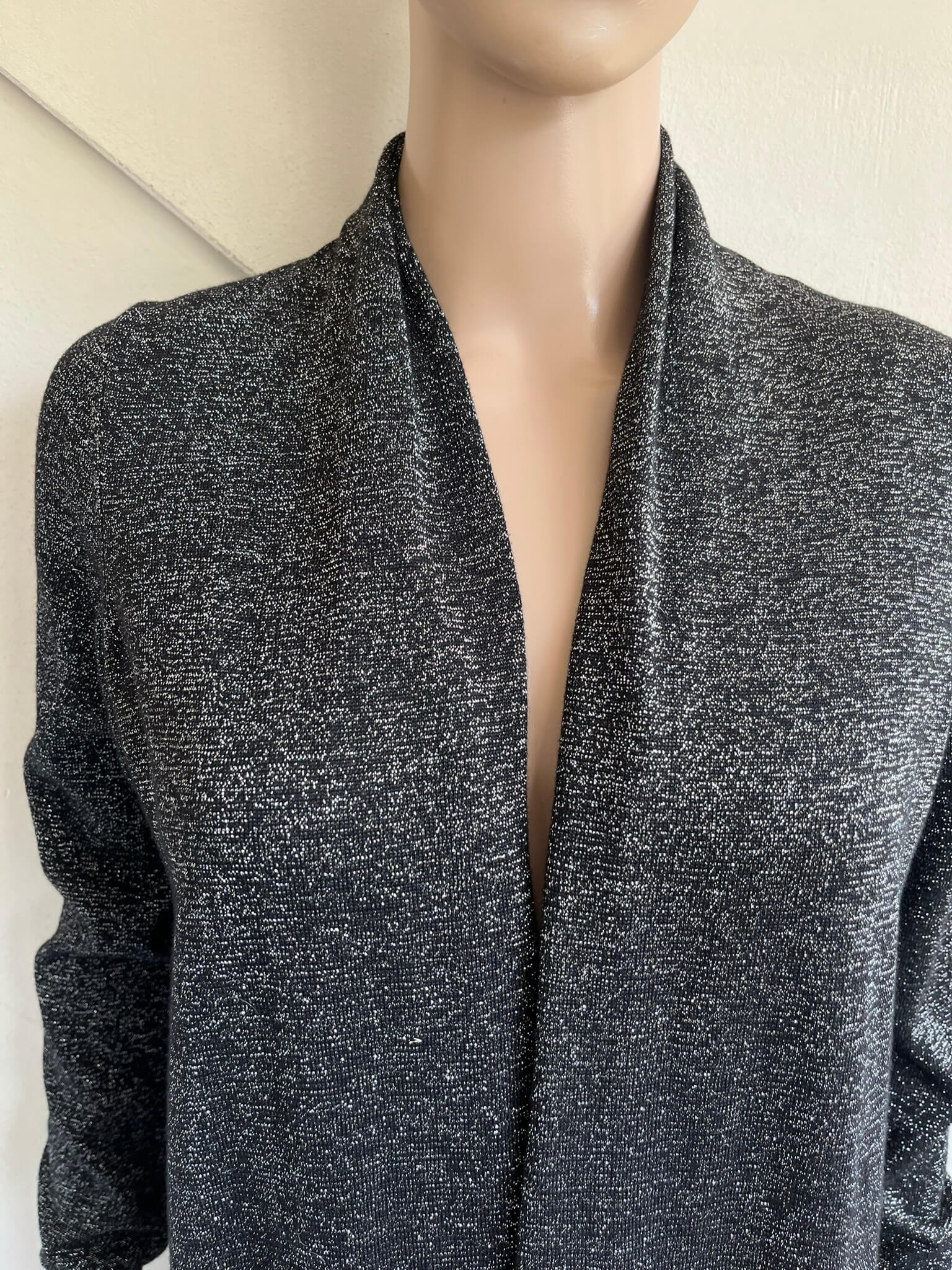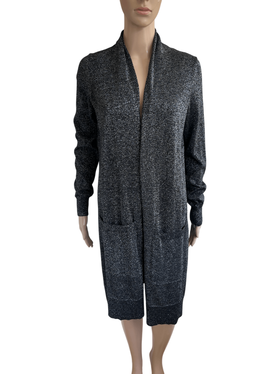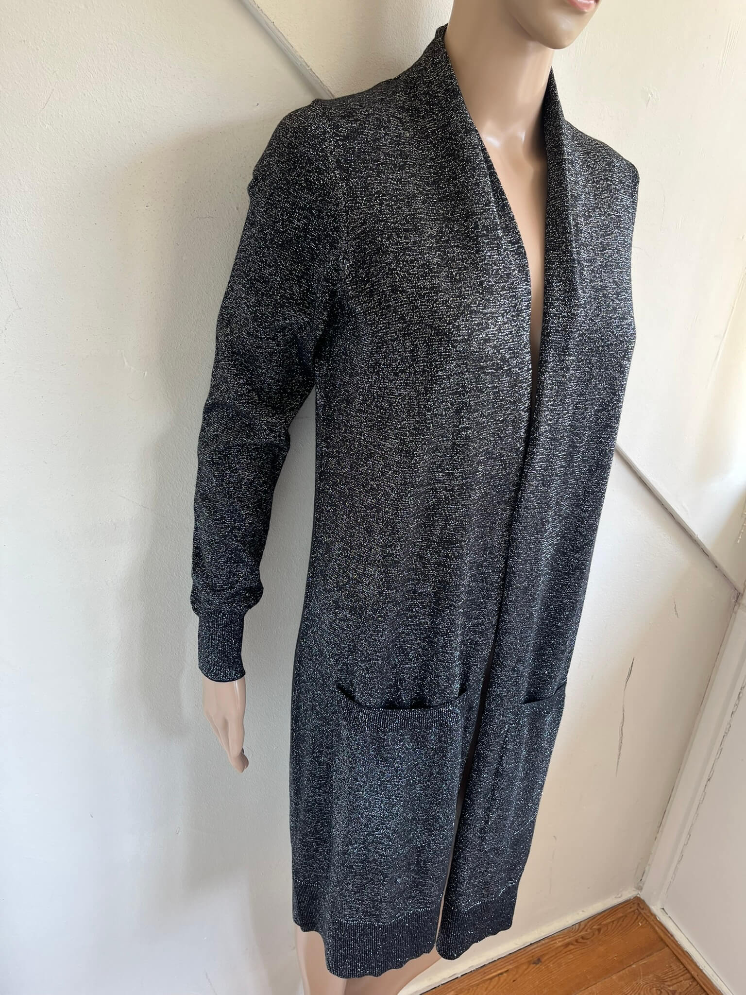 Lang zwart met zilver gemêleerd vest met zakken in de maat S. Een maat M zou ook nog kunnen want oksellengte is 49 cm en lengte is 88 cm. Gemaakt van katoen, acryl, polyester en metaal fibre.