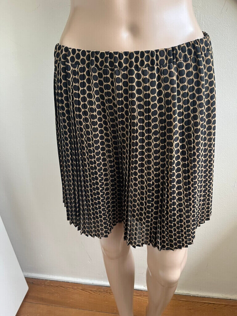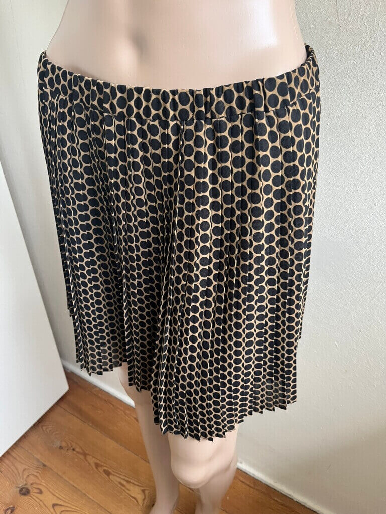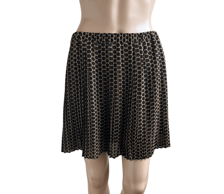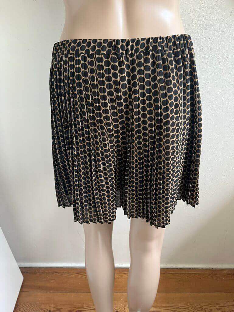 Mooi bruin plissé rokje met zwarte stippen, polkadot in de maat 38. Gemaakt van polyester. Elastische taille, 38 cm en lengte van het rokje 41 cm.
