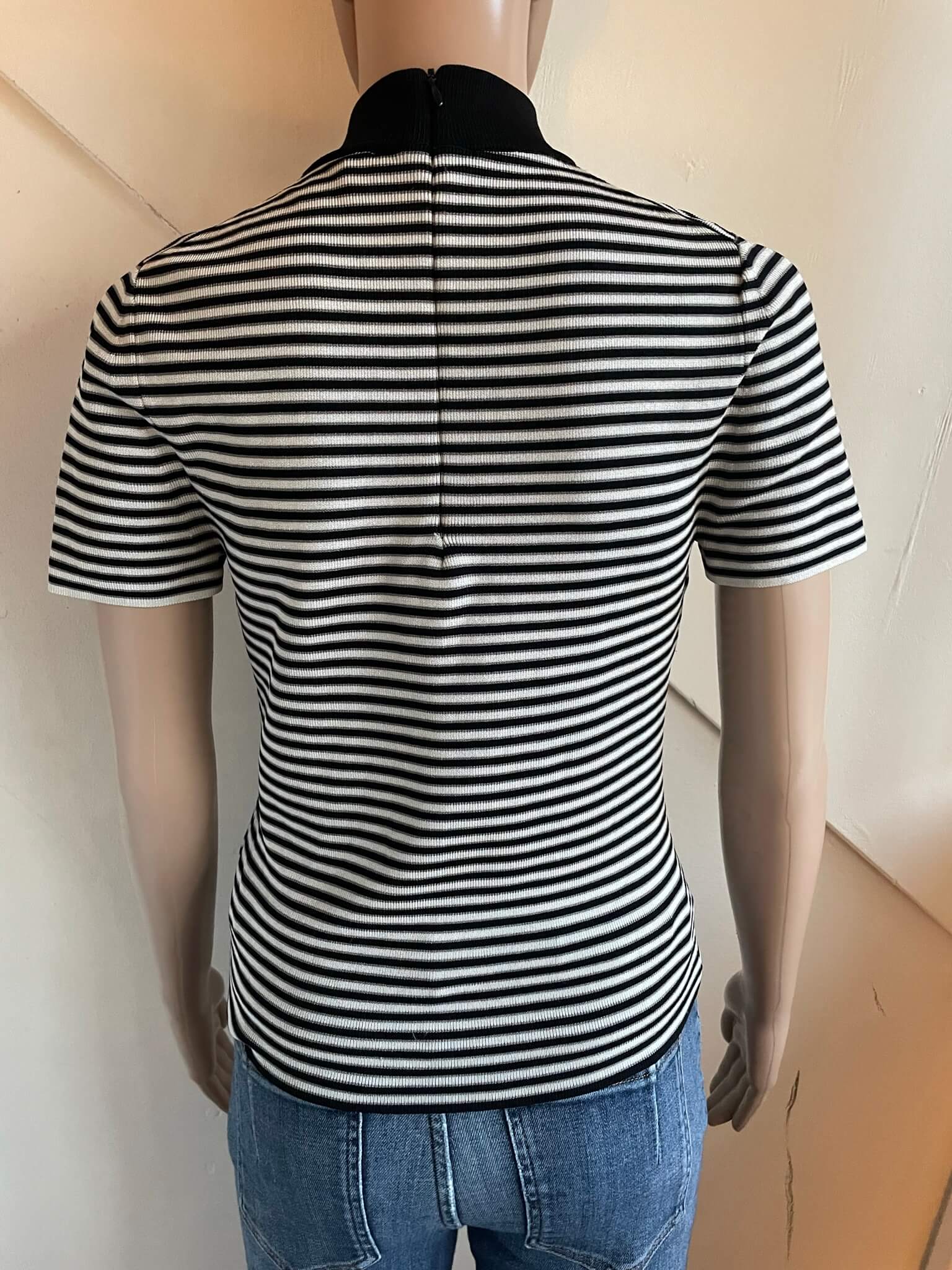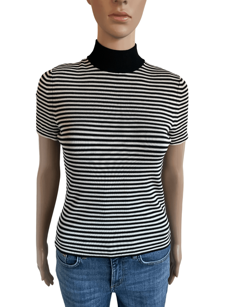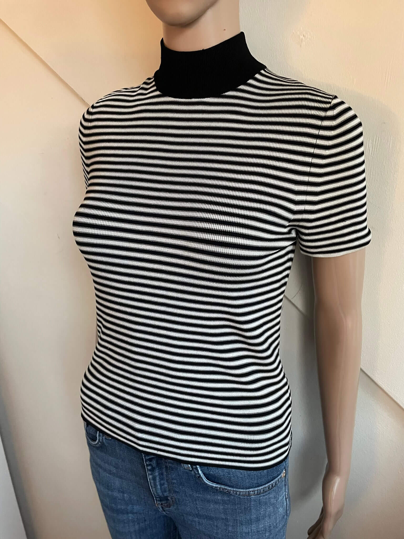 Zwart wit gestreept dun truitje met korte mouwen en een lage col in de maat S. Gemaakt van viscose, nylon en elastane. In uitstekende staat.