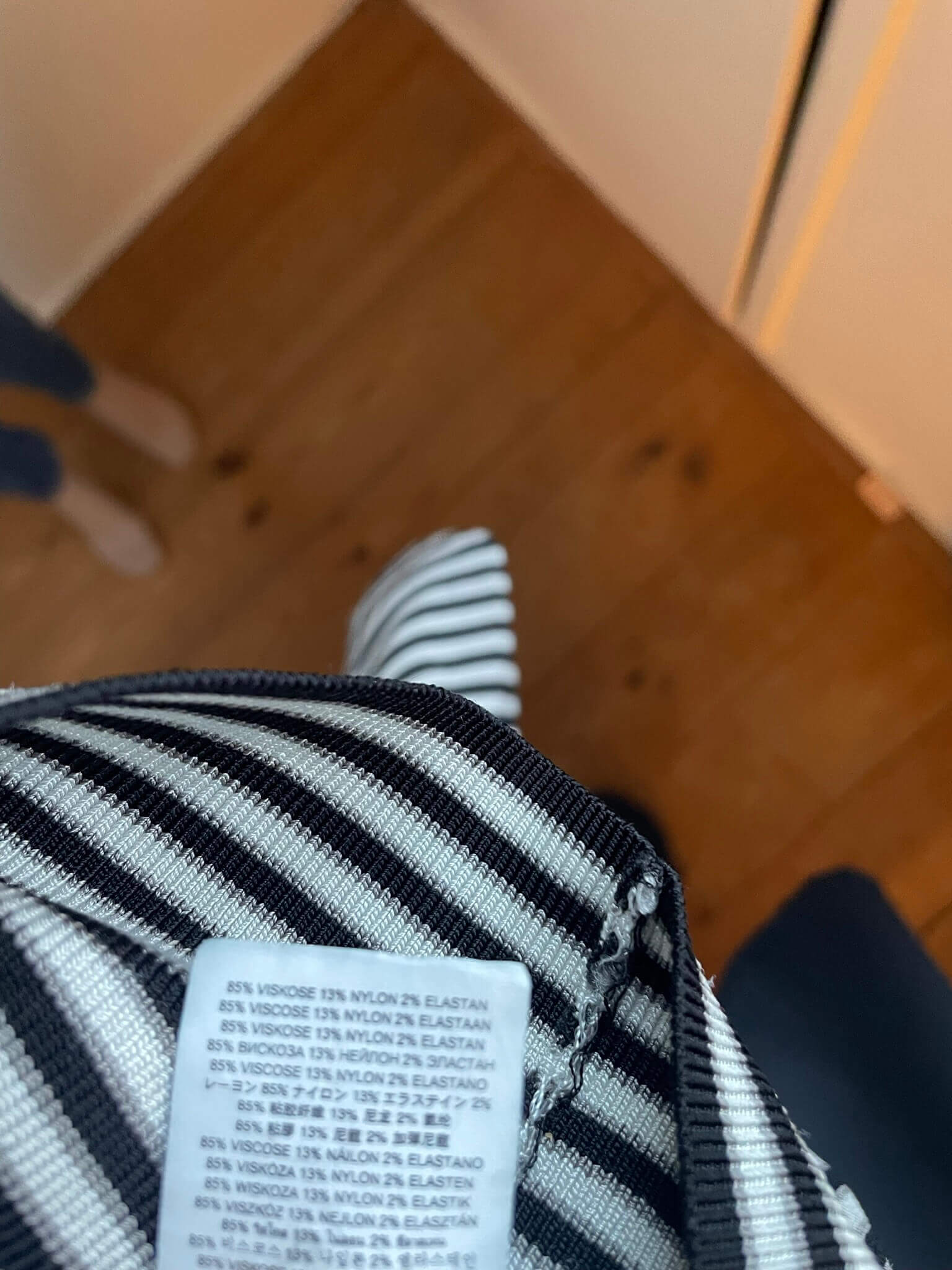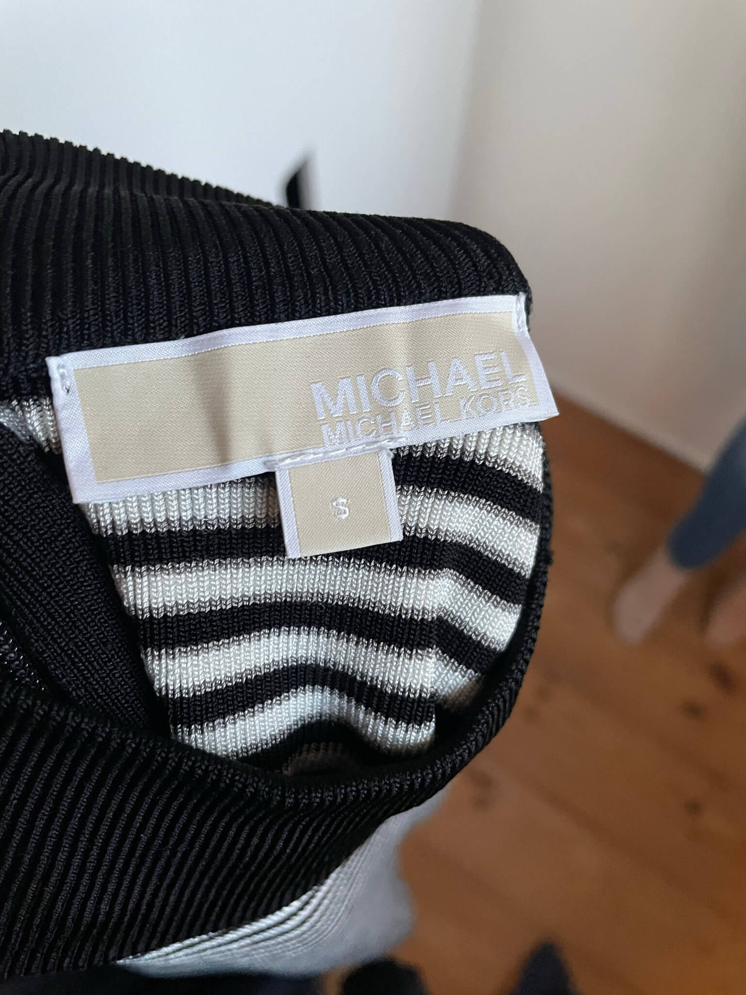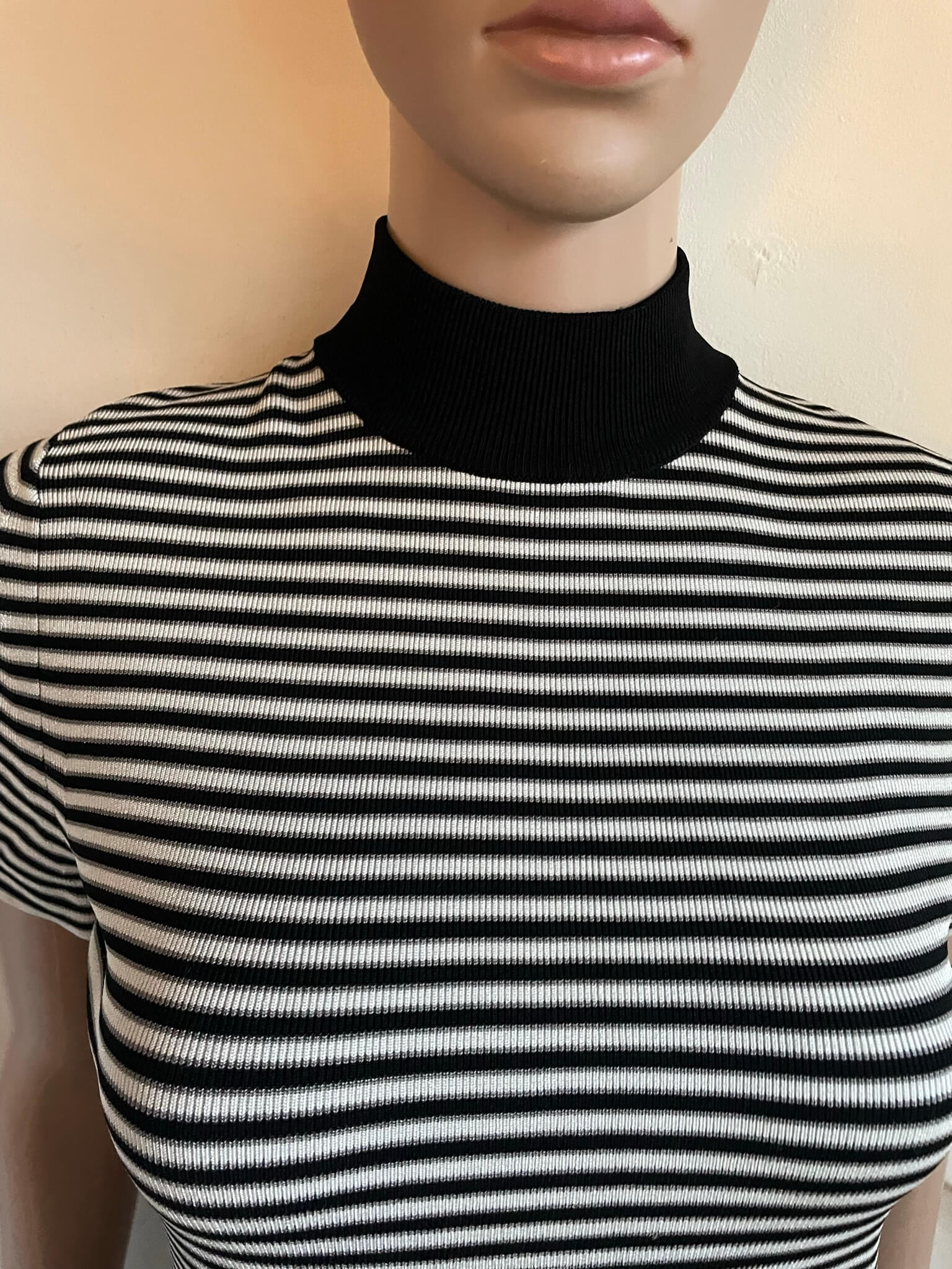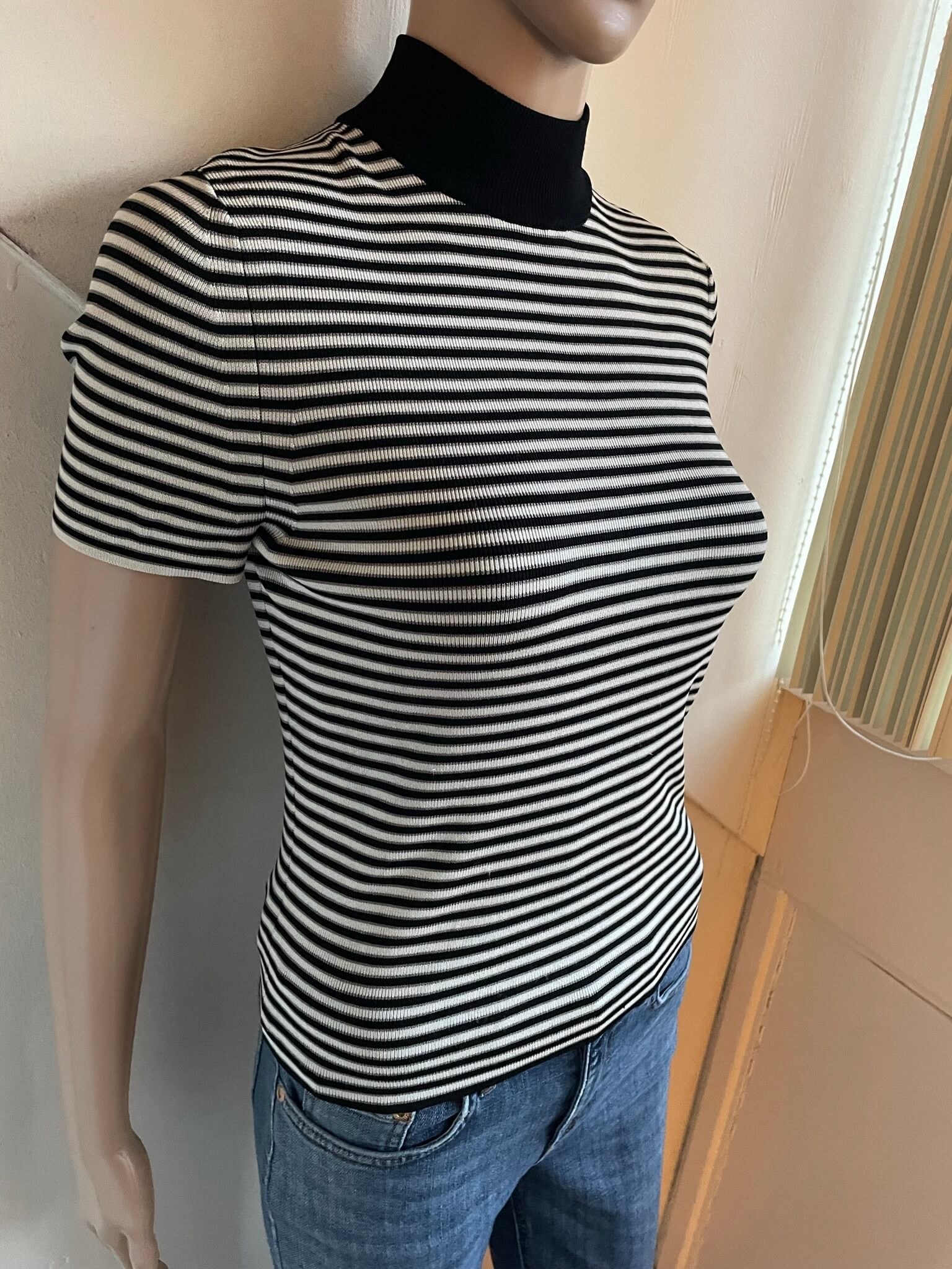 Zwart wit gestreept dun truitje met korte mouwen en een lage col in de maat S. Gemaakt van viscose, nylon en elastane. In uitstekende staat.