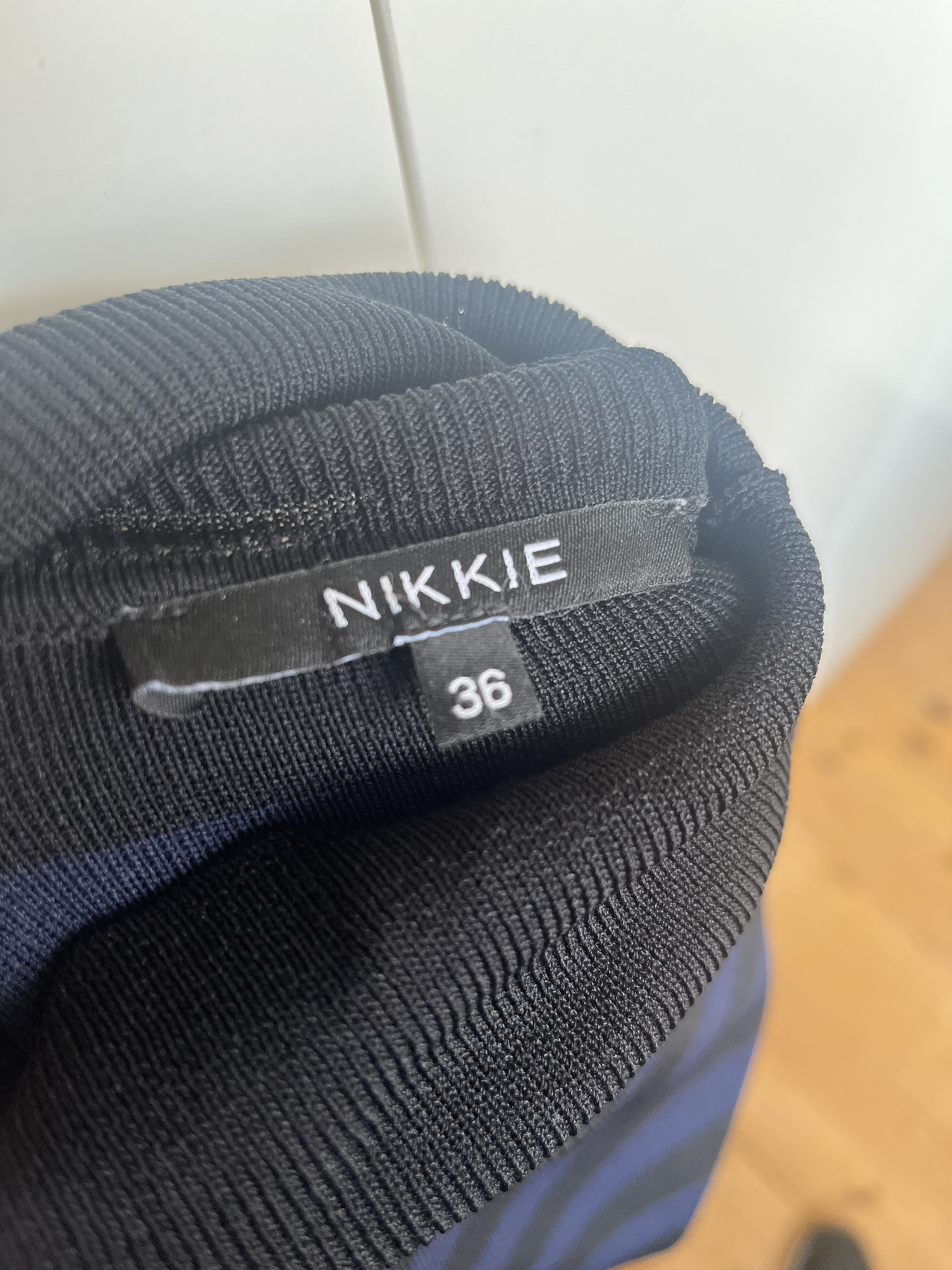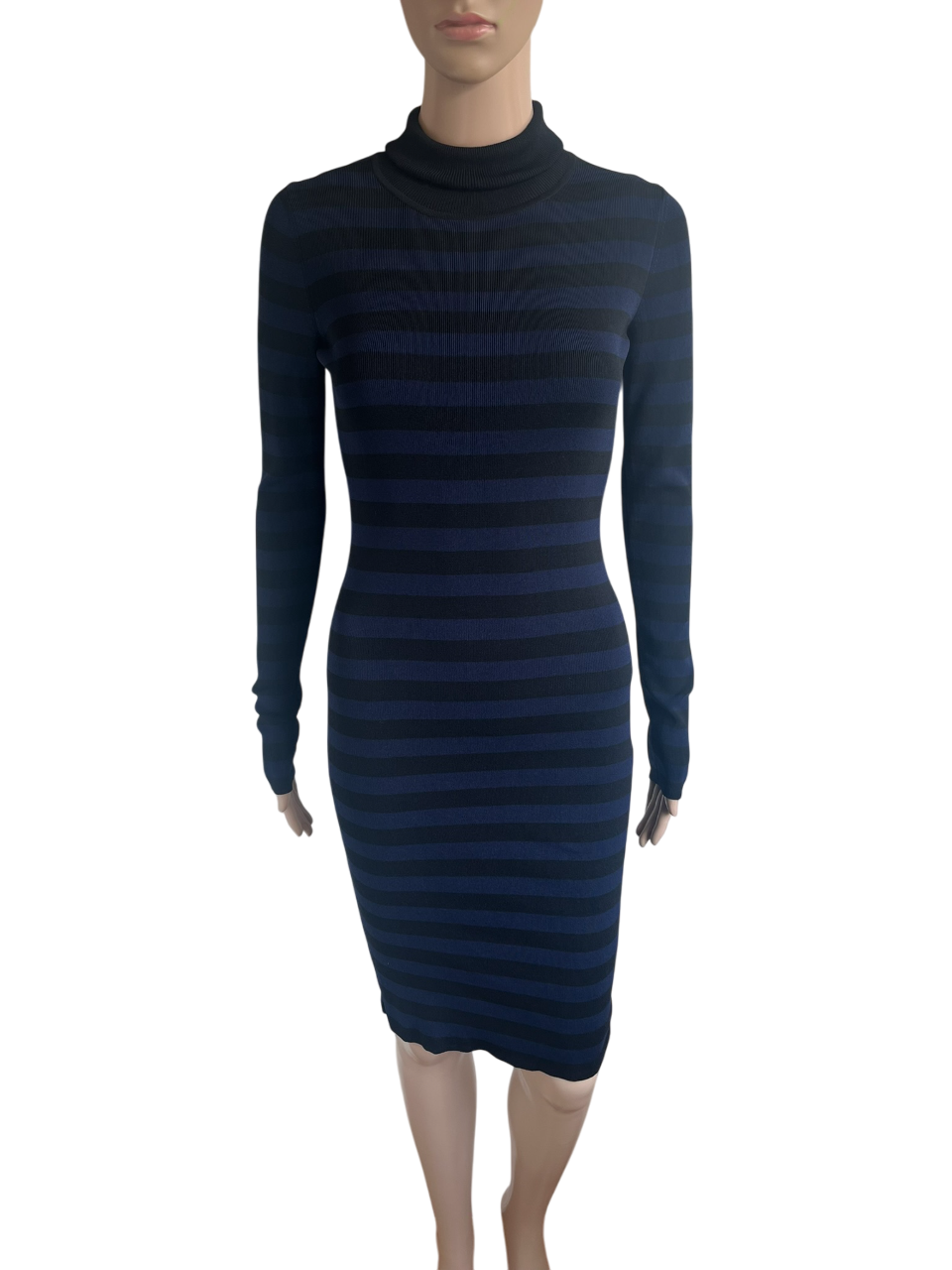 Zwart en blauw gestreepte stretch jurk met een col in de maat 36. Gemaakt van viscose en nylon.