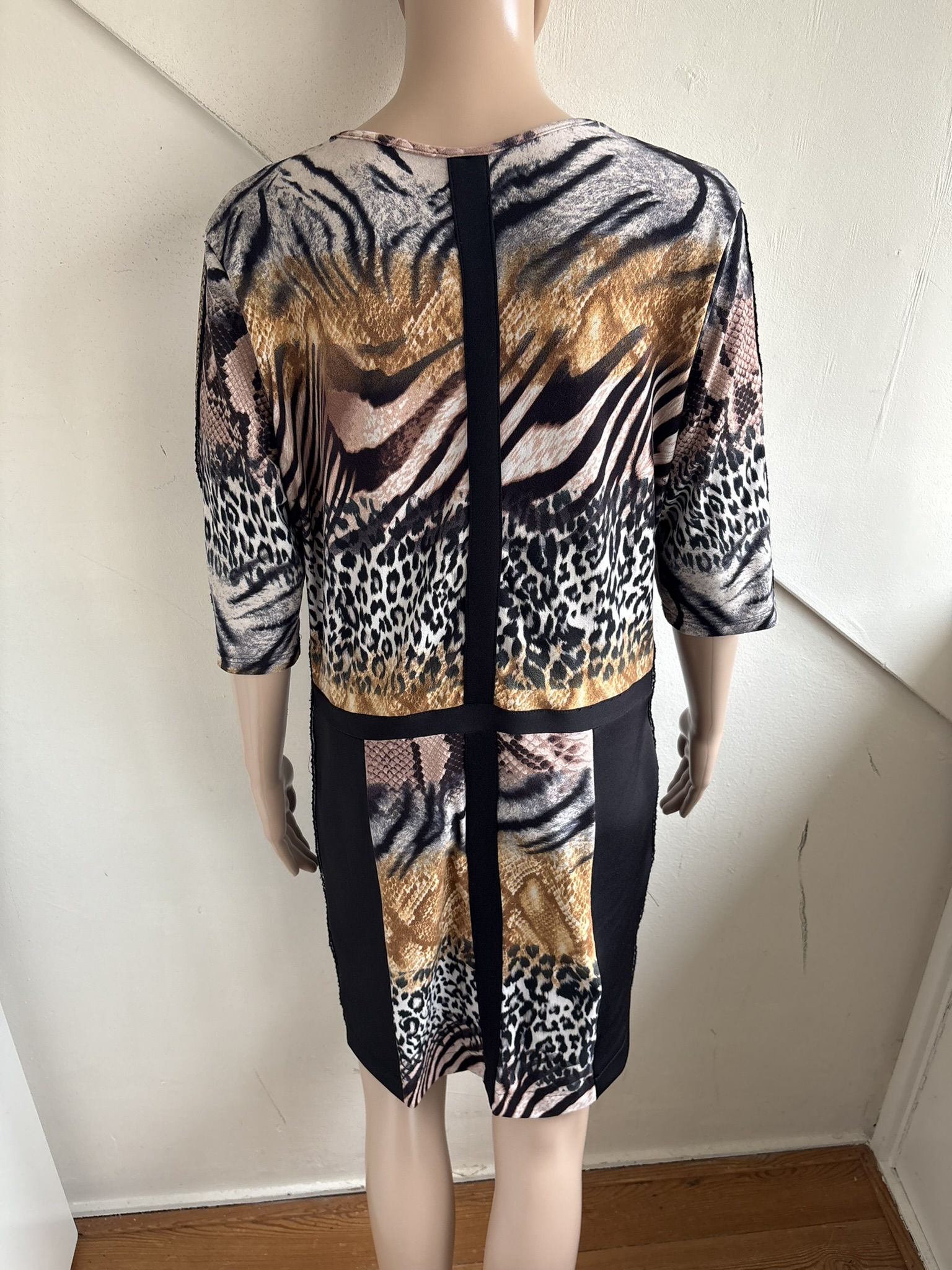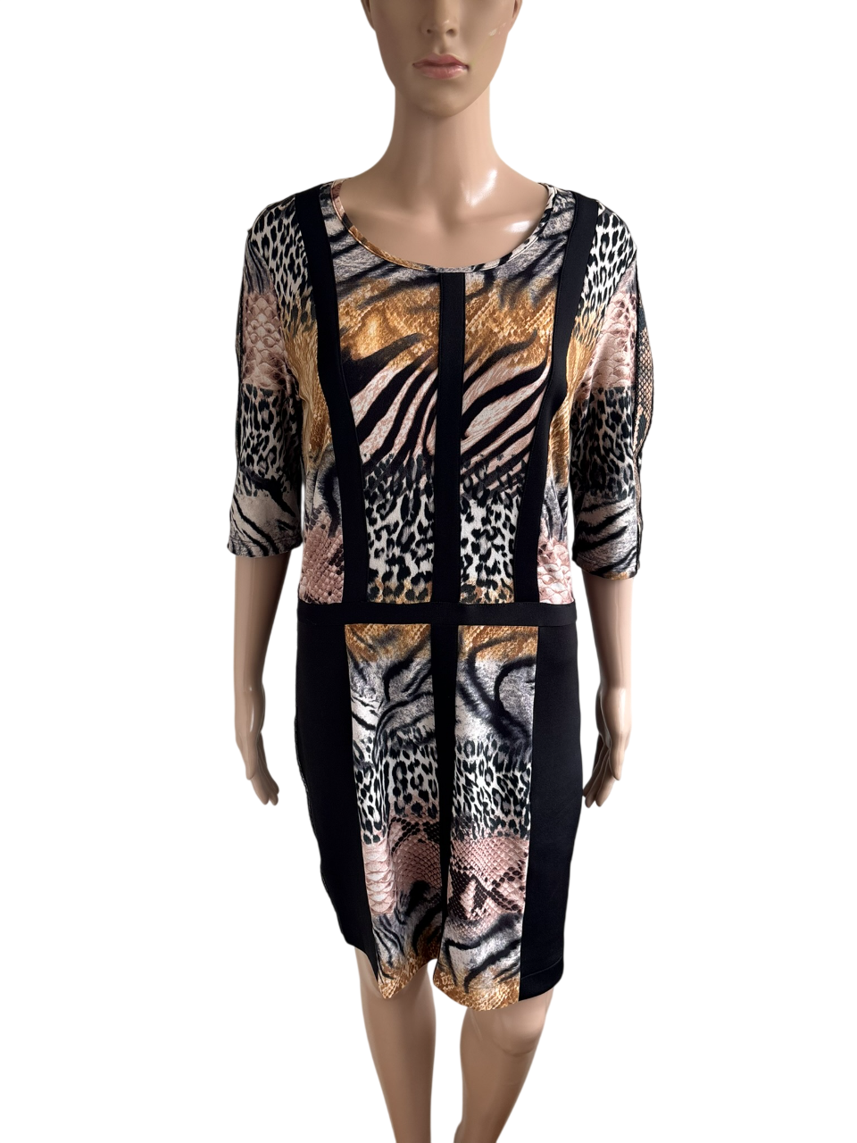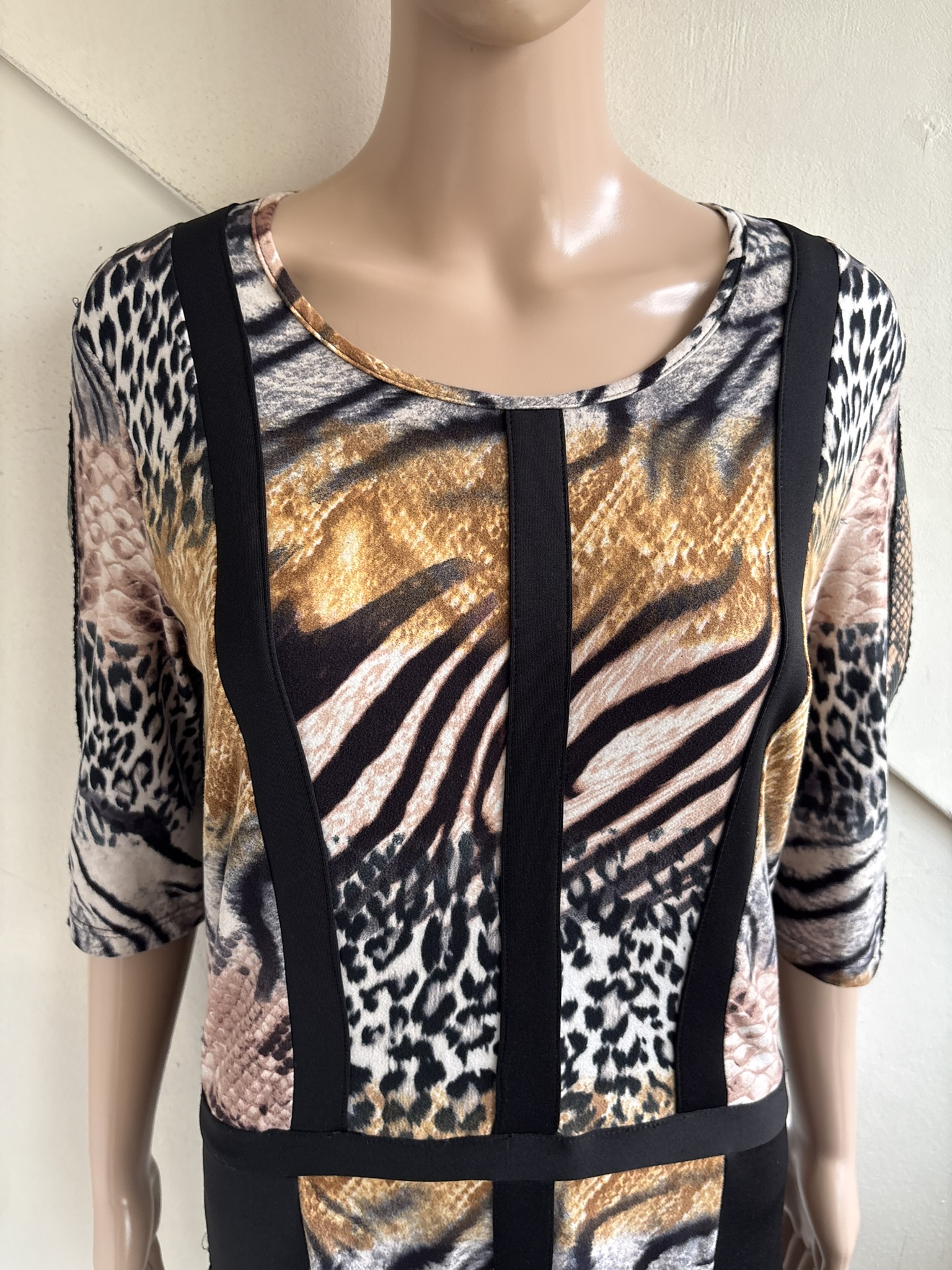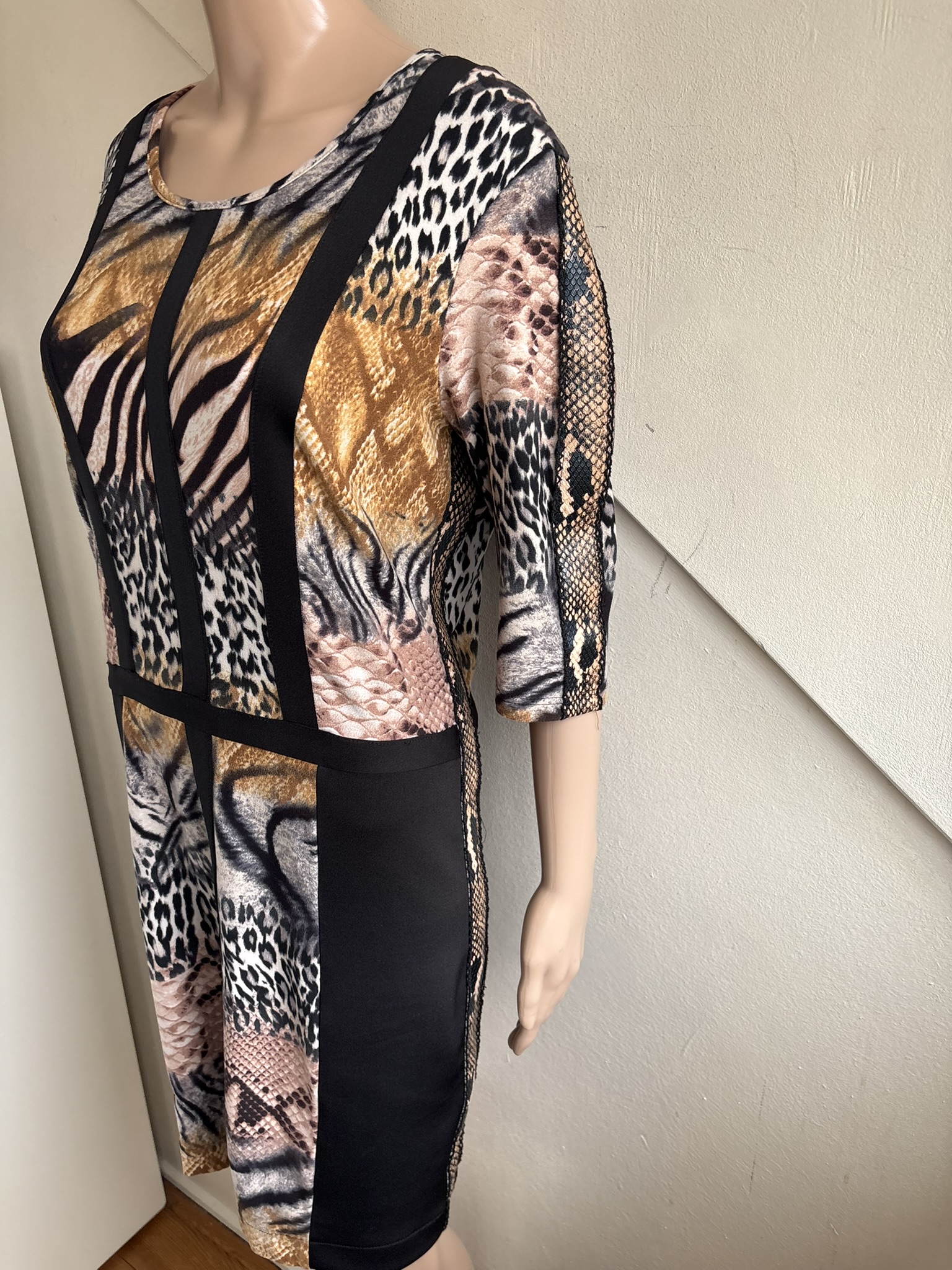 Jurk met verschillende dierenprint en gestreept motief met bies in de maat 40. Oksellengte 50 cm en lengte 88 cm.