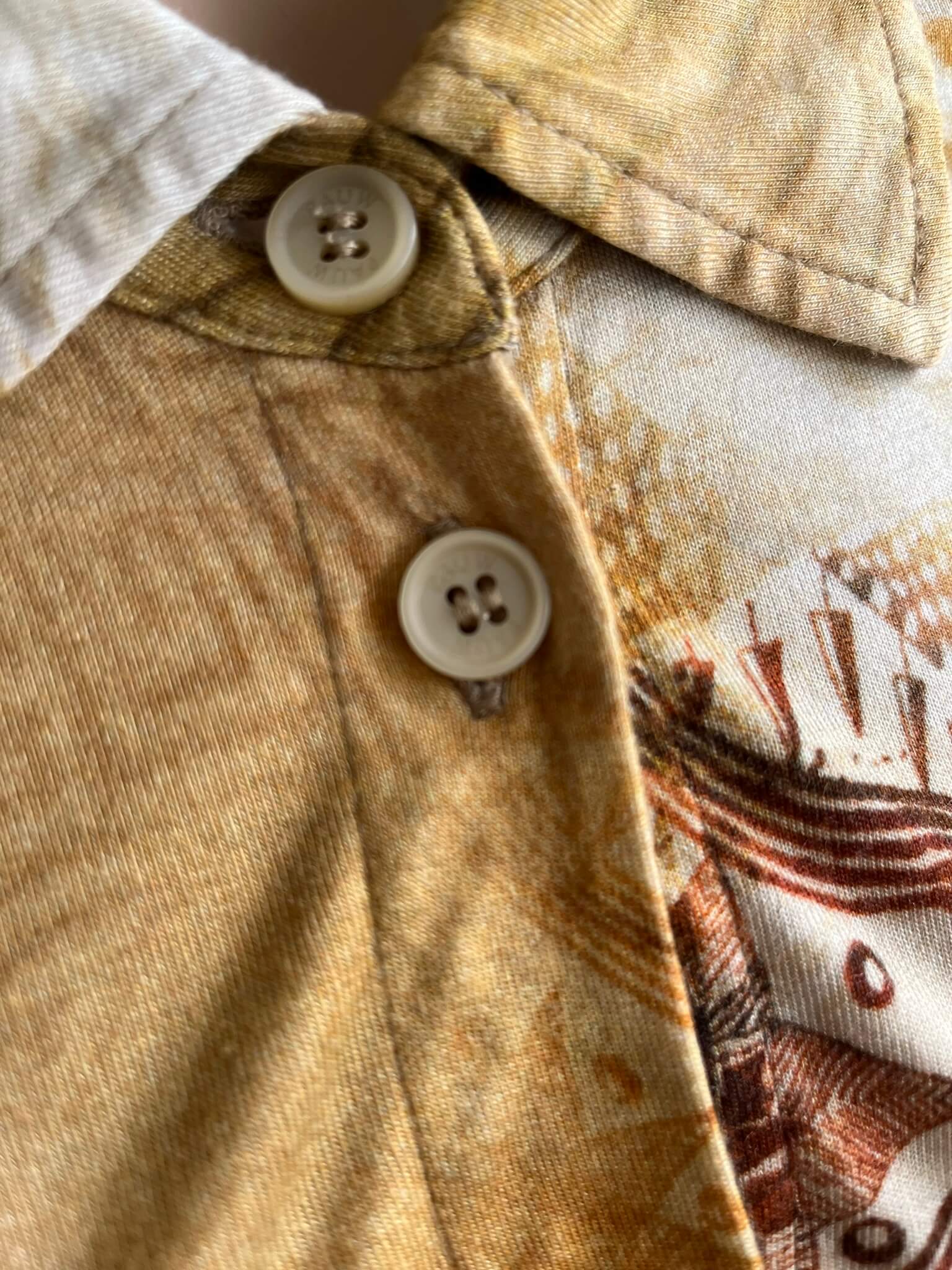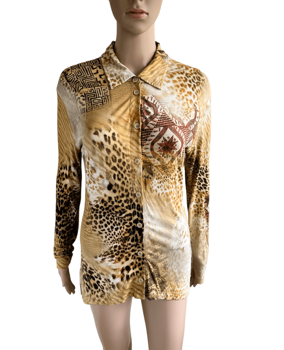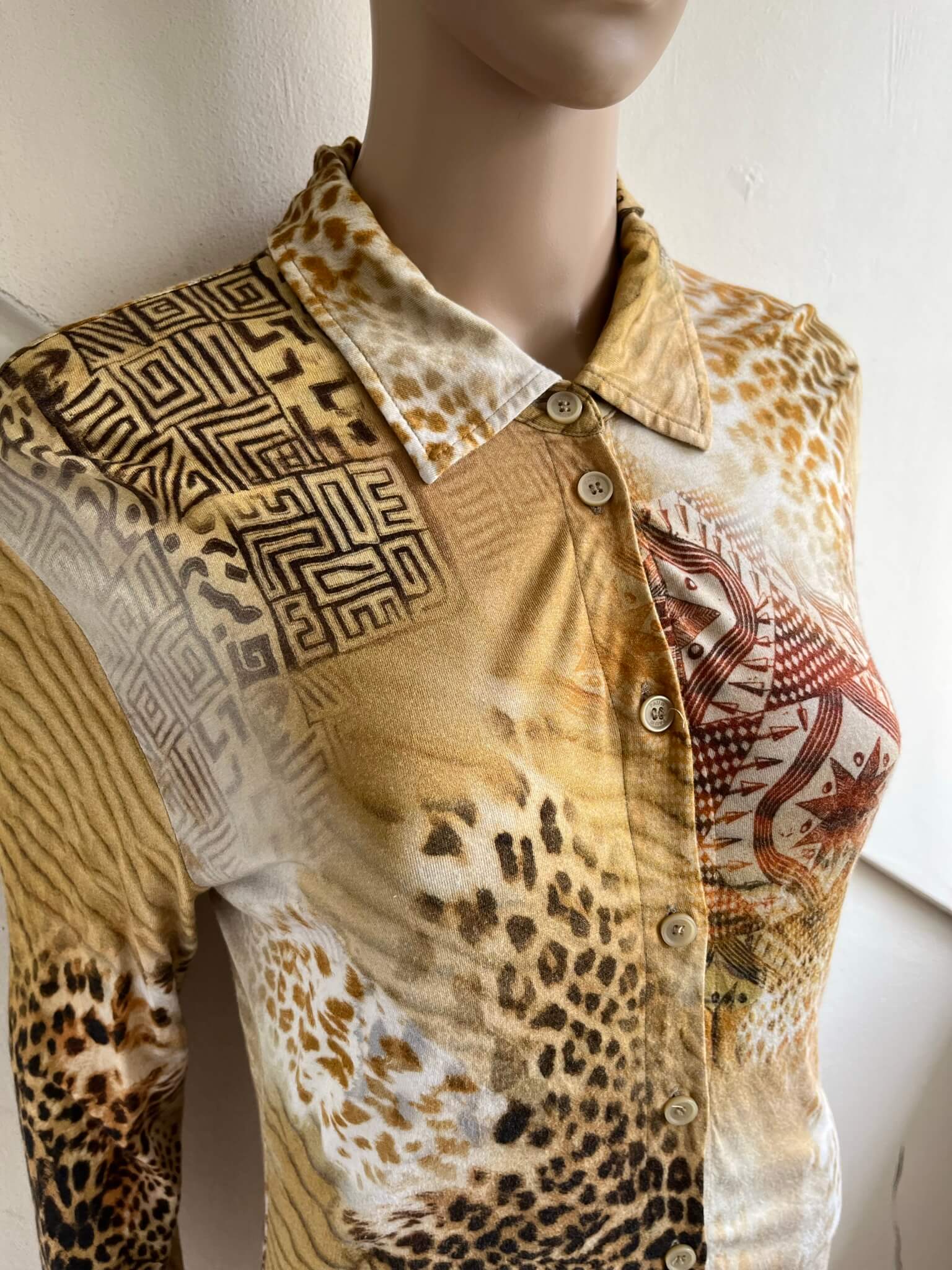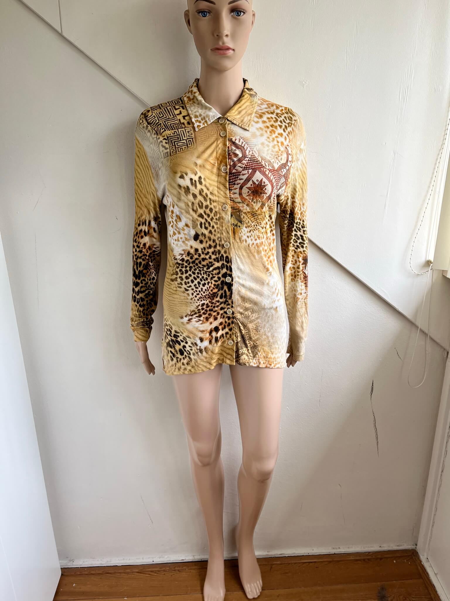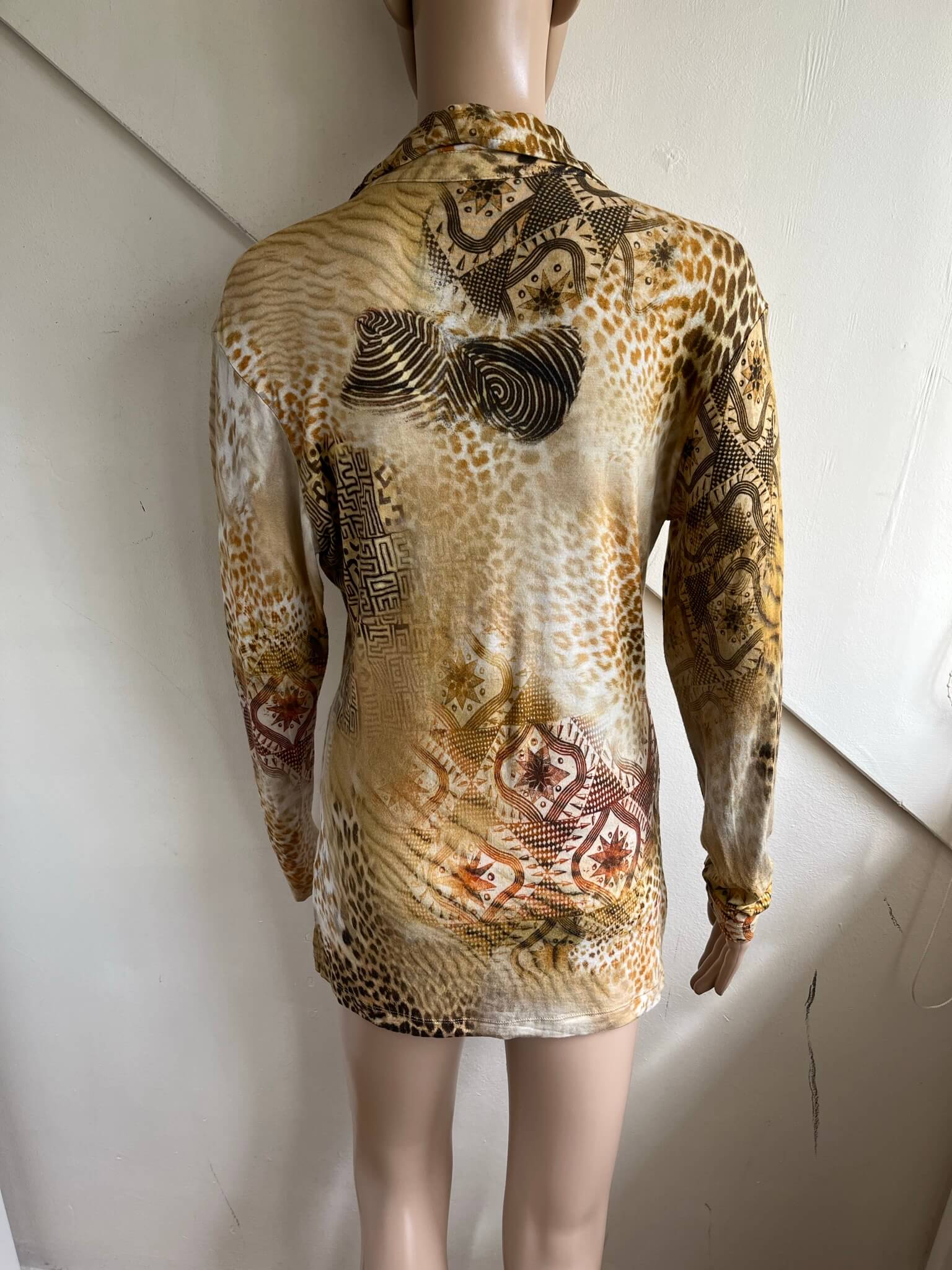 Mooie soepele blouse met een print in zandkleuren, geel oranje bruin rood in de maat 3 = 38. Valt smal, dus meer als maat 36. Gemaakt van viscose en elastane . Oksellengte 49 cm en lengte 66 cm.