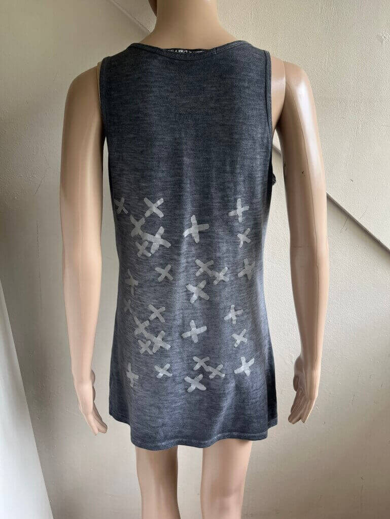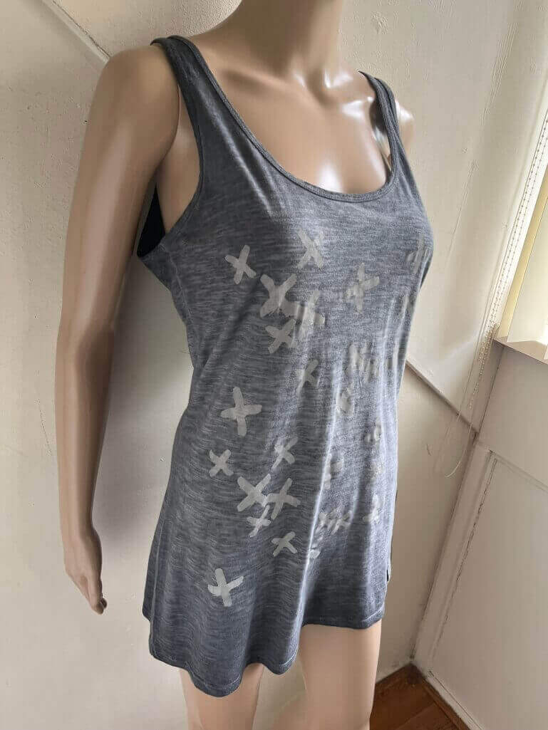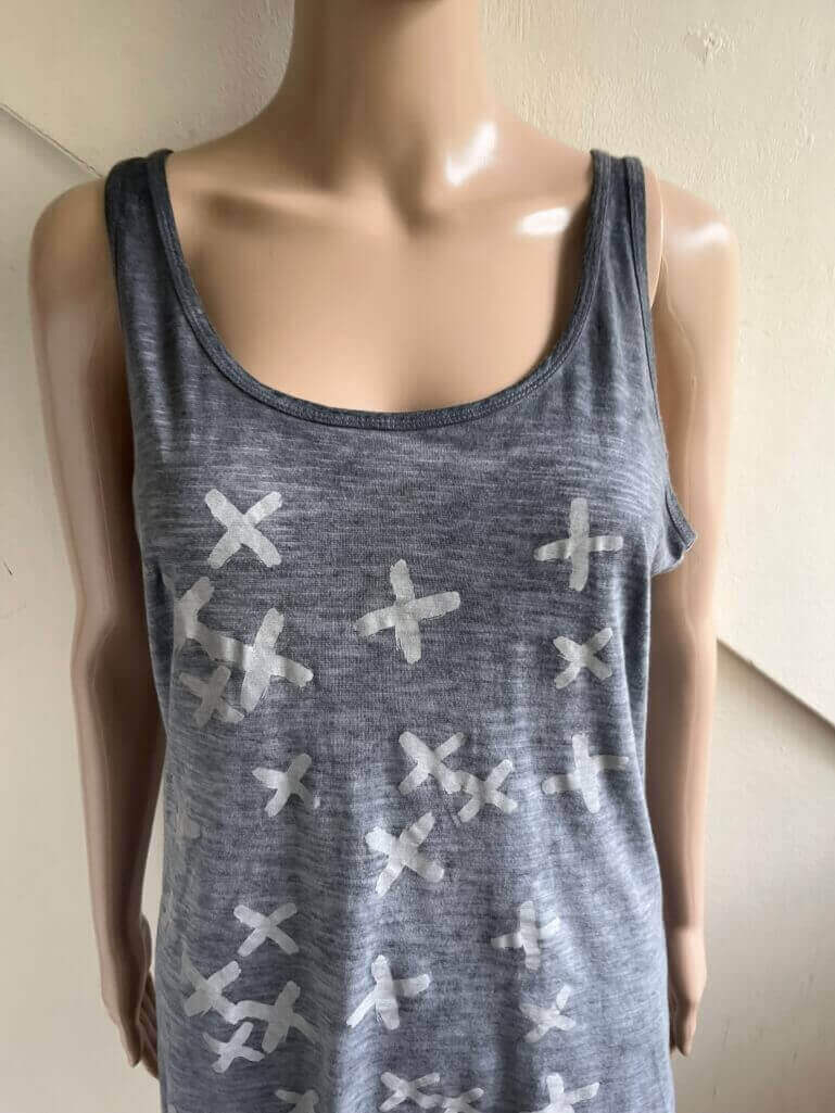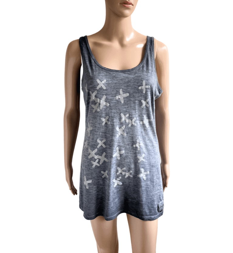 Grijze lange tanktop met print van kruisjes / plusjes in de maat M. Gemaakt van katoen. Lengte van de top is 75 cm.