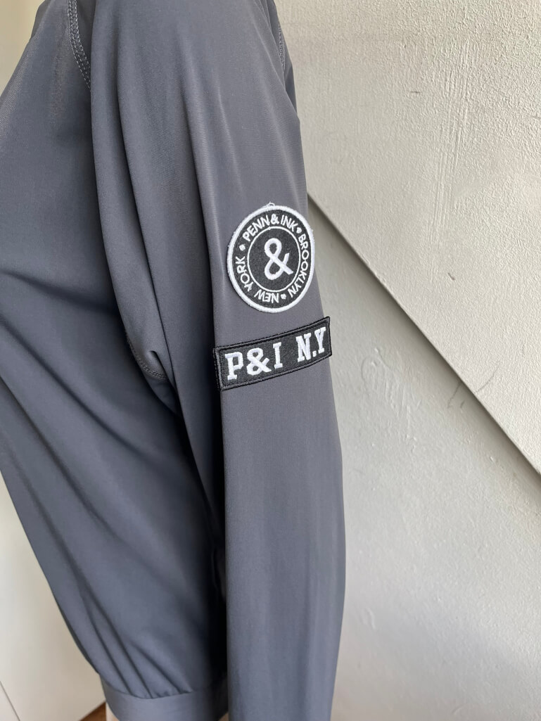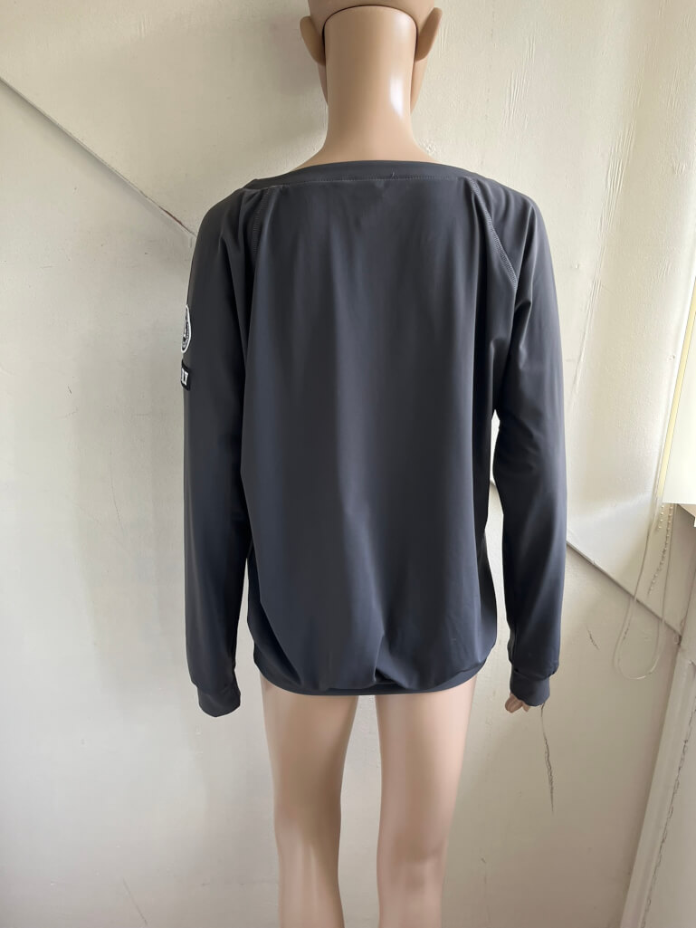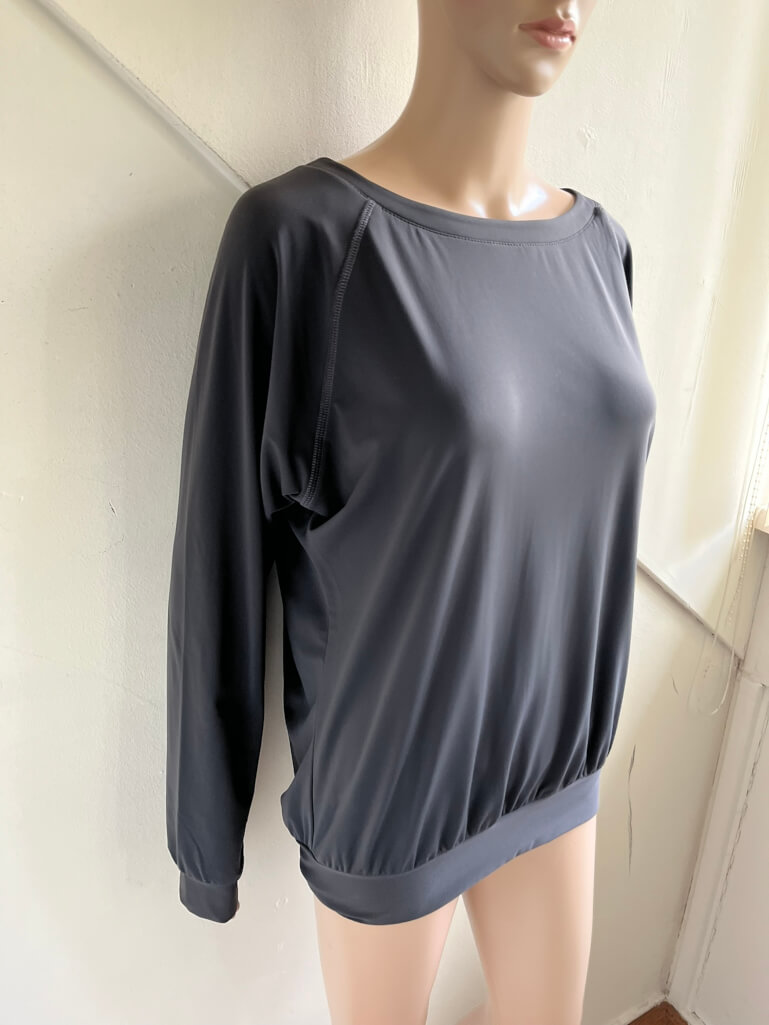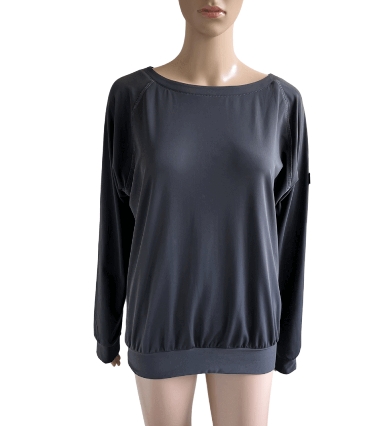 Donkergrijze travelstof sweater of top in de maat 38. Gemaakt van polyamide en elastane. De trui heeft een lichte vleermuismouw waardoor de oksellengte wat lastiger te meten is. Lengte is 66 cm.