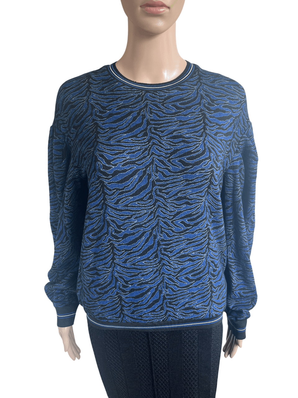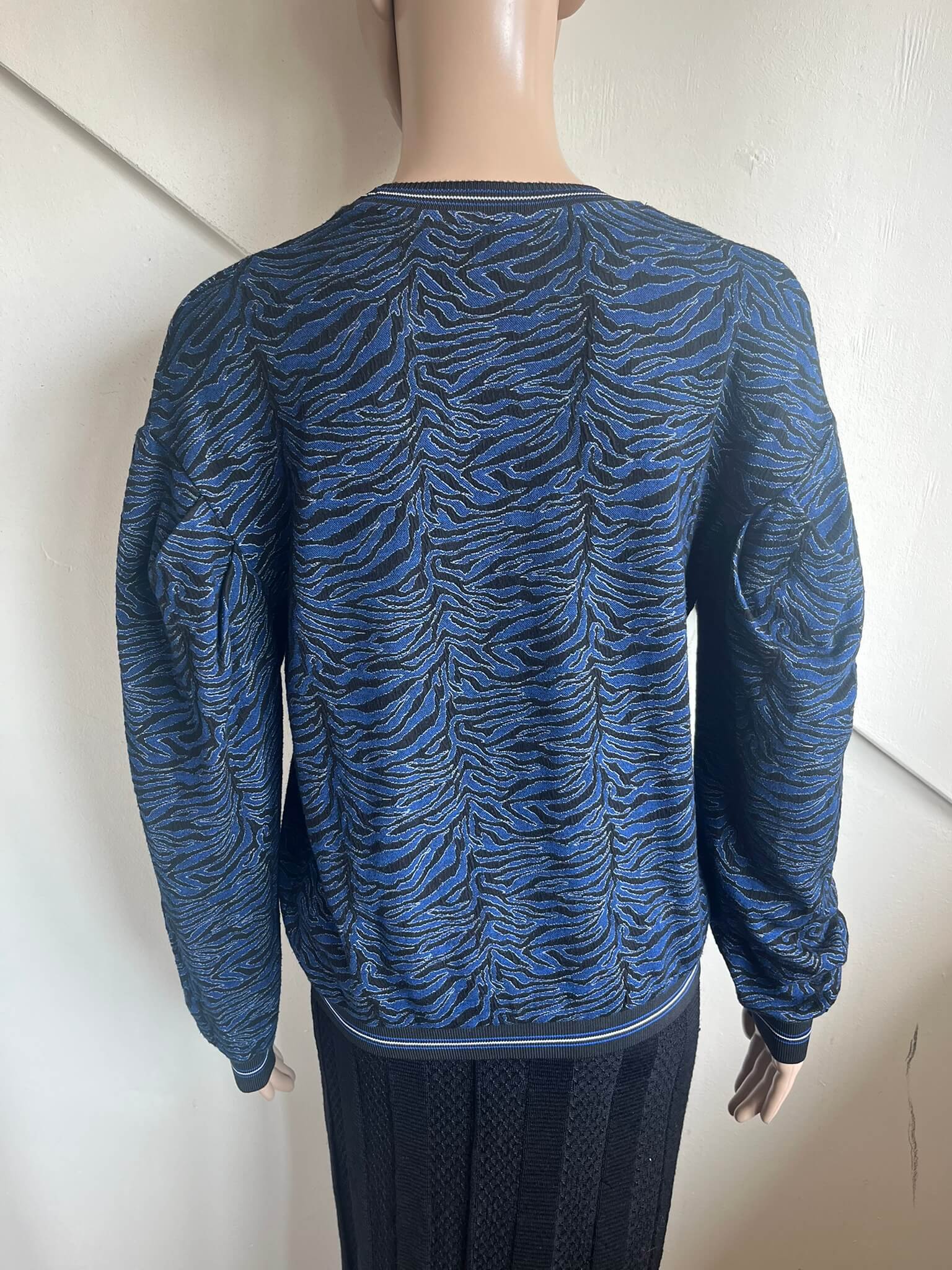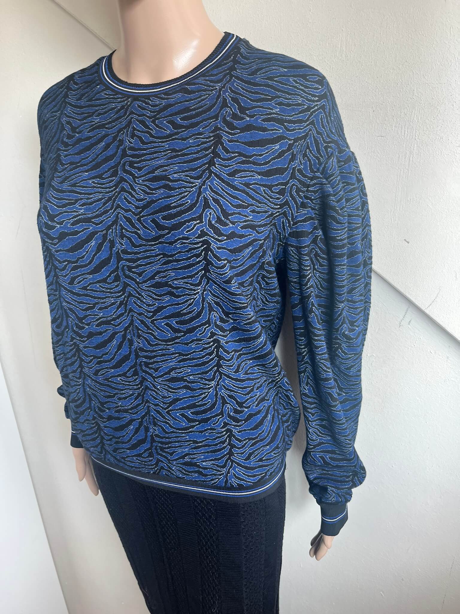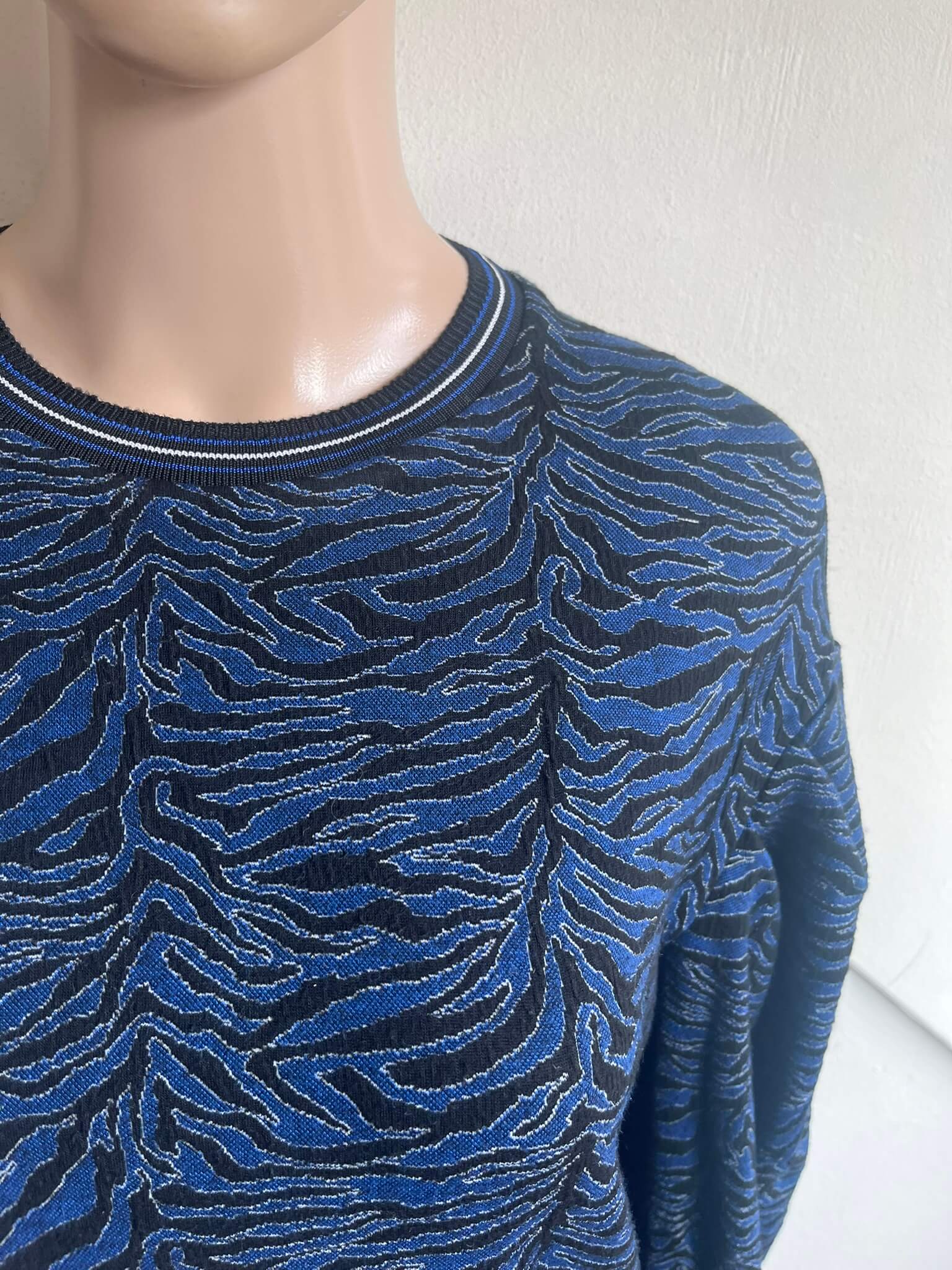 Blauwe trui of sweater met zwart witte print in de maat S. Gemaakt van viscose, polyamide en elastaan. Oksellengte 50 cm en lengte 52 cm.