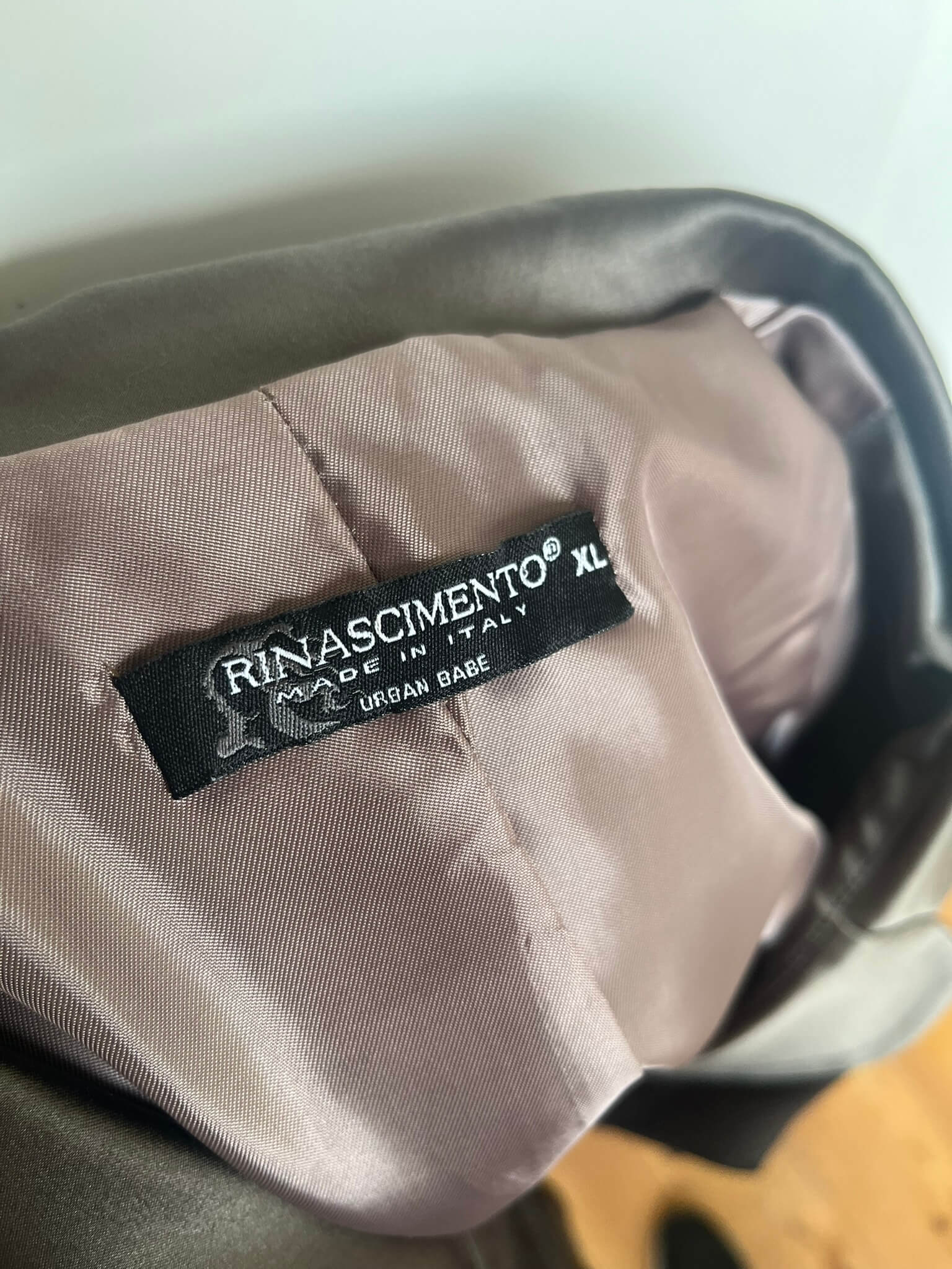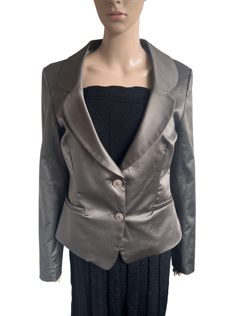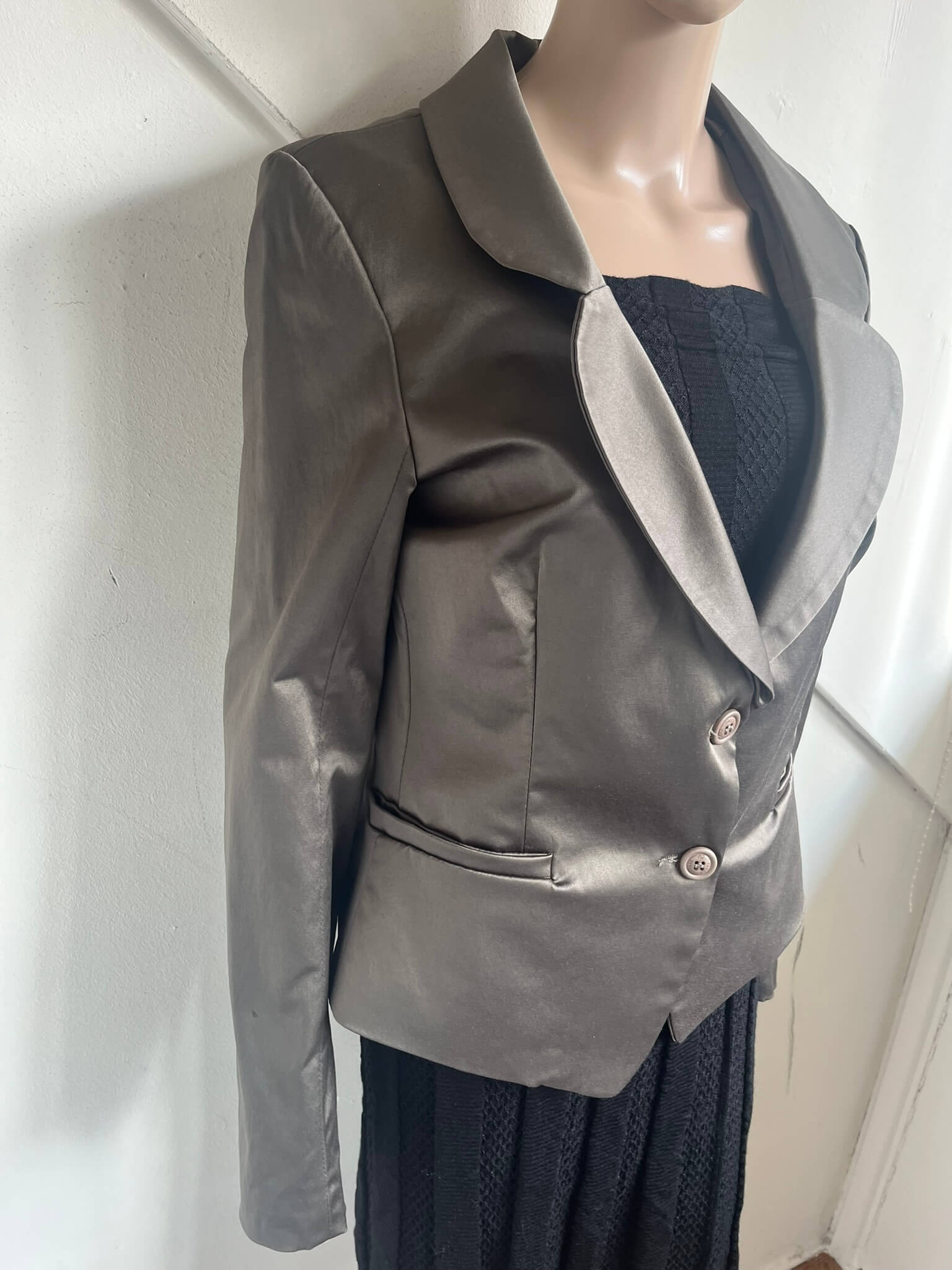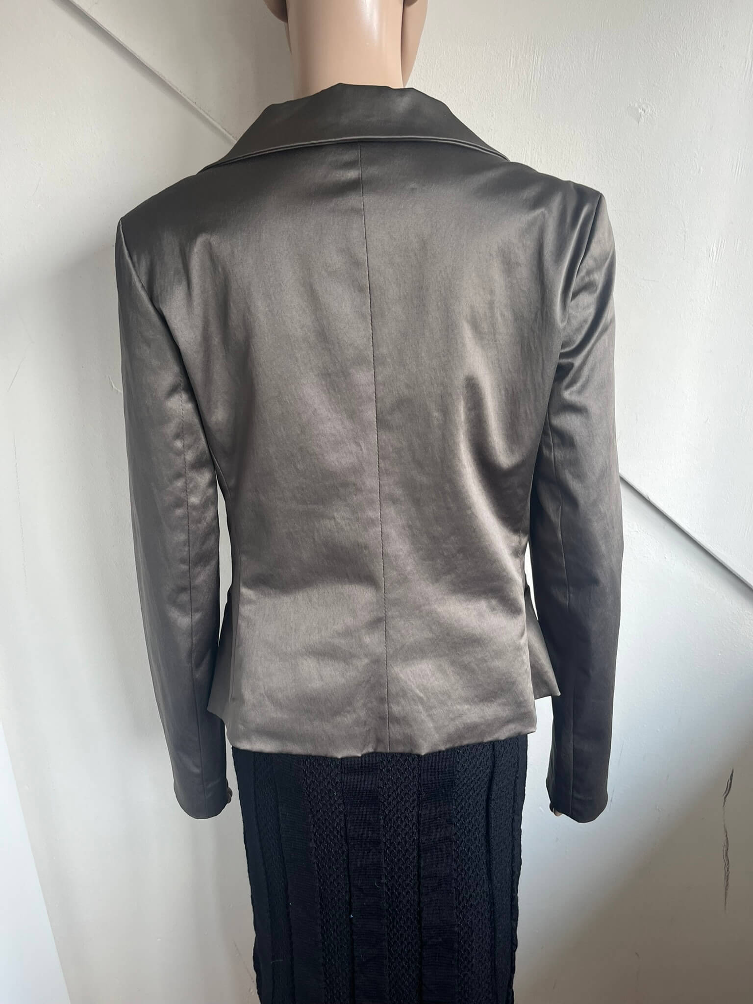 Lichtglanzende blazer in de maat 40. In het label staat maat XL maar valt bij dit merk altijd wat kleiner uit en in dit geval als maat 40. Oksellengte 51 cm en lengte 56 cm.