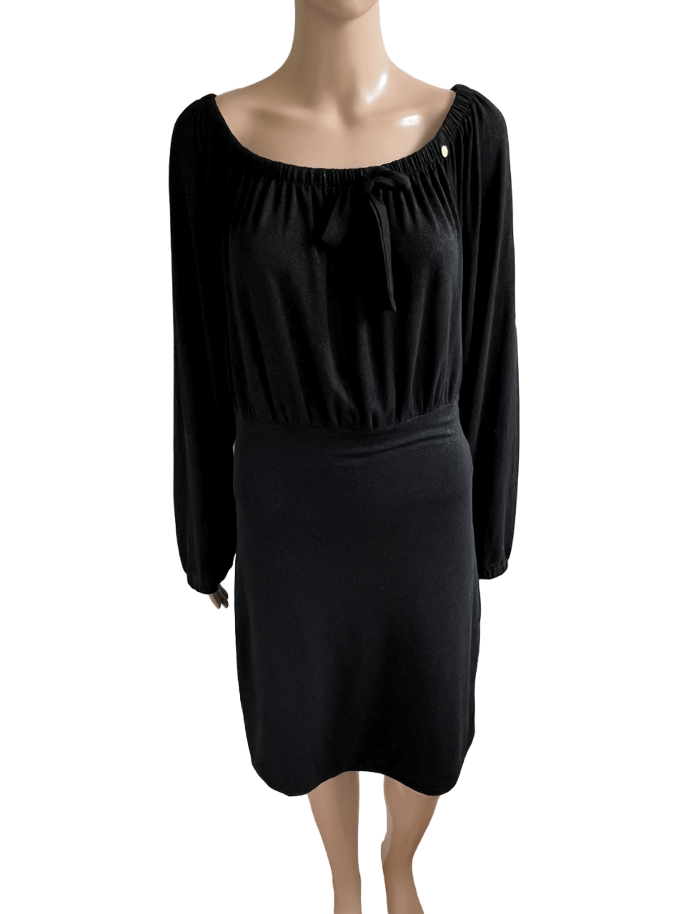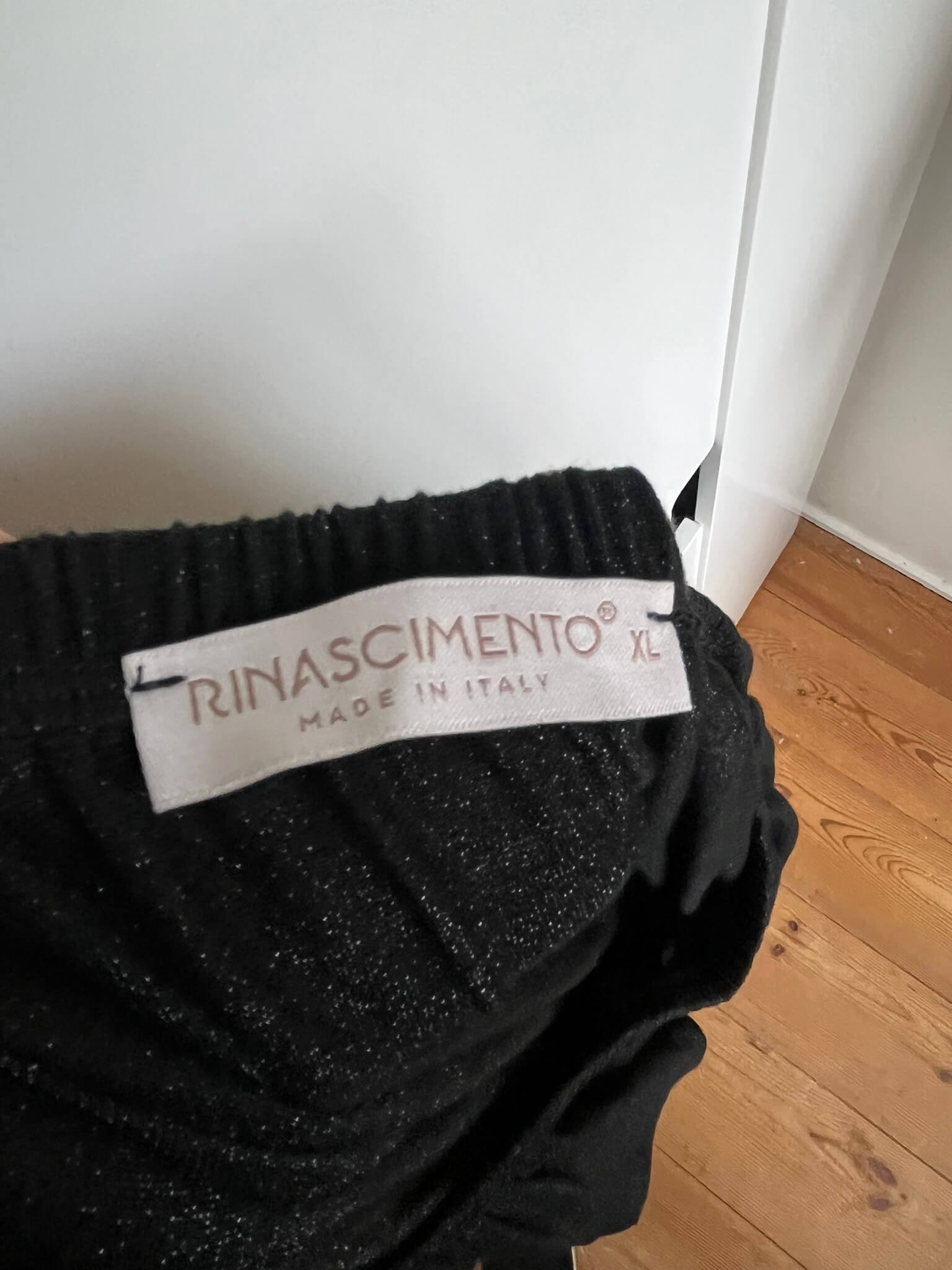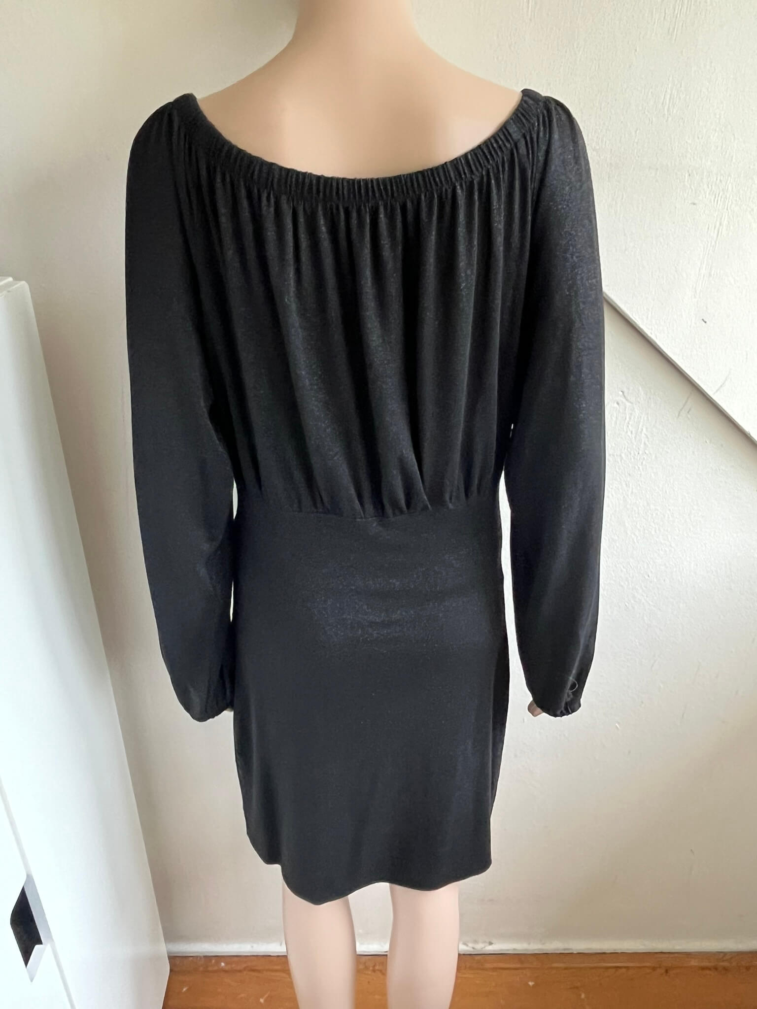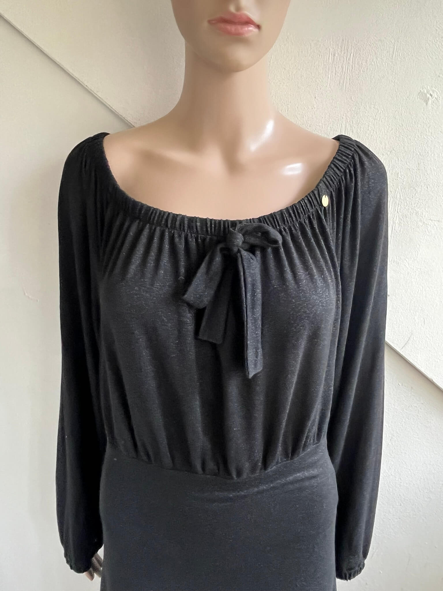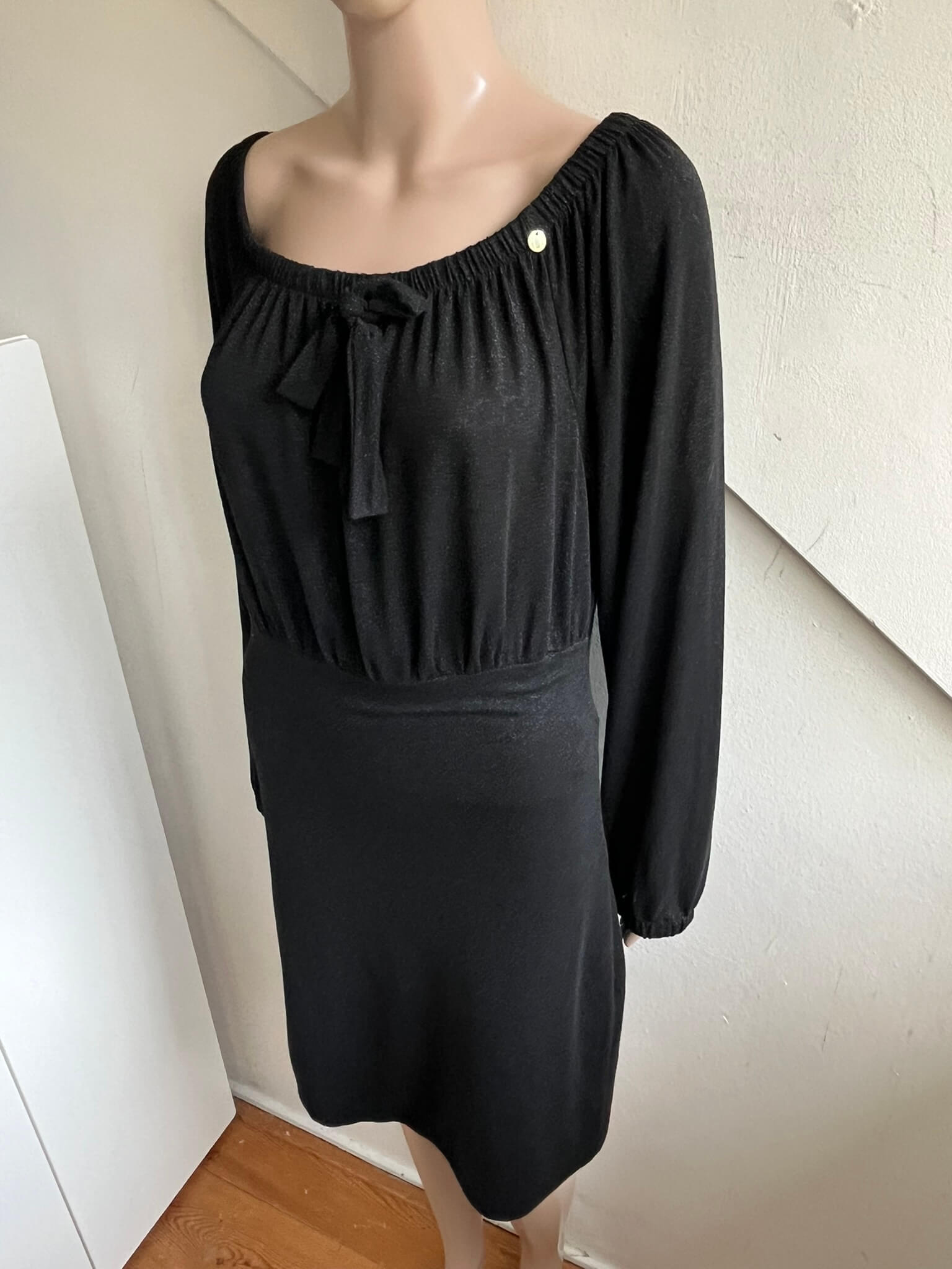 Zwarte jurk met een brede halslijn en zilverkleurige “glitter”over de gehele jurk in de maat 40. In het label staat maat XL, maar valt bij dit merk altijd wat kleiner uit. Oksellengte 50 cm en lengte 93 cm.