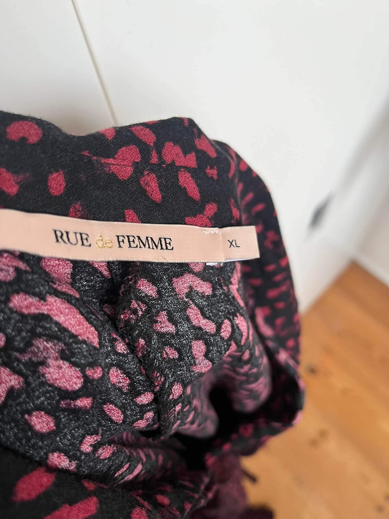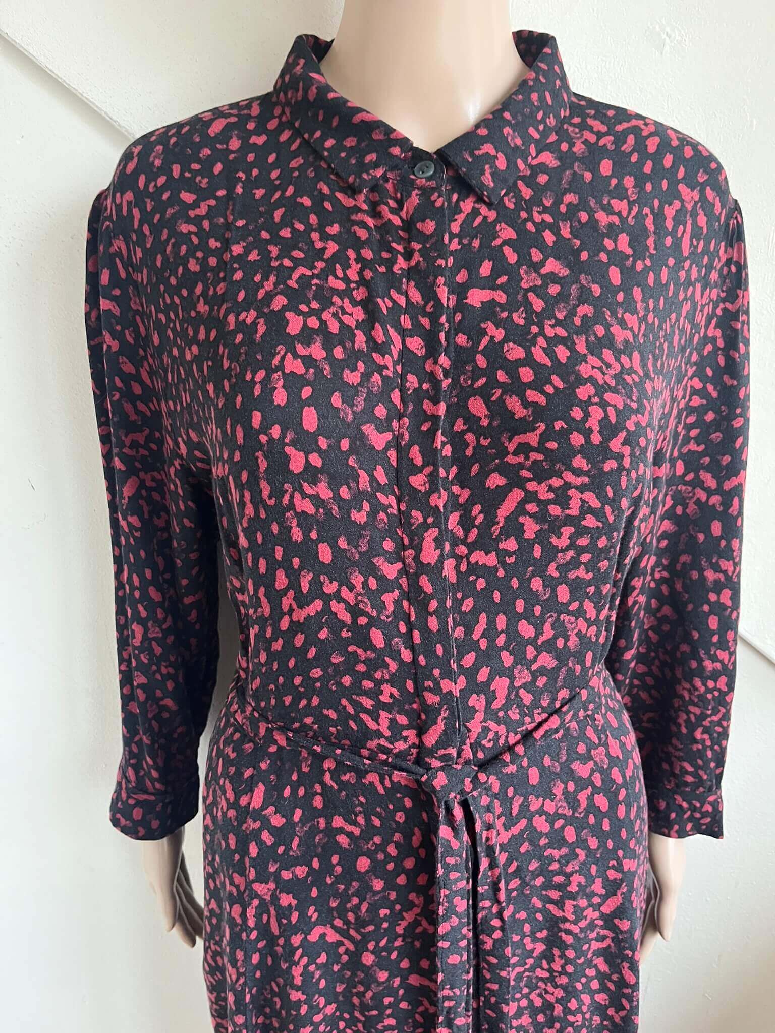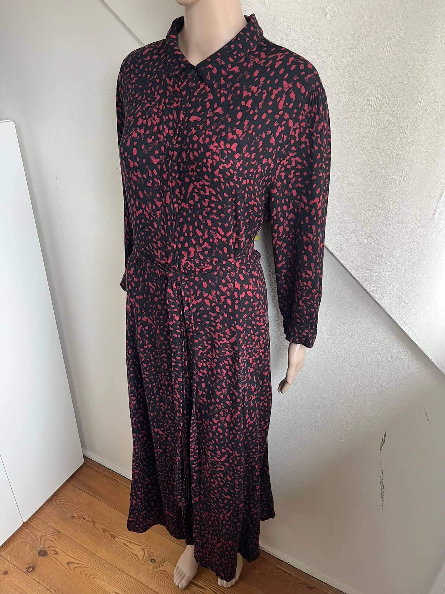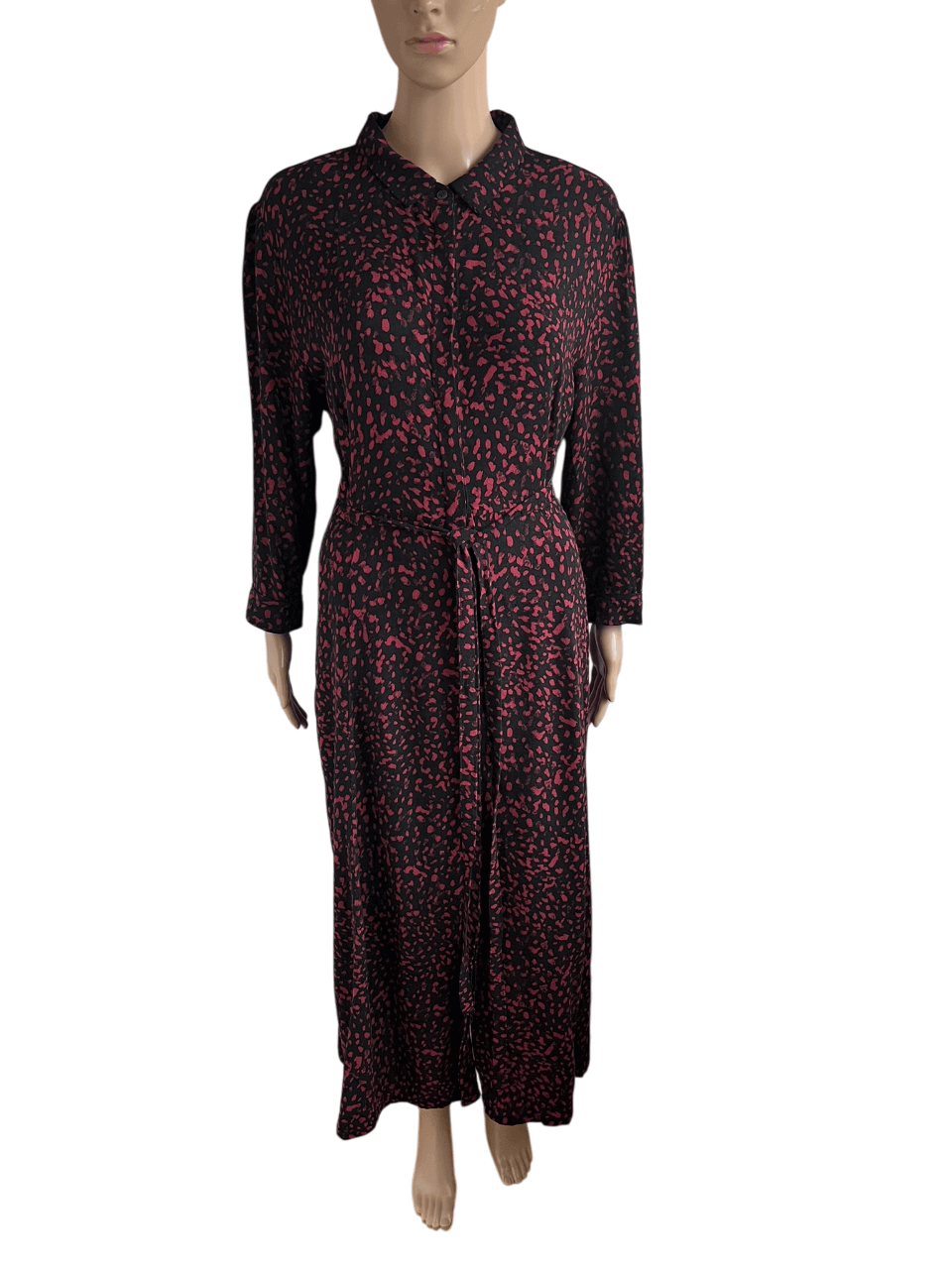 Zwarte lange doorknoopjurk met rode print en een riem in de maat XL 44. Oksellengte 56 cm en lengte 126 cm.